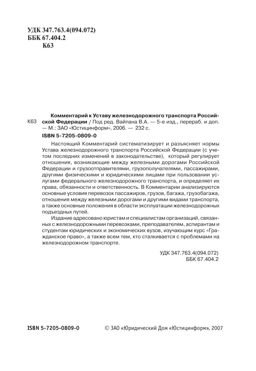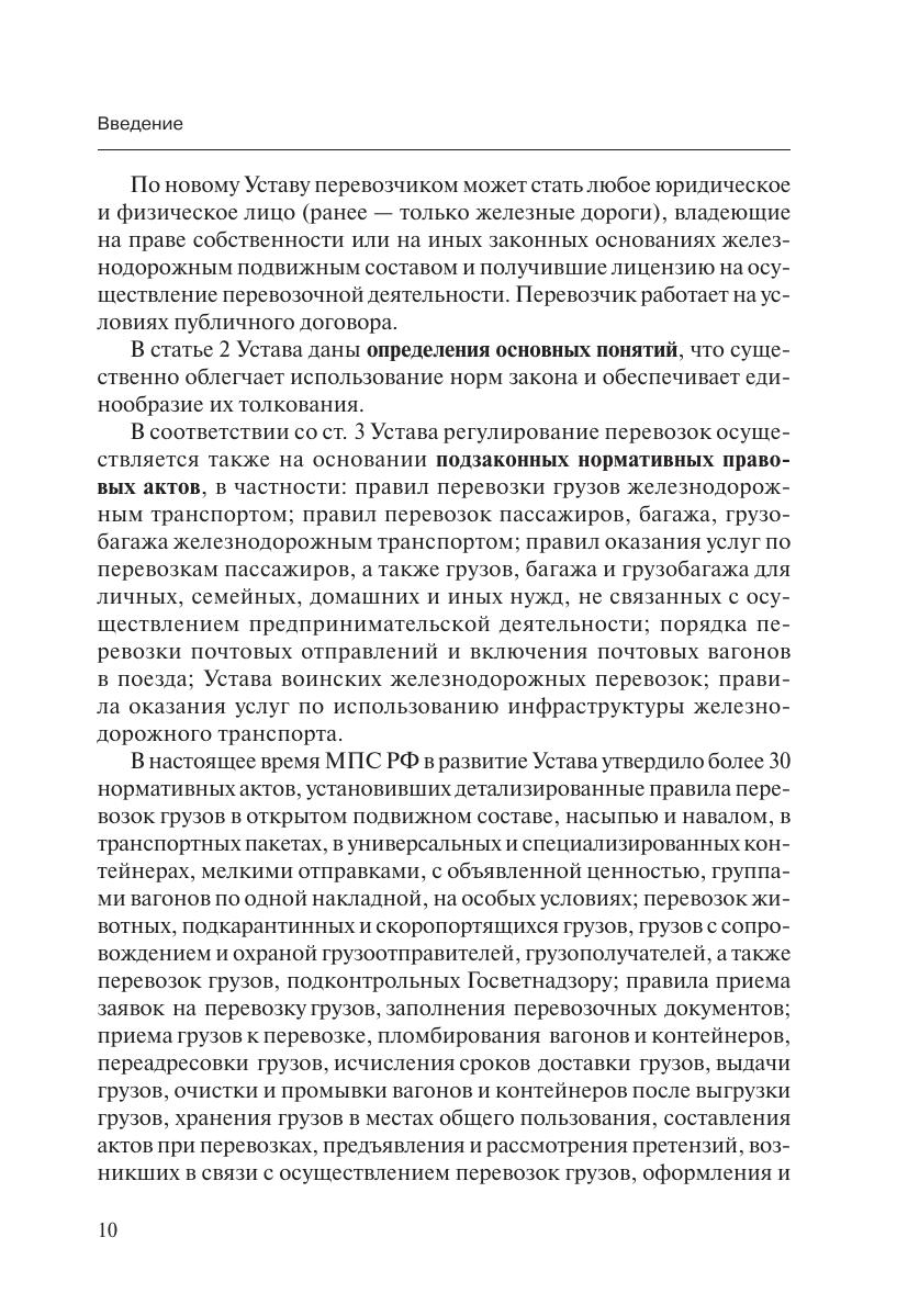 Настоящий Комментарий систематизирует и разъясняет нормы Устава железнодорожного транспорта Российской Федерации (с учетом последних изменений в законодательстве), который регулирует отношения, возникающие между железными дорогами Российской Федерации и грузоотправителями, грузополучателями, пассажирами, другими физическими и юридическими лицами при пользовании услугами федерального железнодорожного транспорта, и определяет их права, обязанности и ответственность. В Комментарии анализируются основные условия перевозок пассажиров, грузов, багажа, грузобагажа, отношения между железными дорогами и другими видами транспорта, а также основные положения в области эксплуатации железнодорожных подъездных путей.Издание адресовано юристам и специалистам организаций, связанных с железнодорожными перевозками, преподавателям, аспирантам и студентам юридических и экономических вузов, изучающим курс «Гражданское право», а также всем тем, кто сталкивается с проблемами на железнодорожном транспорте.