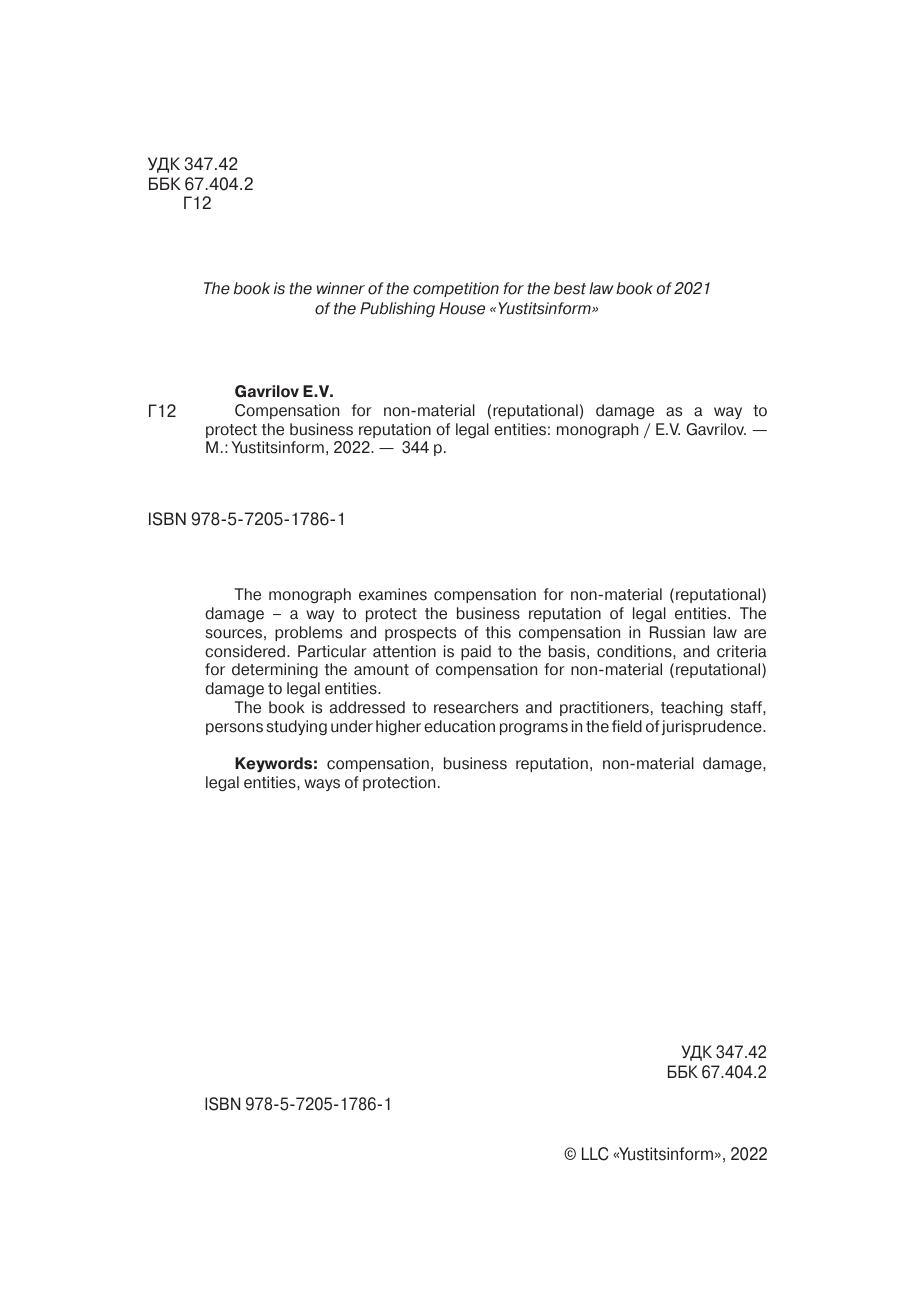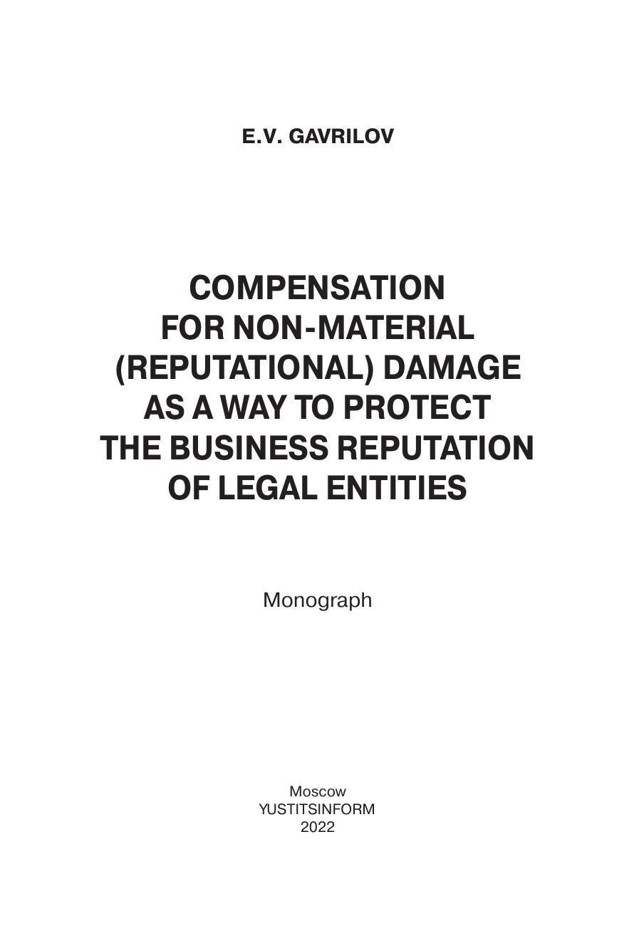 В монографии исследуется компенсация нематериального (репутационного) вреда – способ защиты деловой репутации юридических лиц. Рассмотрены источники, проблемы и перспективы указанной компенсации в российском праве. Особое внимание уделено основанию, условиям, критериям определения размера компенсации нематериального (репутационного) вреда юридическим лицам.