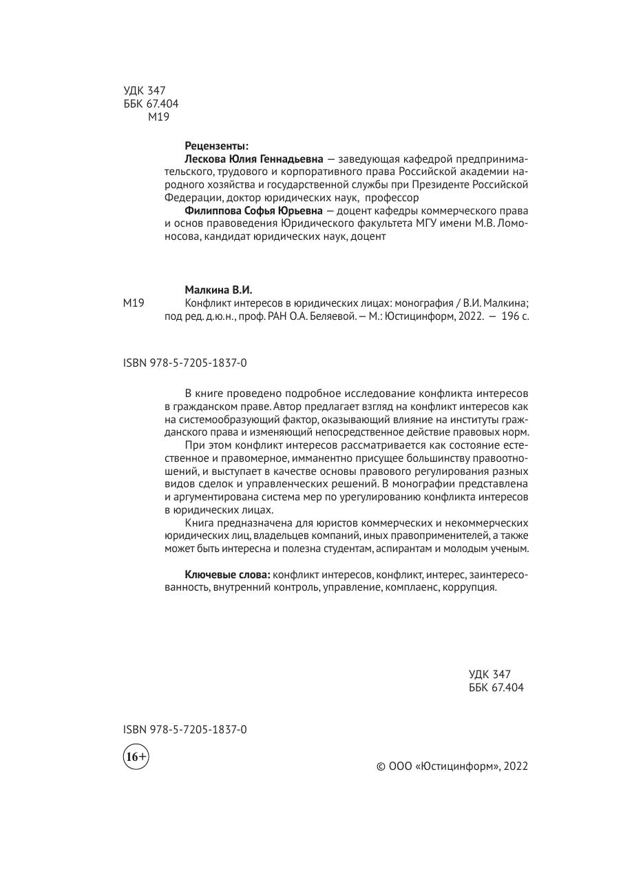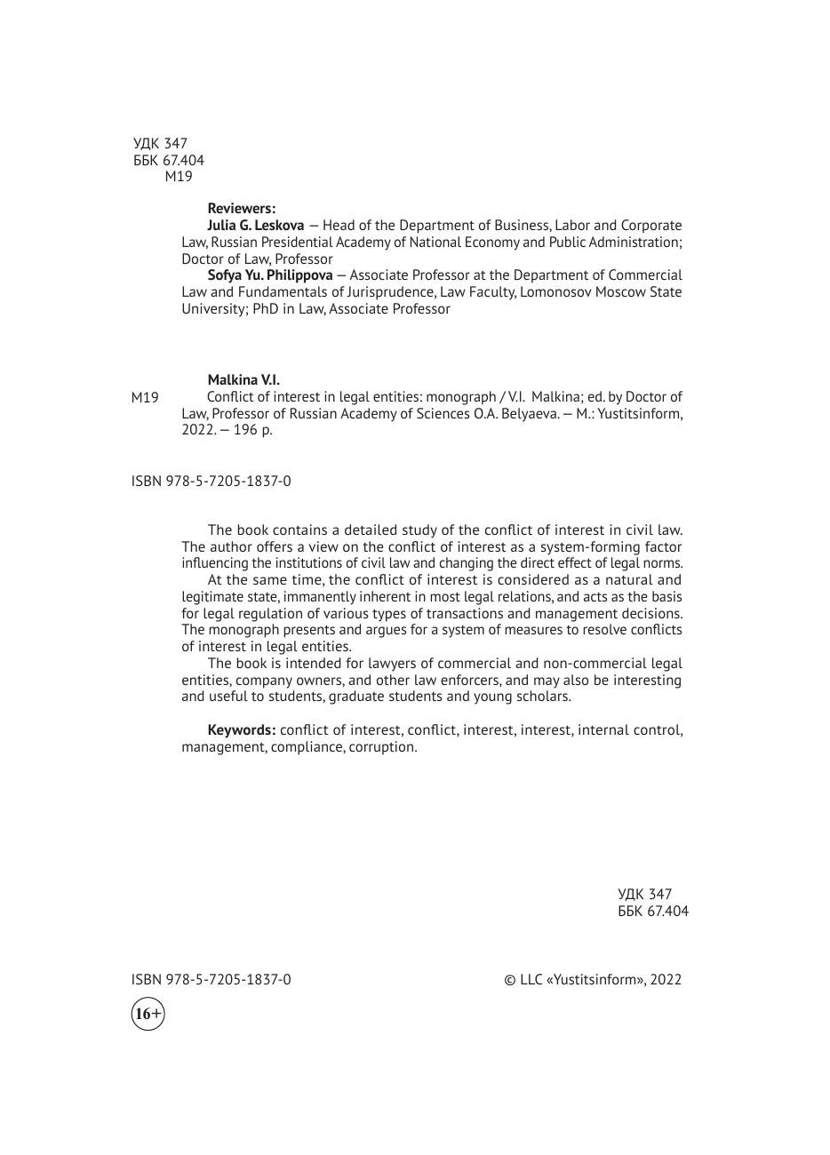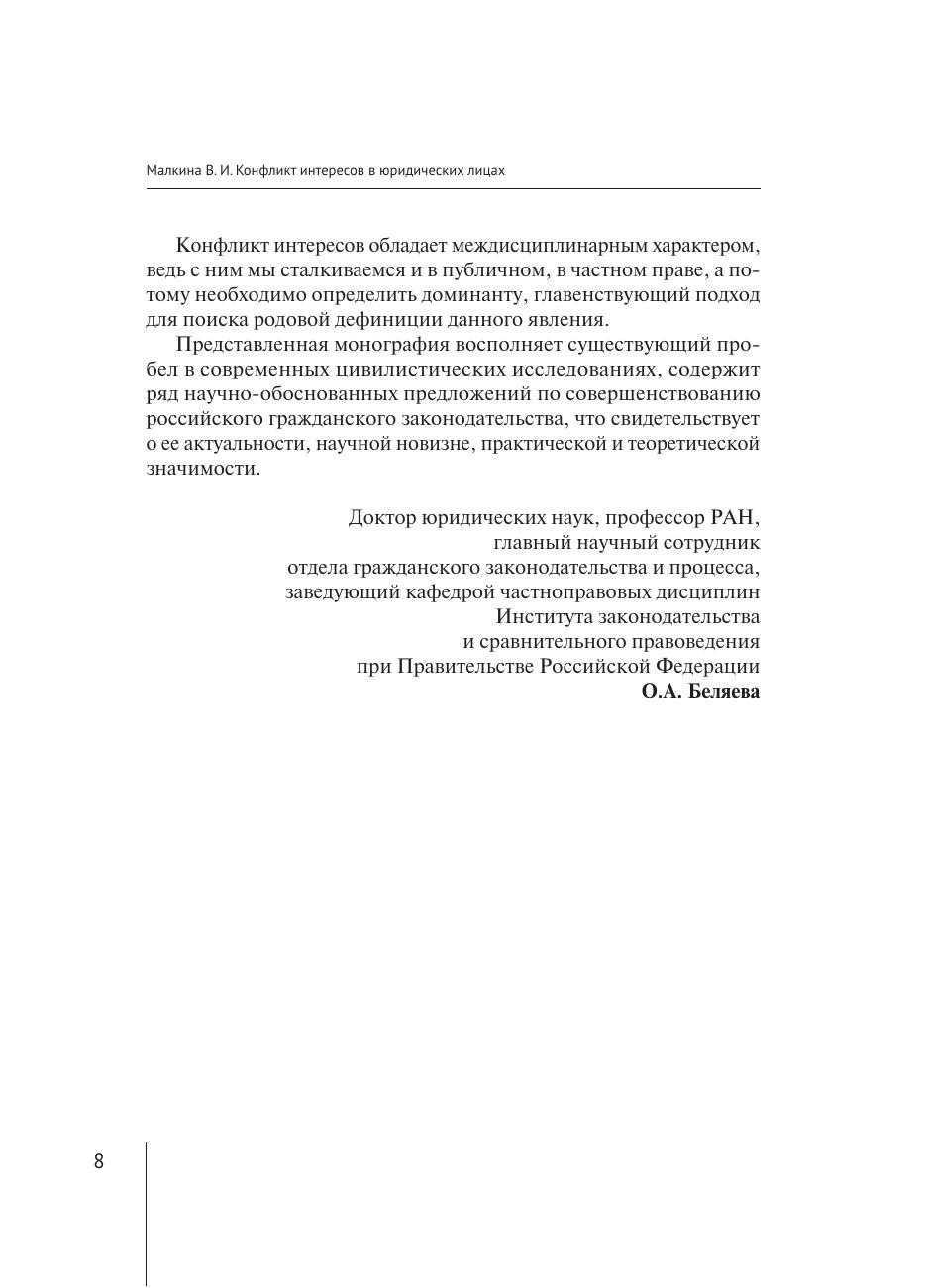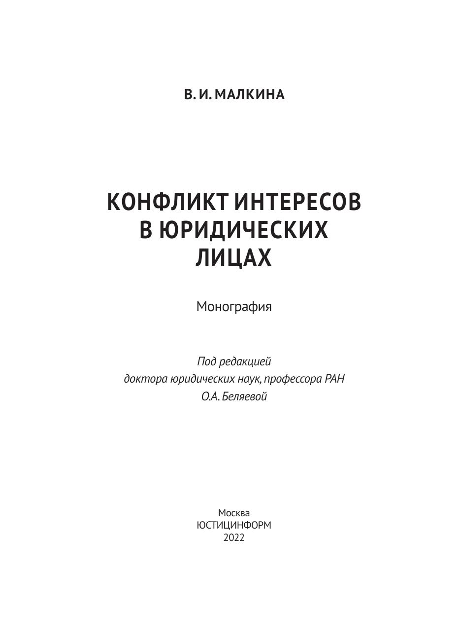 При этом конфликт интересов рассматривается как состояние есте ственное и правомерное, имманентно присущее большинству правоотно шений, и выступает в качестве основы правового регулирования разных видов сделок и управленческих решений. В монографии представлена и аргументирована система мер по урегулированию конфликта интересов в юридических лицах.