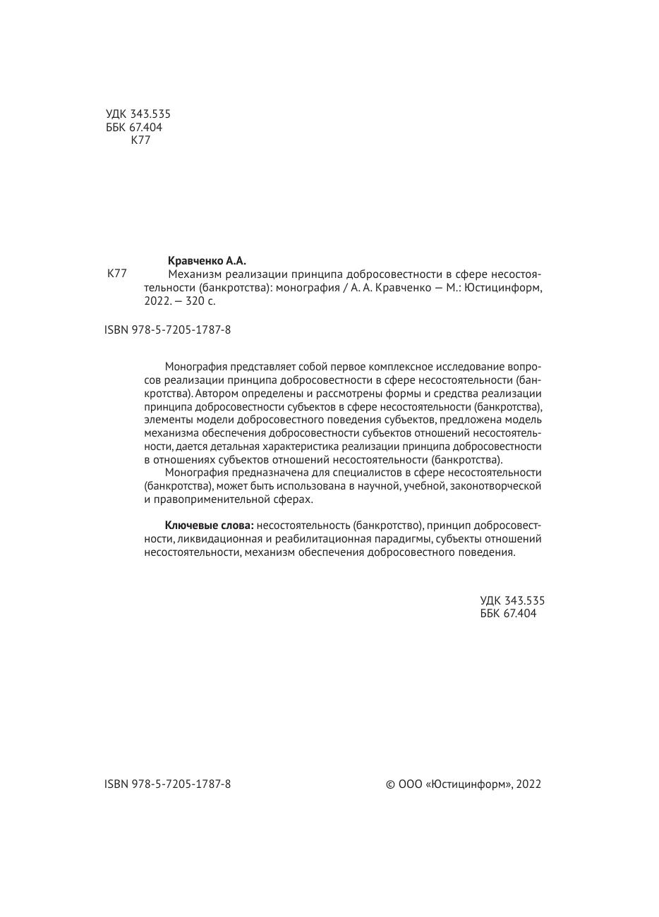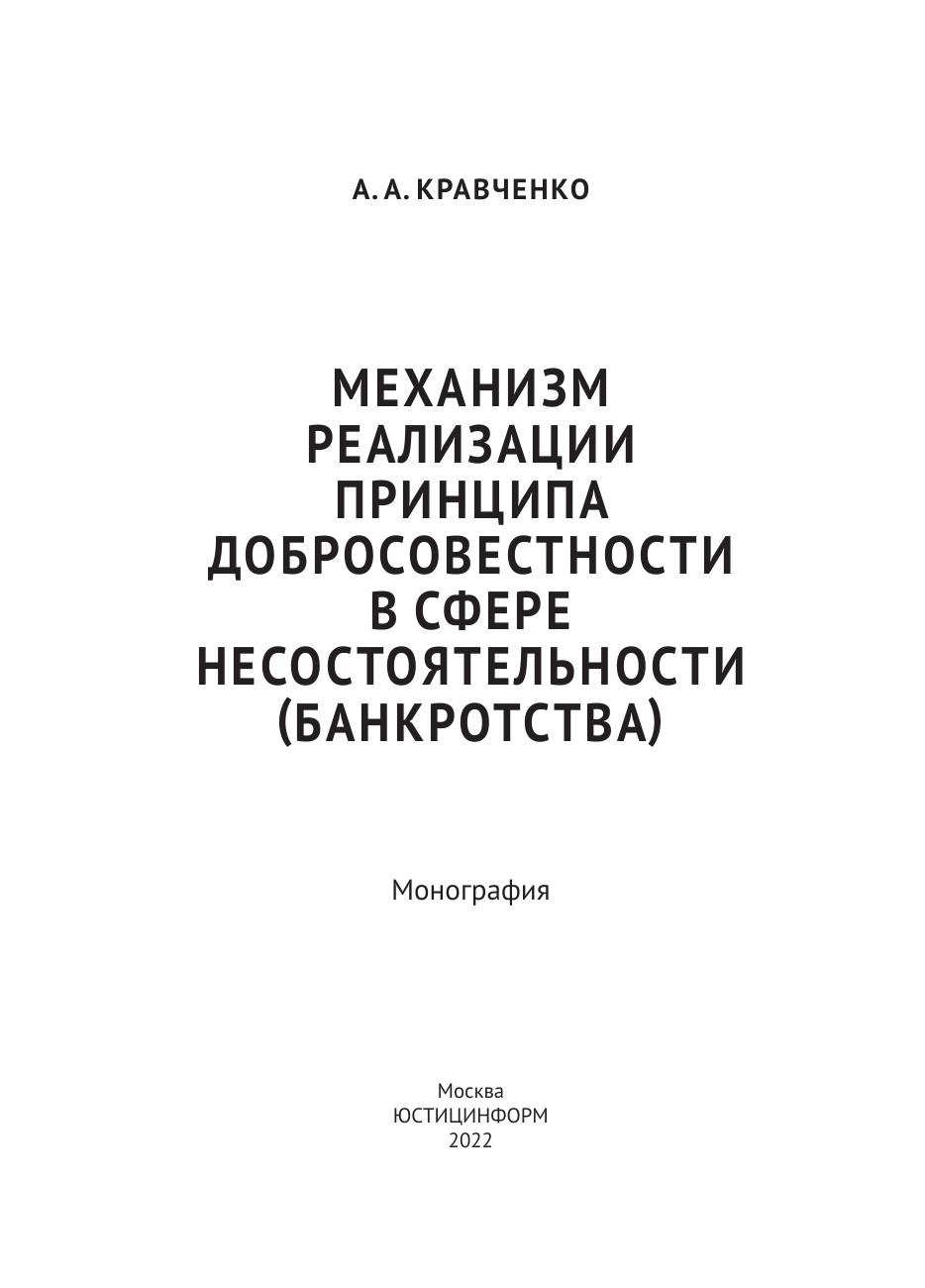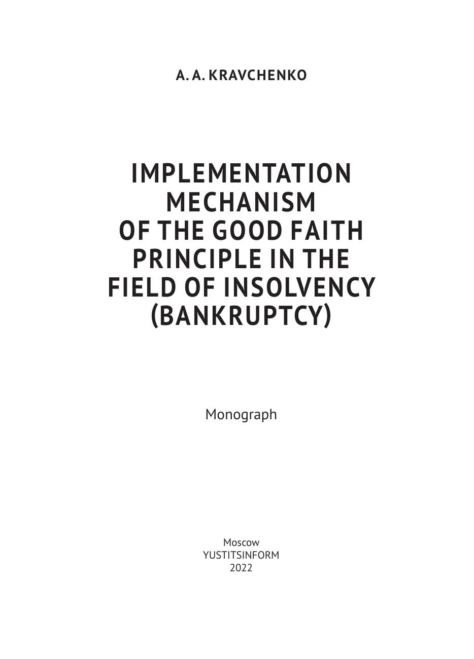 Монография представляет собой первое комплексное исследование вопросов реализации принципа добросовестности в сфере несостоятельности (банкротства). Автором определены и рассмотрены формы и средства реализации принципа добросовестности субъектов в сфере несостоятельности (банкротства), элементы модели добросовестного поведения субъектов, предложена модель механизма обеспечения добросовестности субъектов отношений несостоятельности, дается детальная характеристика реализации принципа добросовестности в отношениях субъектов отношений несостоятельности (банкротства). Монография предназначена для специалистов в сфере несостоятельности (банкротства), может быть использована в научной, учебной, законотворческой и правоприменительной сферах.