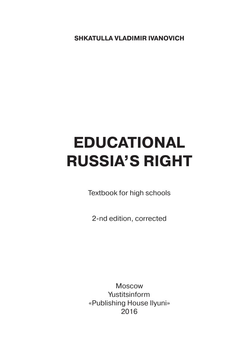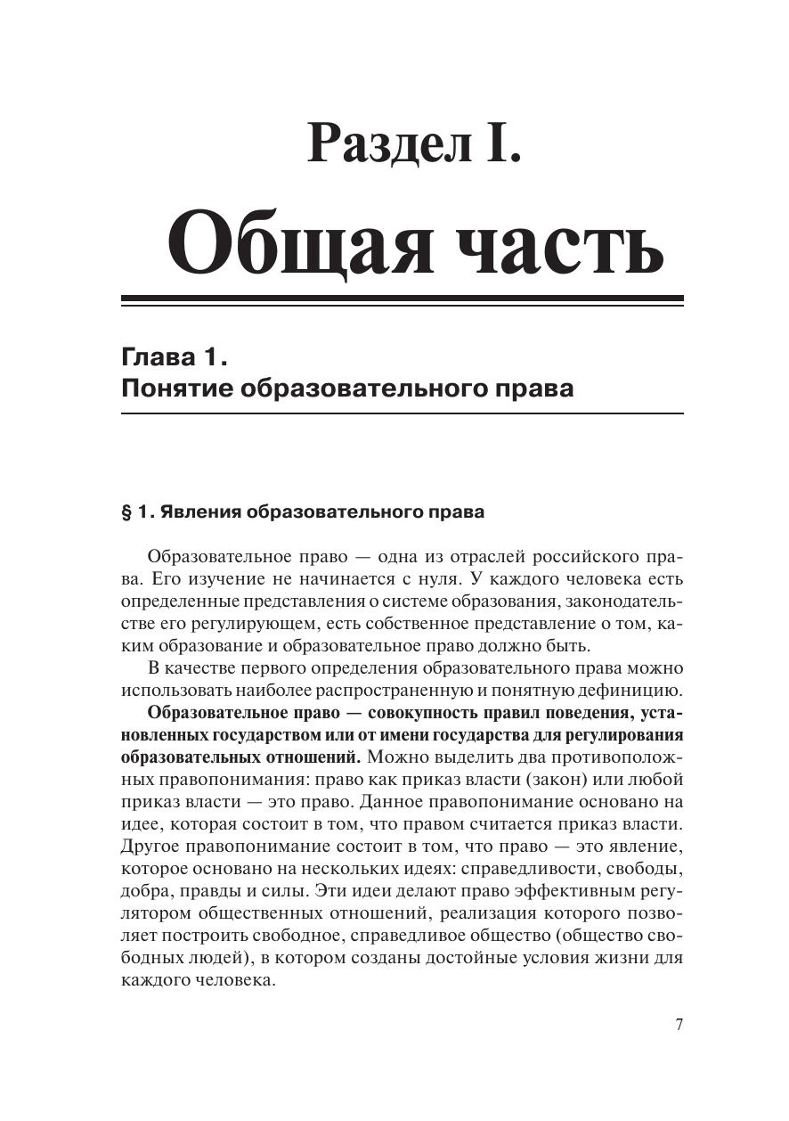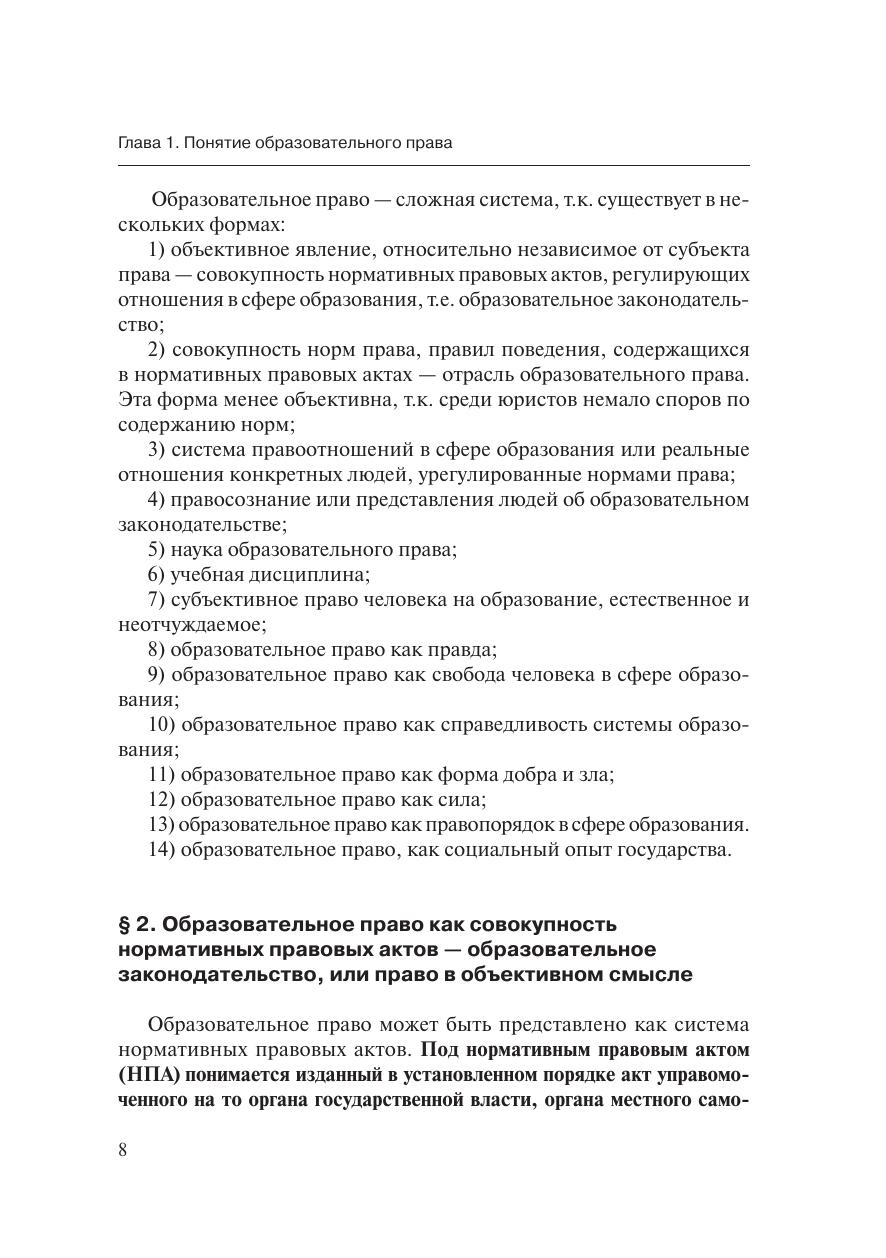В учебнике изложен курс образовательного права. Образование является основой развития общества. В 2013 году страна перешла на четвертую модель системы образования. Первая модель существовала до 1917 года — образование в Российской империи. Вторая модель — образование в Советской России. Третья модель образования Российского государства существовала с 1992 до 2013 года.