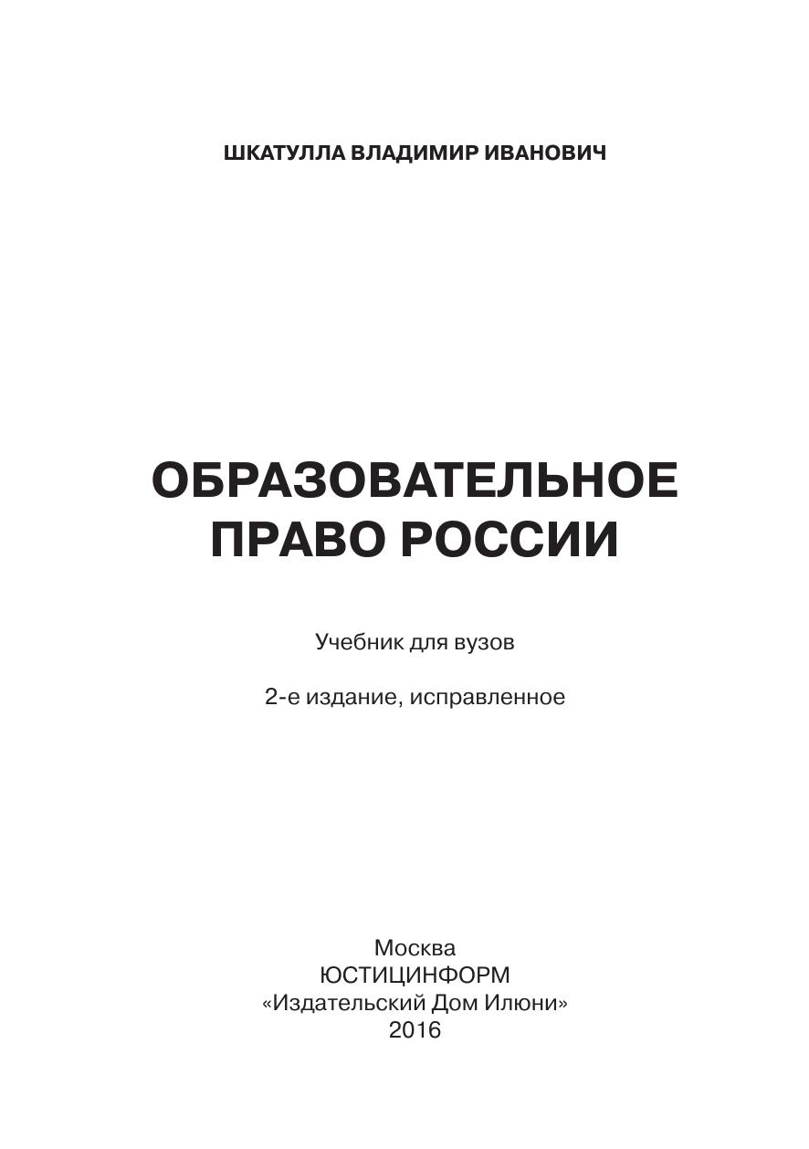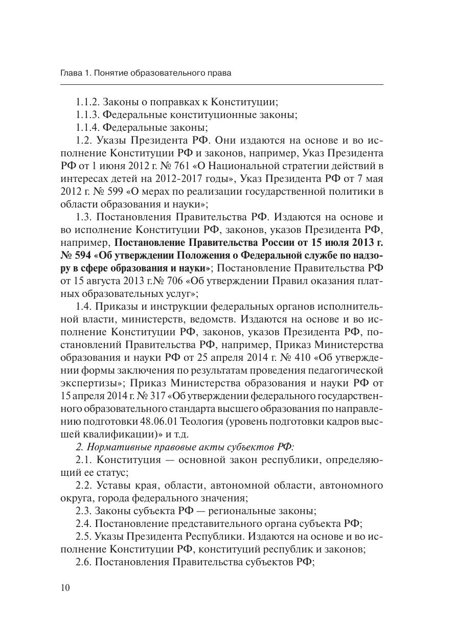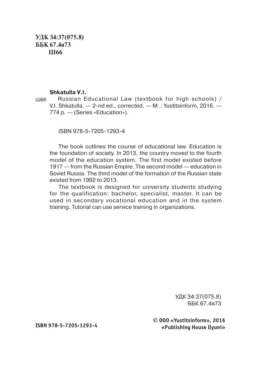 В учебнике изложен курс образовательного права. Образование является основой развития общества. В 2013 году страна перешла на четвертую модель системы образования. Первая модель существовала до 1917 года — образование в Российской империи. Вторая модель — образование в Советской России. Третья модель образования Российского государства существовала с 1992 до 2013 года.