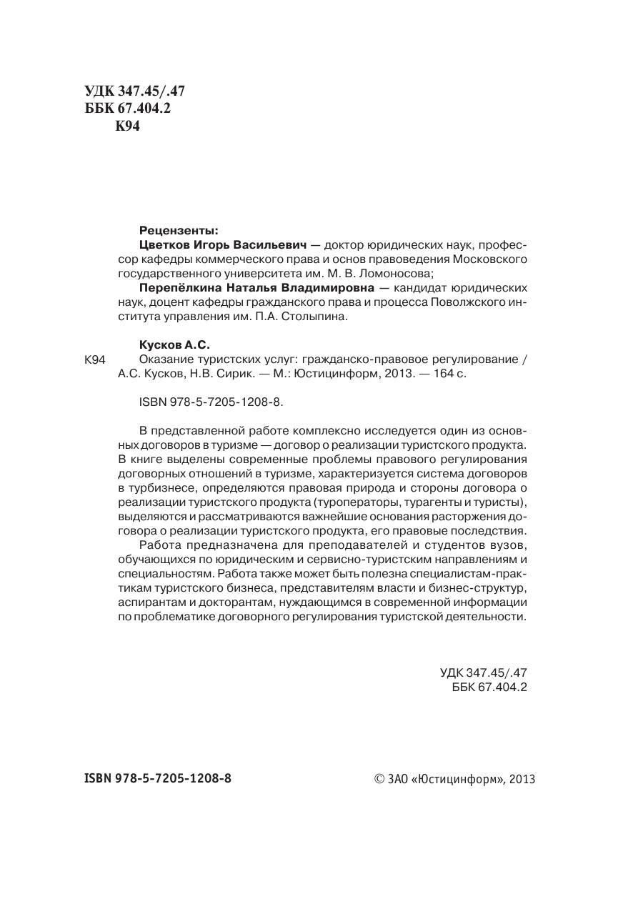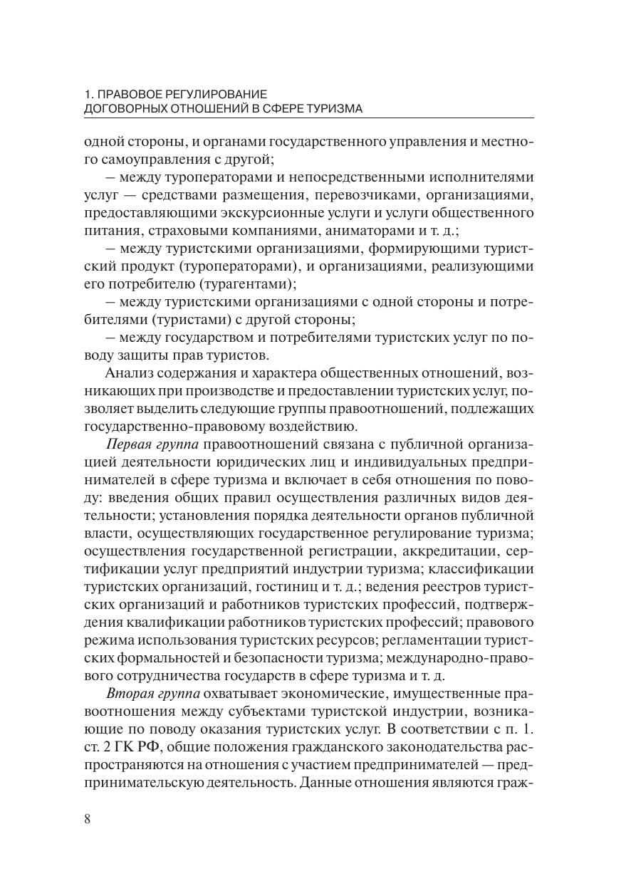 В представленной работе комплексно исследуется один из основ-ных договоров в туризме — договор о реализации туристского продукта.В книге выделены современные проблемы правового регулированиядоговорных отношений в туризме, характеризуется система договоровв турбизнесе, определяются правовая природа и стороны договора ореализации туристского продукта (туроператоры, турагенты и туристы),выделяются и рассматриваются важнейшие основания расторжения до-говора о реализации туристского продукта, его правовые последствия.Работа предназначена для преподавателей и студентов вузов,обучающихся по юридическим и сервисно-туристским направлениям испециальностям. Работа также может быть полезна специалистам-прак-тикам туристского бизнеса, представителям власти и бизнес-структур,аспирантам и докторантам, нуждающимся в современной информациипо проблематике договорного регулирования туристской деятельности