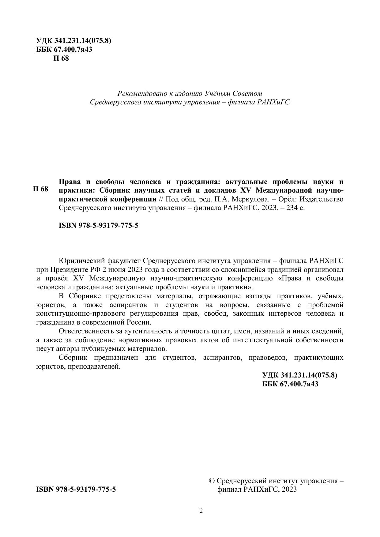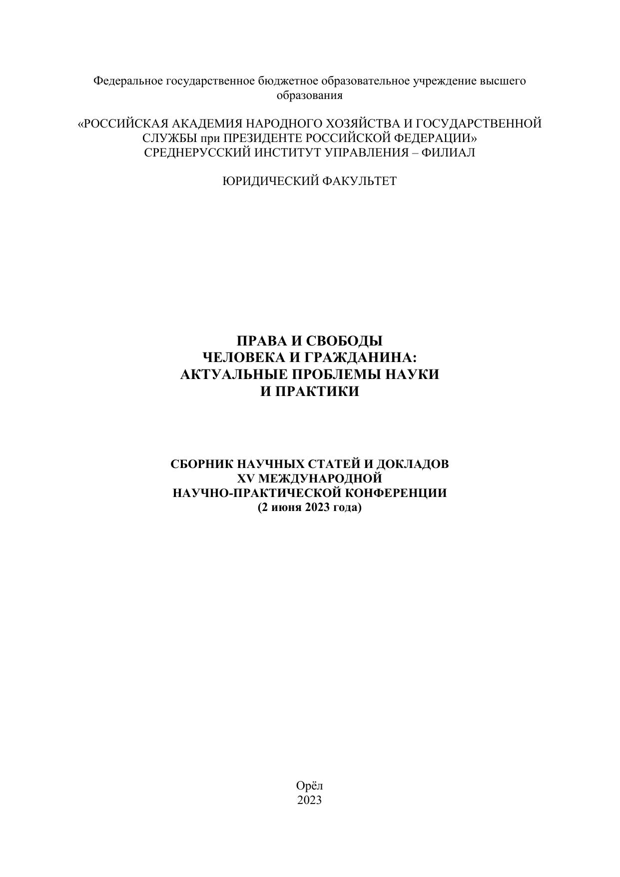 Юридический факультет Среднерусского института управления – филиала РАНХиГС при Президенте РФ 2 июня 2023 года в соответствии со сложившейся традицией организовал и провёл XV Международную научно-практическую конференцию «Права и свободы человека и гражданина: актуальные проблемы науки и практики». В Сборнике представлены материалы, отражающие взгляды практиков, учёных, юристов, а также аспирантов и студентов на вопросы, связанные с проблемой конституционно-правового регулирования прав, свобод, законных интересов человека и гражданина в современной России. Ответственность за аутентичность и точность цитат, имен, названий и иных сведений, а также за соблюдение нормативных правовых актов об интеллектуальной собственности несут авторы публикуемых материалов. Сборник предназначен для студентов, аспирантов, правоведов, практикующих юристов, преподавателей.