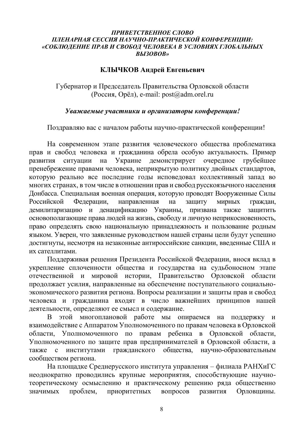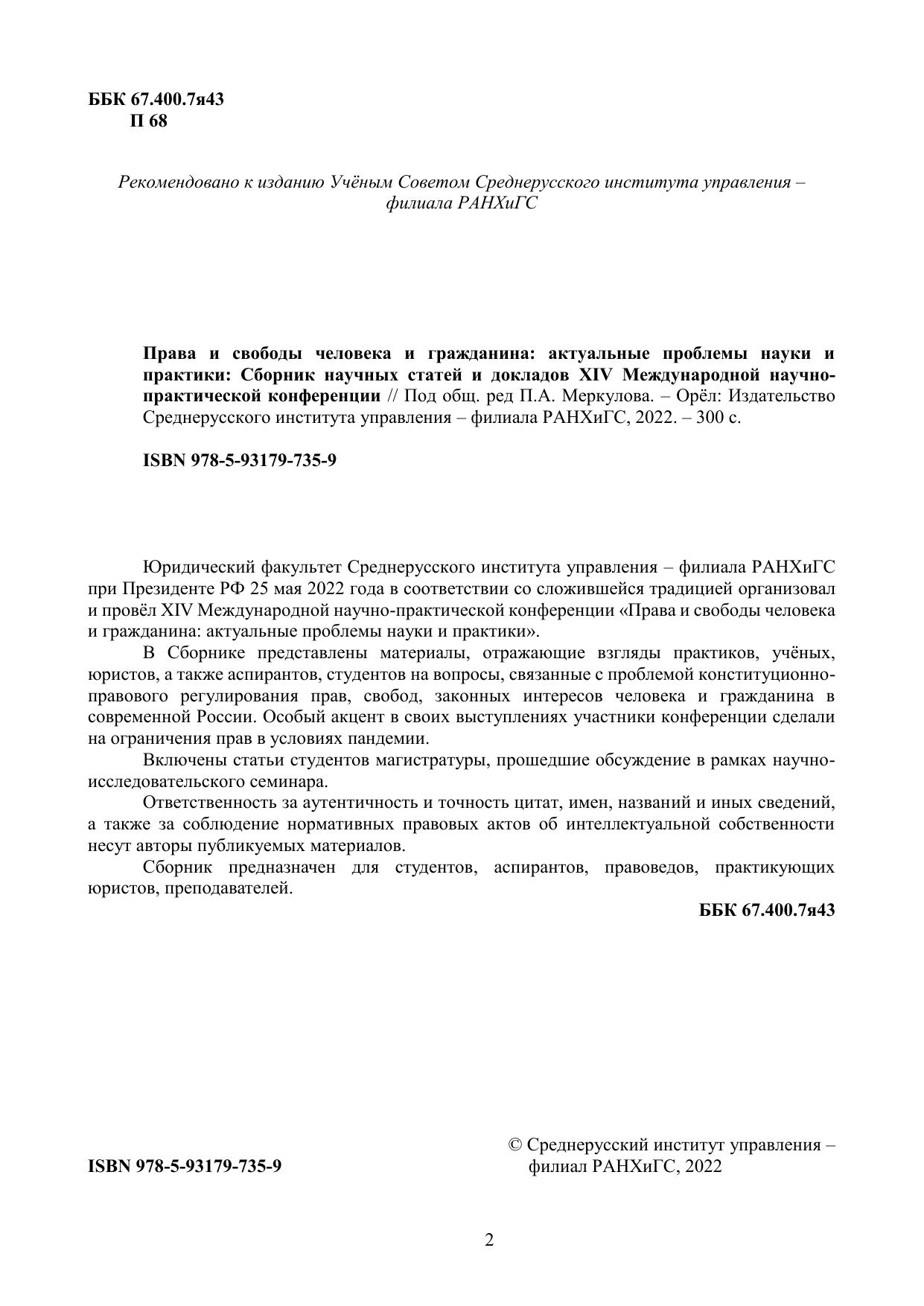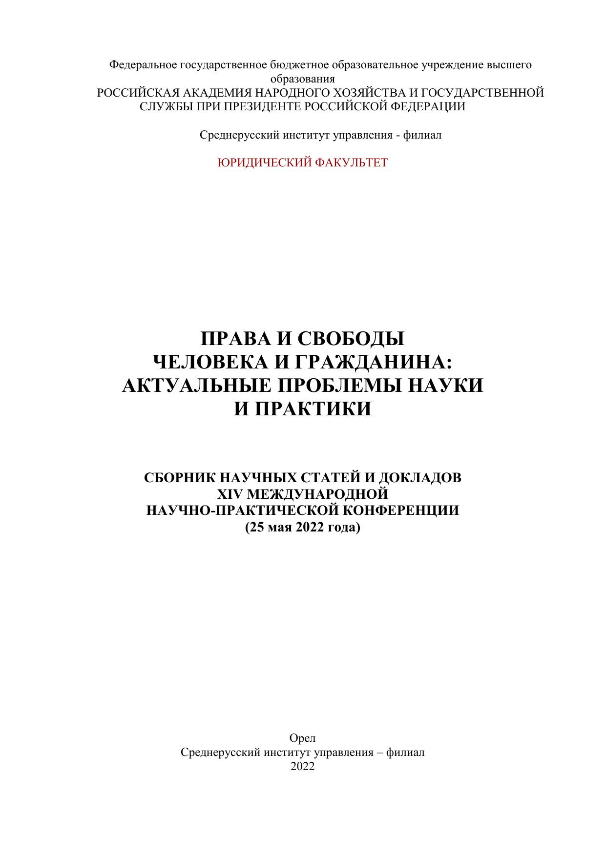Юридический факультет Среднерусского института управления – филиала РАНХиГС при Президенте РФ 25 мая 2022 года в соответствии со сложившейся традицией организовал и провёл XIV Международной научно-практической конференции «Права и свободы человека и гражданина: актуальные проблемы науки и практики». В Сборнике представлены материалы, отражающие взгляды практиков, учёных, юристов, а также аспирантов, студентов на вопросы, связанные с проблемой конституционноправового регулирования прав, свобод, законных интересов человека и гражданина в современной России. Особый акцент в своих выступлениях участники конференции сделали на ограничения прав в условиях пандемии. Включены статьи студентов магистратуры, прошедшие обсуждение в рамках научноисследовательского семинара. Ответственность за аутентичность и точность цитат, имен, названий и иных сведений, а также за соблюдение нормативных правовых актов об интеллектуальной собственности несут авторы публикуемых материалов. Сборник предназначен для студентов, аспирантов, правоведов, практикующих юристов, преподавателей.