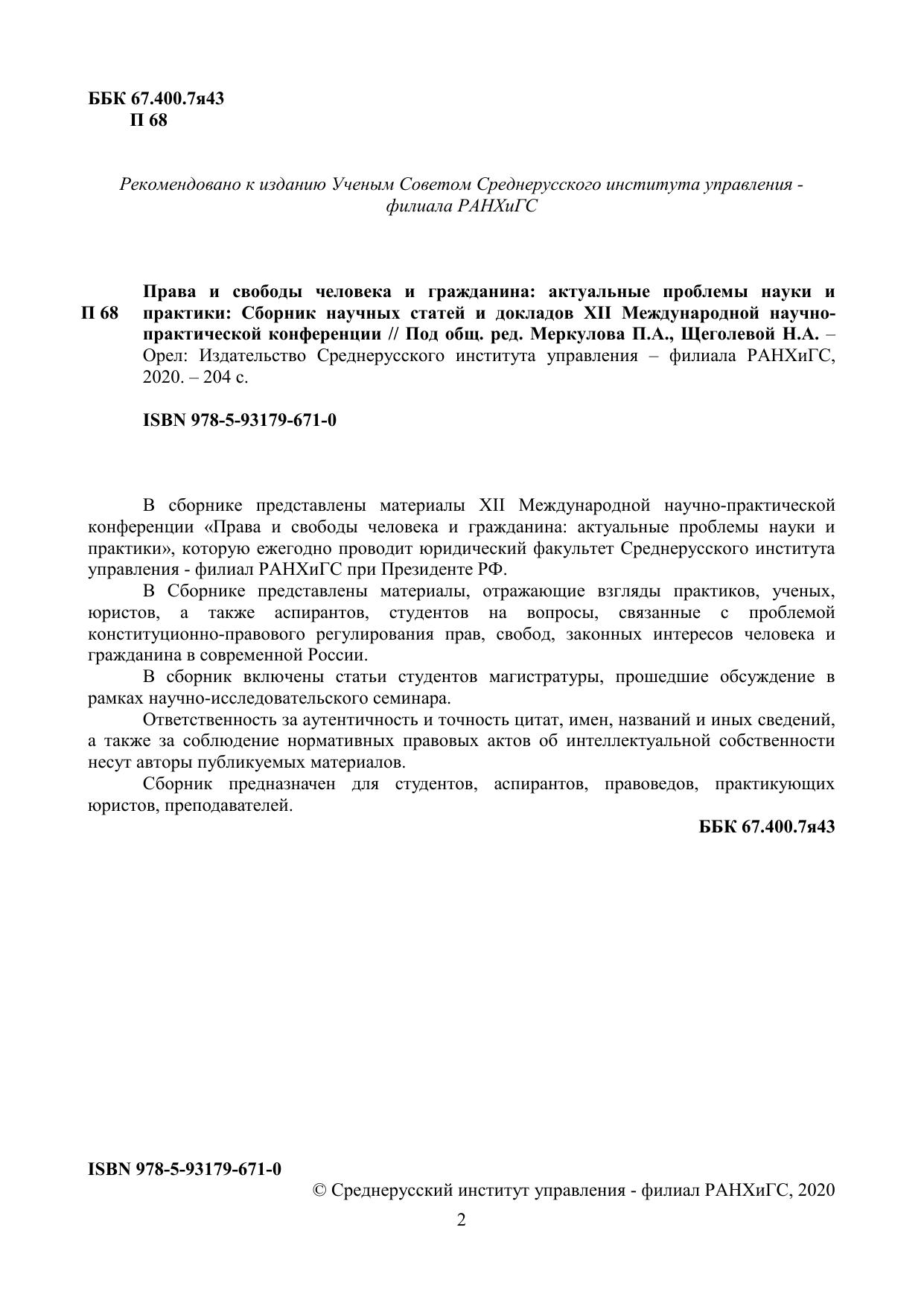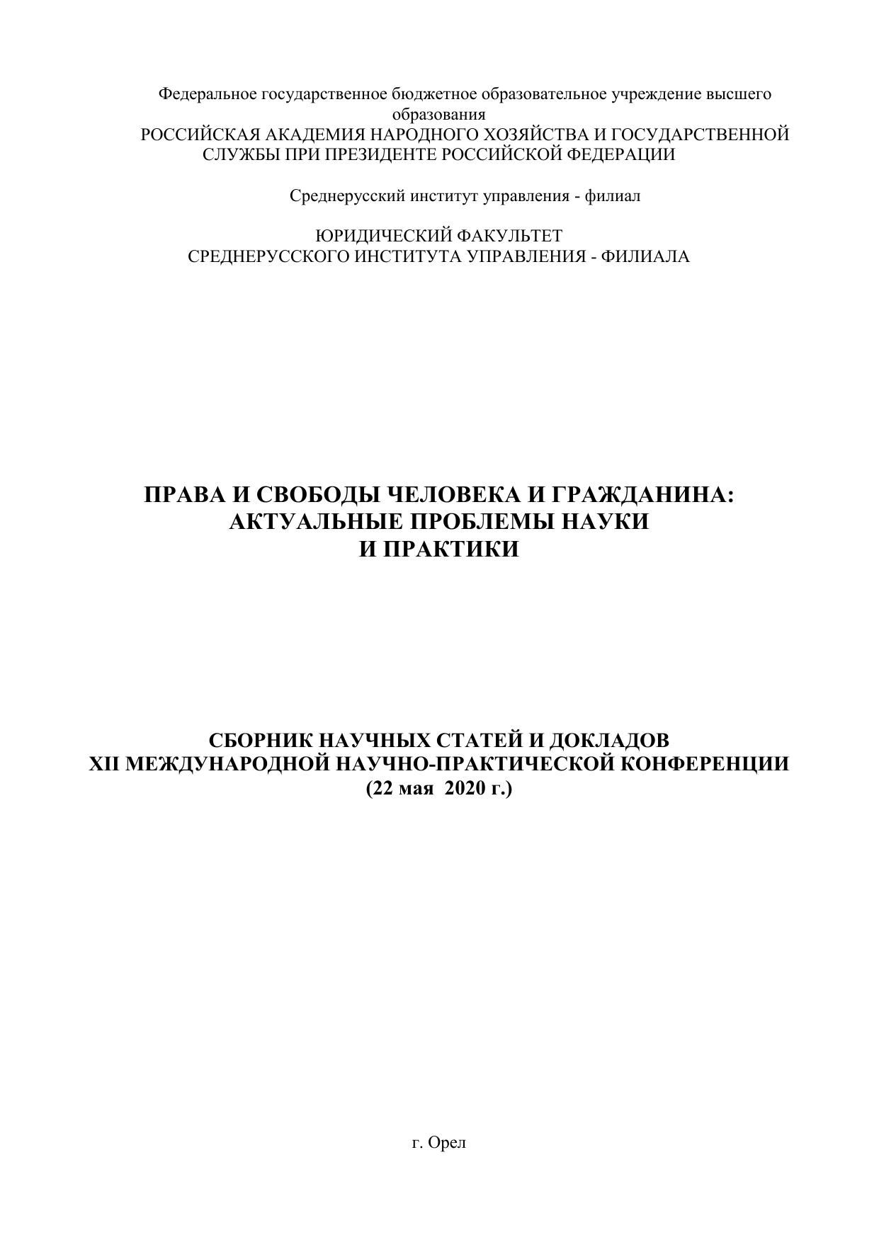В сборнике представлены материалы ХII Международной научно-практической конференции «Права и свободы человека и гражданина: актуальные проблемы науки и практики», которую ежегодно проводит юридический факультет Среднерусского института управления - филиал РАНХиГС при Президенте РФ. В Сборнике представлены материалы, отражающие взгляды практиков, ученых, юристов, а также аспирантов, студентов на вопросы, связанные с проблемой конституционно-правового регулирования прав, свобод, законных интересов человека и гражданина в современной России. В сборник включены статьи студентов магистратуры, прошедшие обсуждение в рамках научно-исследовательского семинара. Ответственность за аутентичность и точность цитат, имен, названий и иных сведений, а также за соблюдение нормативных правовых актов об интеллектуальной собственности несут авторы публикуемых материалов. Сборник предназначен для студентов, аспирантов, правоведов, практикующих юристов, преподавателей.