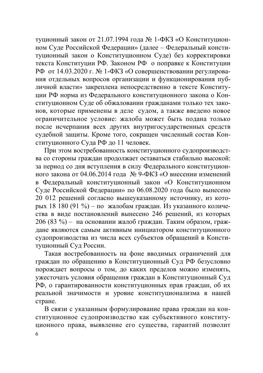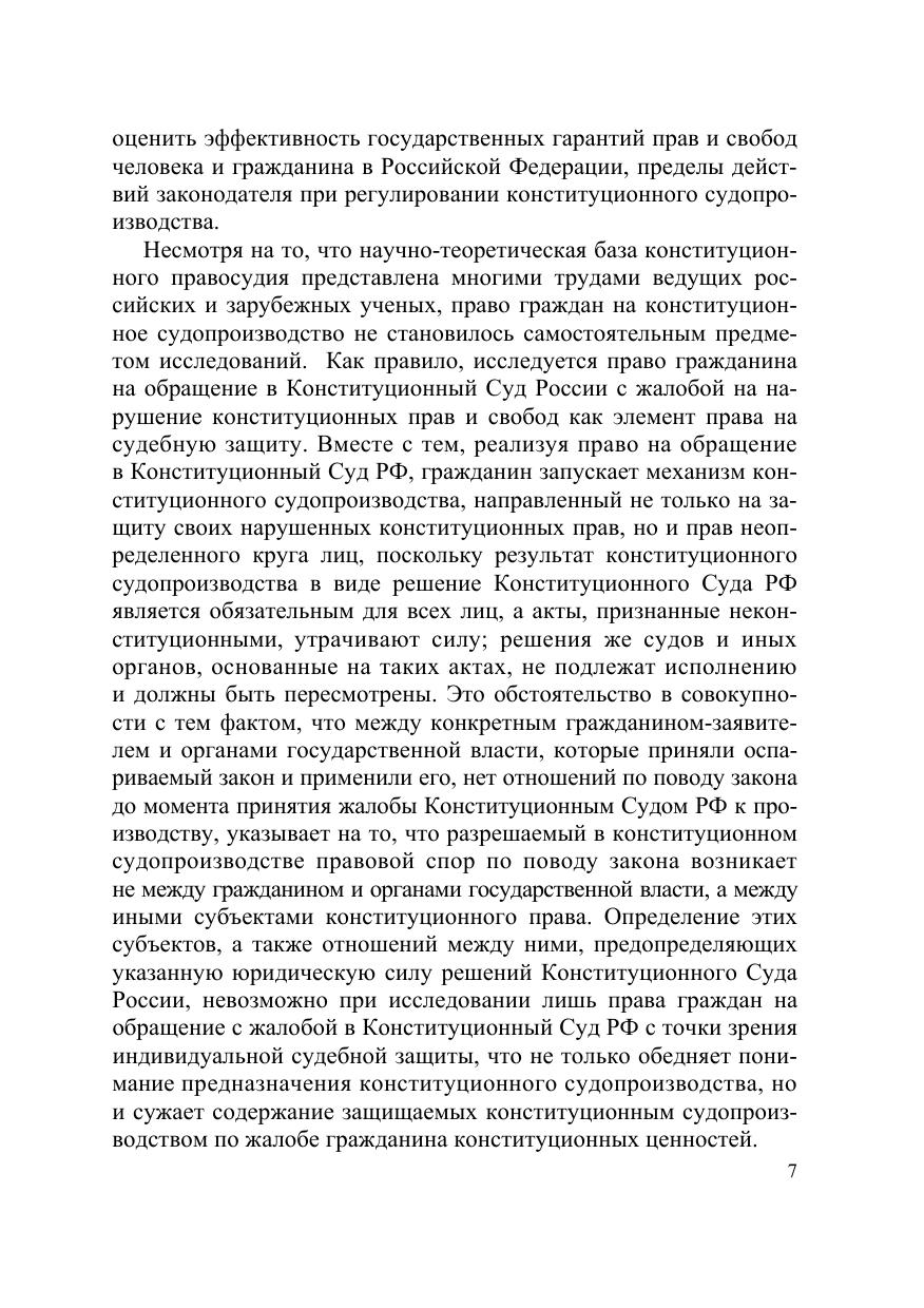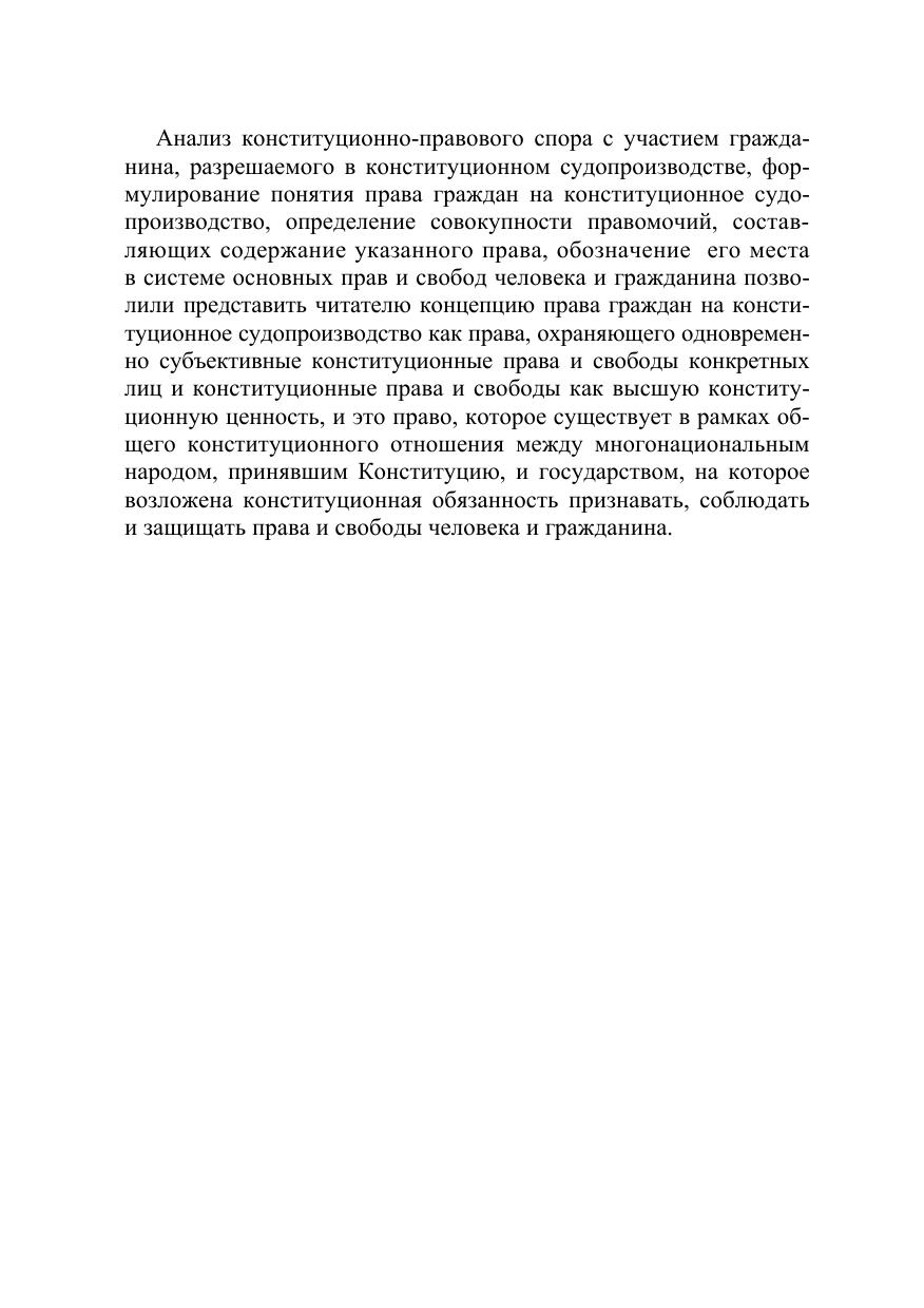 Настоящая монография содержит результаты исследования конституционноправовой сущности права граждан на конституционное судопроизводство и особенностей его реализации гражданами в Российской Федерации. Исследуемое право рассматривается как самостоятельное субъективное право, имеющее свое место в системе действующих прав и свобод, и предназначенное для разрешения конституционно-правовых споров с участием граждан. Исходя из изложенной в работе концепции права граждан на конституционное судопроизводства сформулированы предложения по совершенствованию правового регулирования исследуемого права. Для государственных и муниципальных служащих, депутатов, судей, научных работников, преподавателей, аспирантов и студентов юридических вузов и всех, кто интересуется проблемами конституционного судопроизводства.