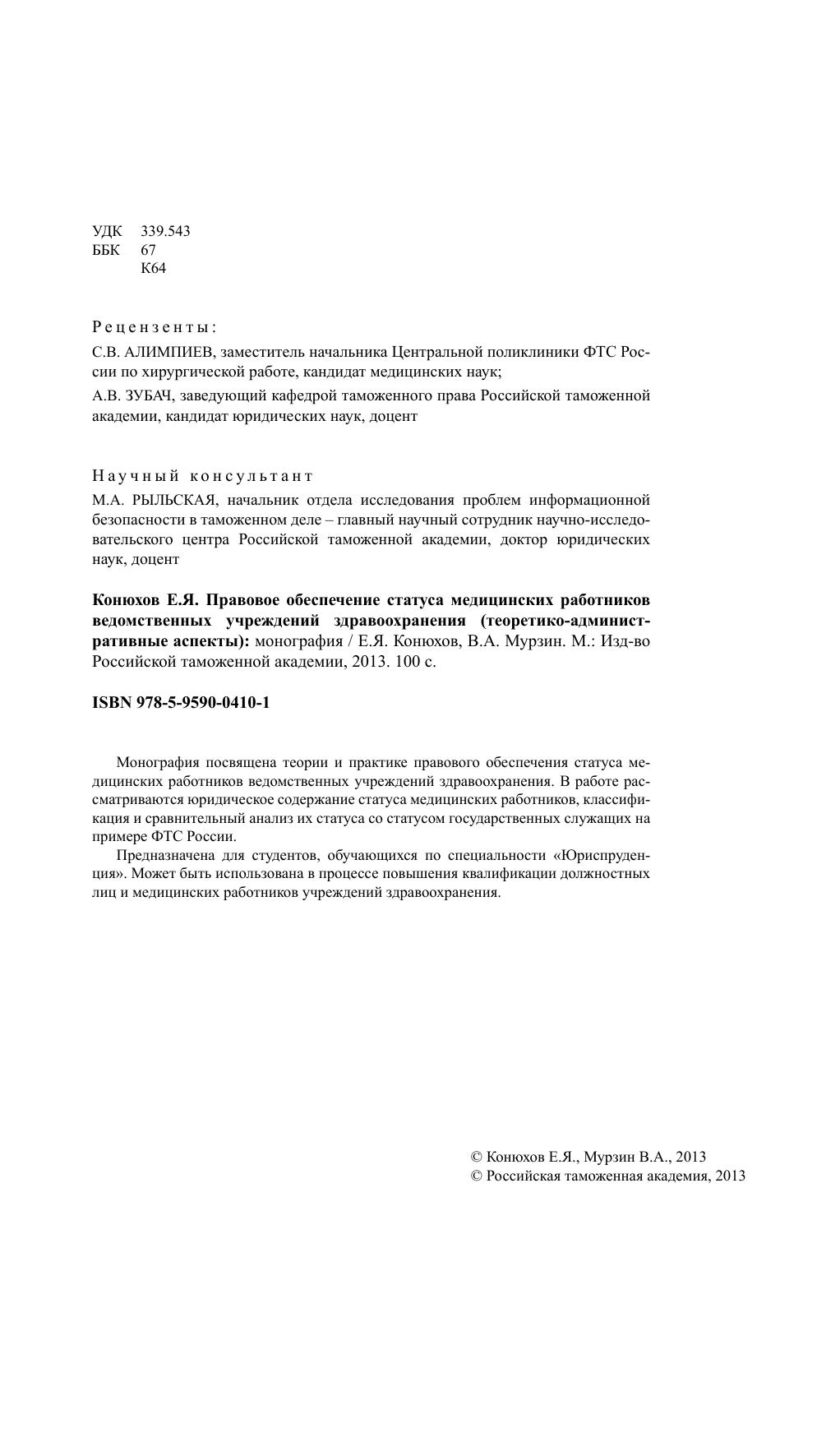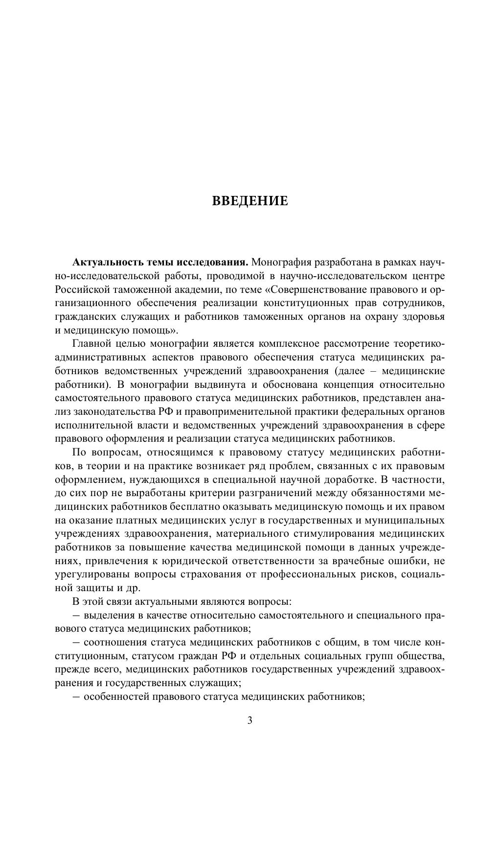 Монография посвящена теории и практике правового обеспечения статуса медицинских работников ведомственных учреждений здравоохранения. В работе рассматриваются юридическое содержание статуса медицинских работников, классификация и сравнительный анализ их статуса со статусом государственных служащих на примере ФТС России. Предназначена для студентов, обучающихся по специальности «Юриспруденция». Может быть использована в процессе повышения квалификации должностных лиц и медицинских работников учреждений здравоохранения.