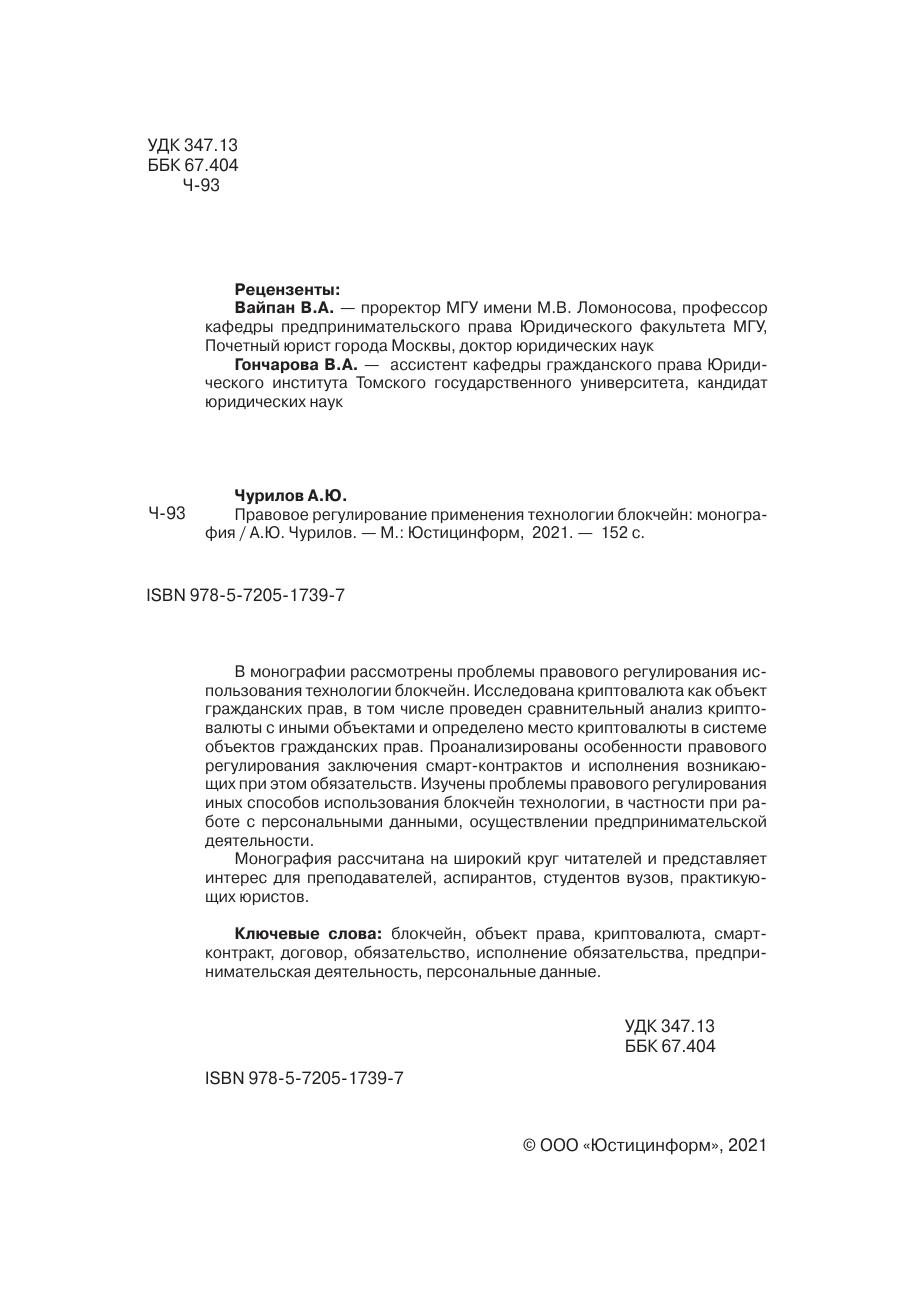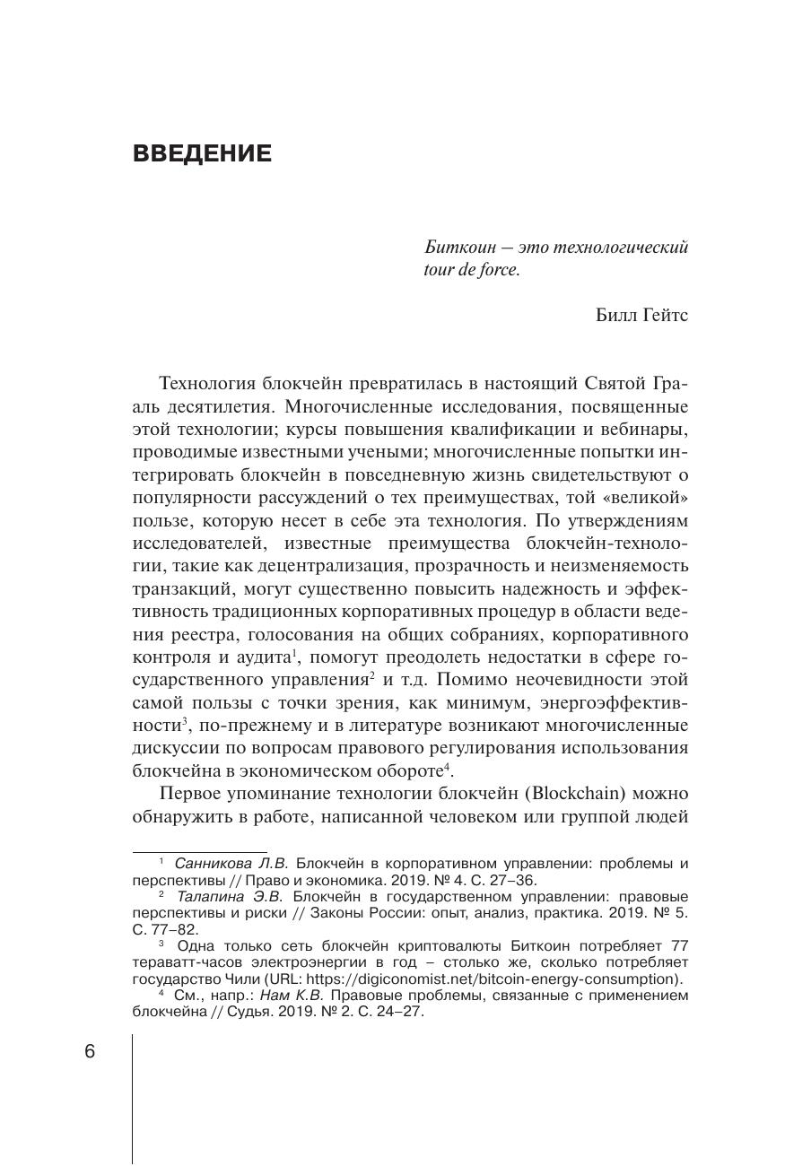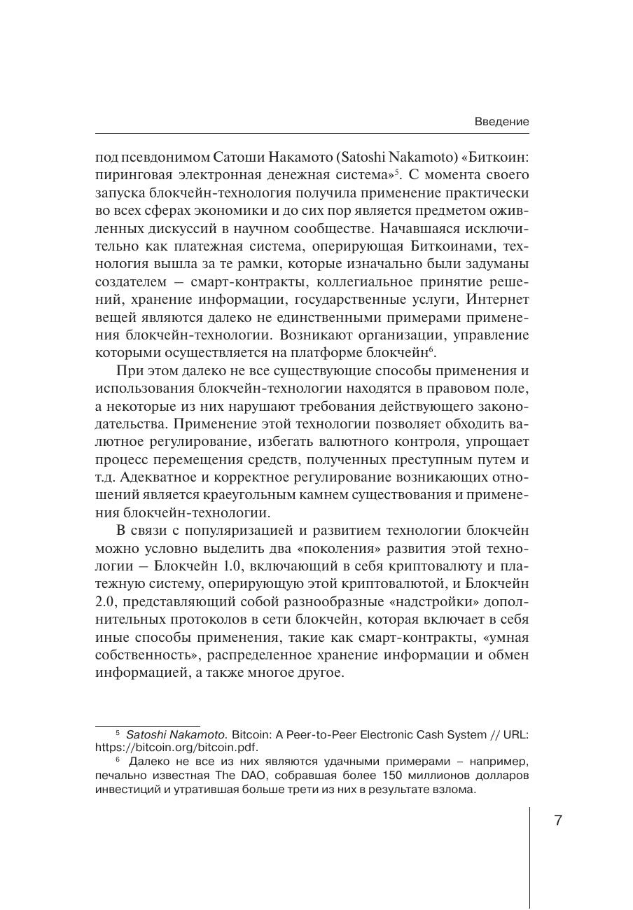 В монографии рассмотрены проблемы правового регулирования использования технологии блокчейн. Исследована криптовалюта как объект гражданских прав, в том числе проведен сравнительный анализ криптовалюты с иными объектами и определено место криптовалюты в системе объектов гражданских прав. Проанализированы особенности правового регулирования заключения смарт-контрактов и исполнения возникающих при этом обязательств. Изучены проблемы правового регулирования иных способов использования блокчейн технологии, в частности при работе с персональными данными, осуществлении предпринимательской деятельности. Монография рассчитана на широкий круг читателей и представляет