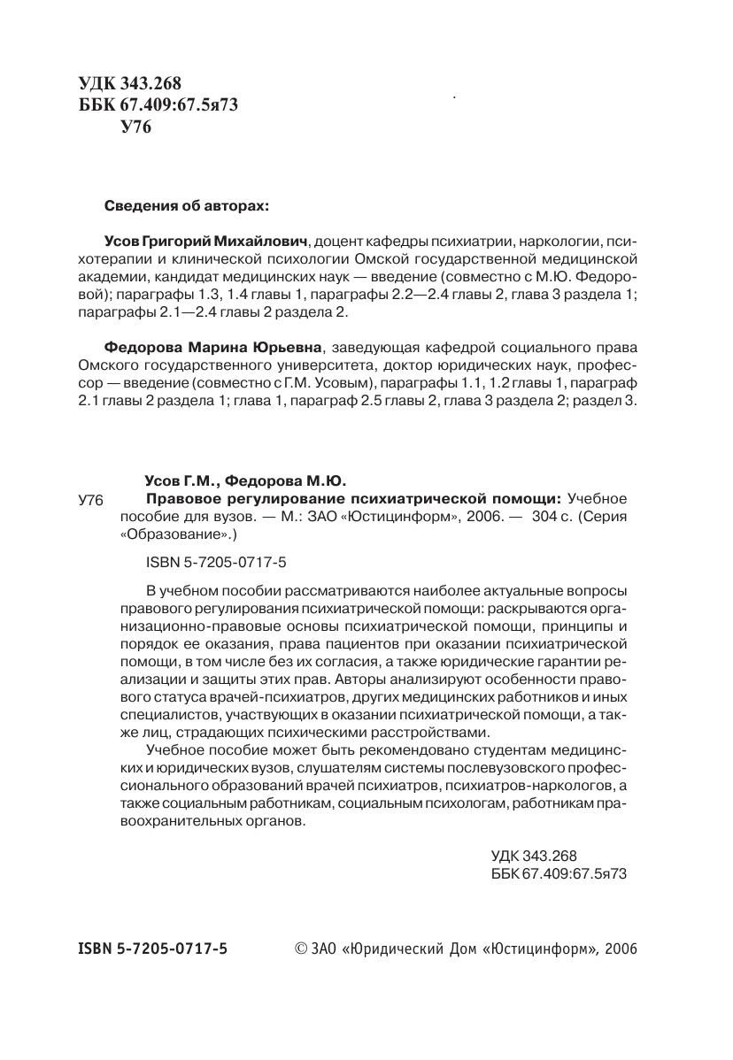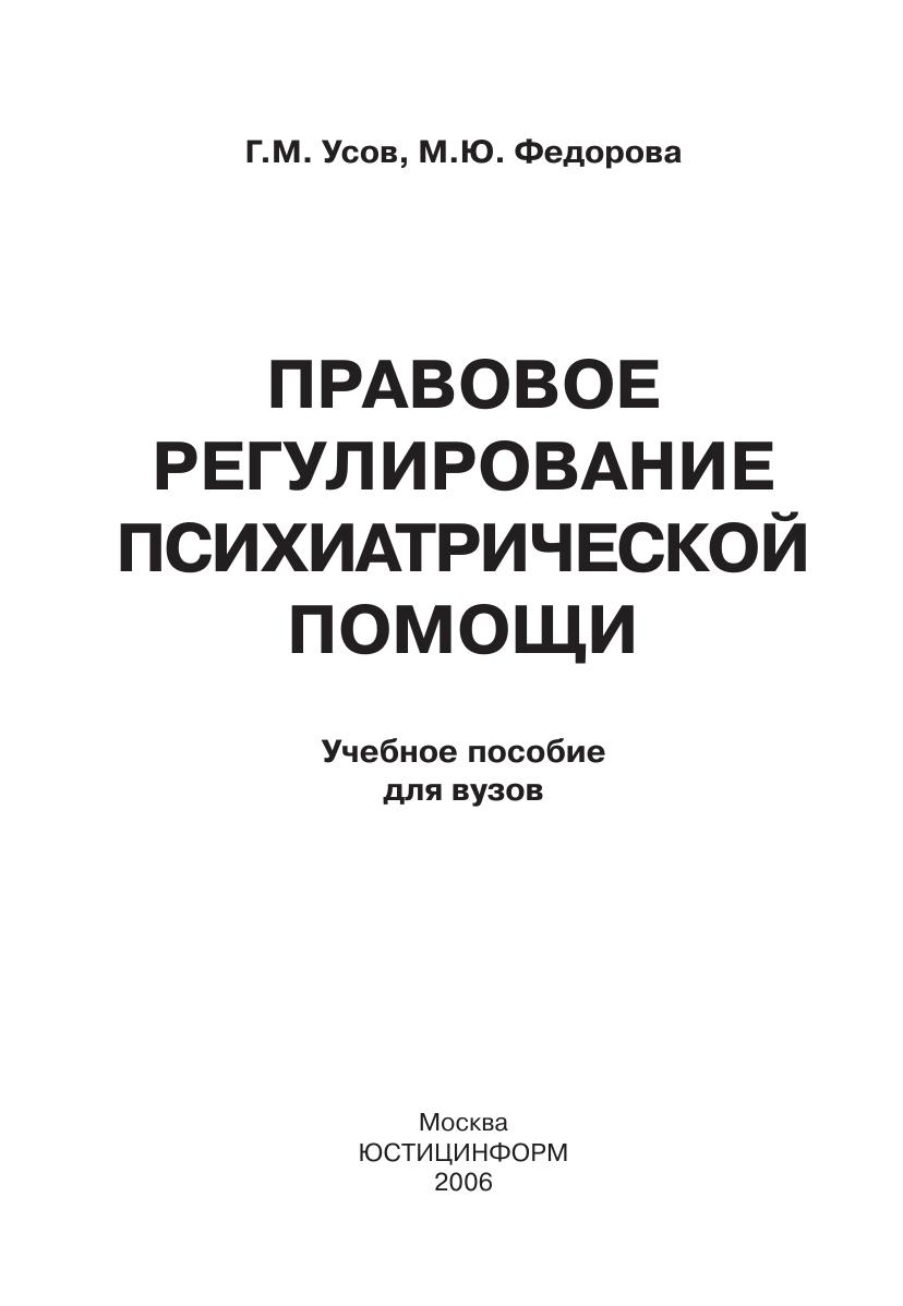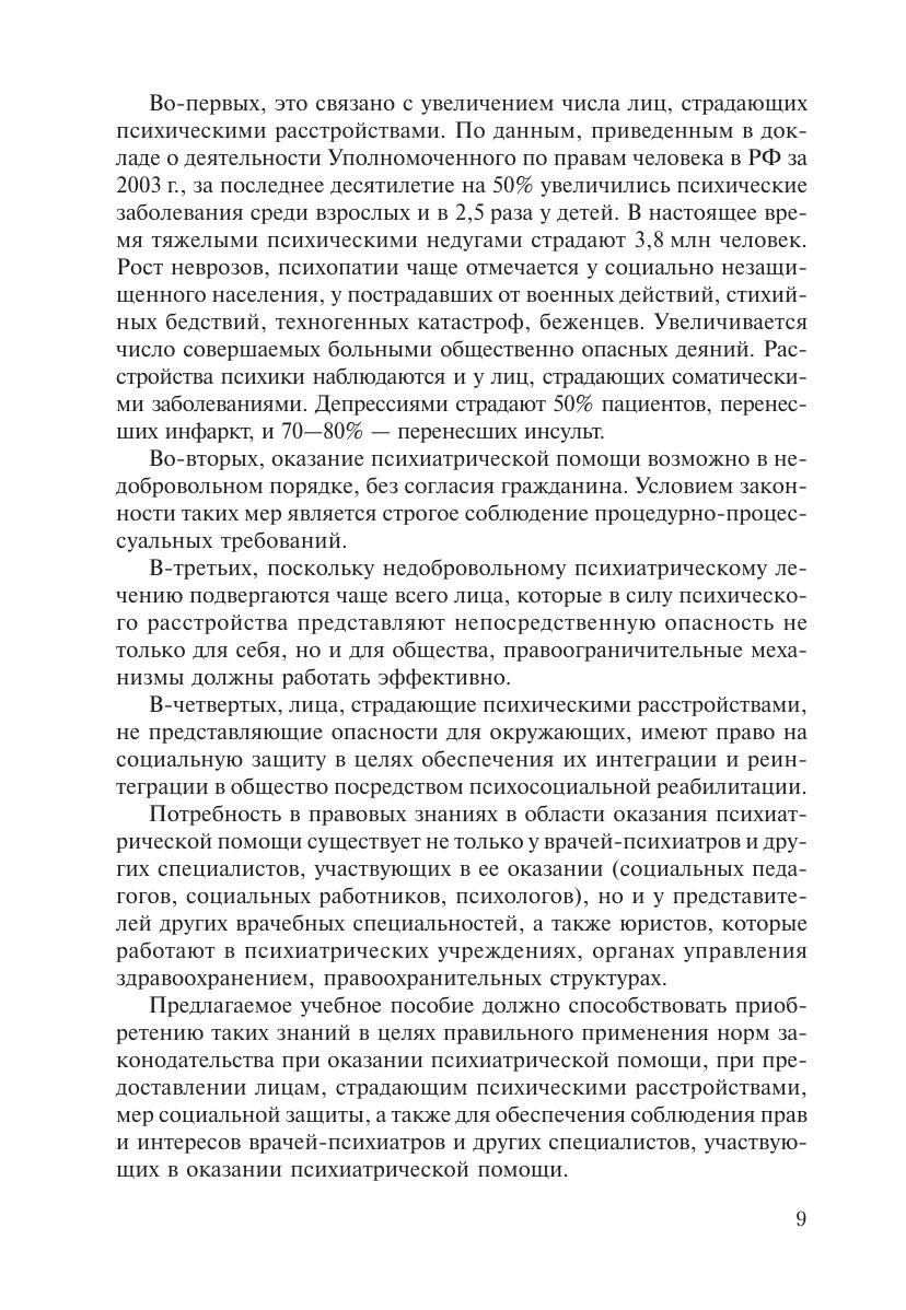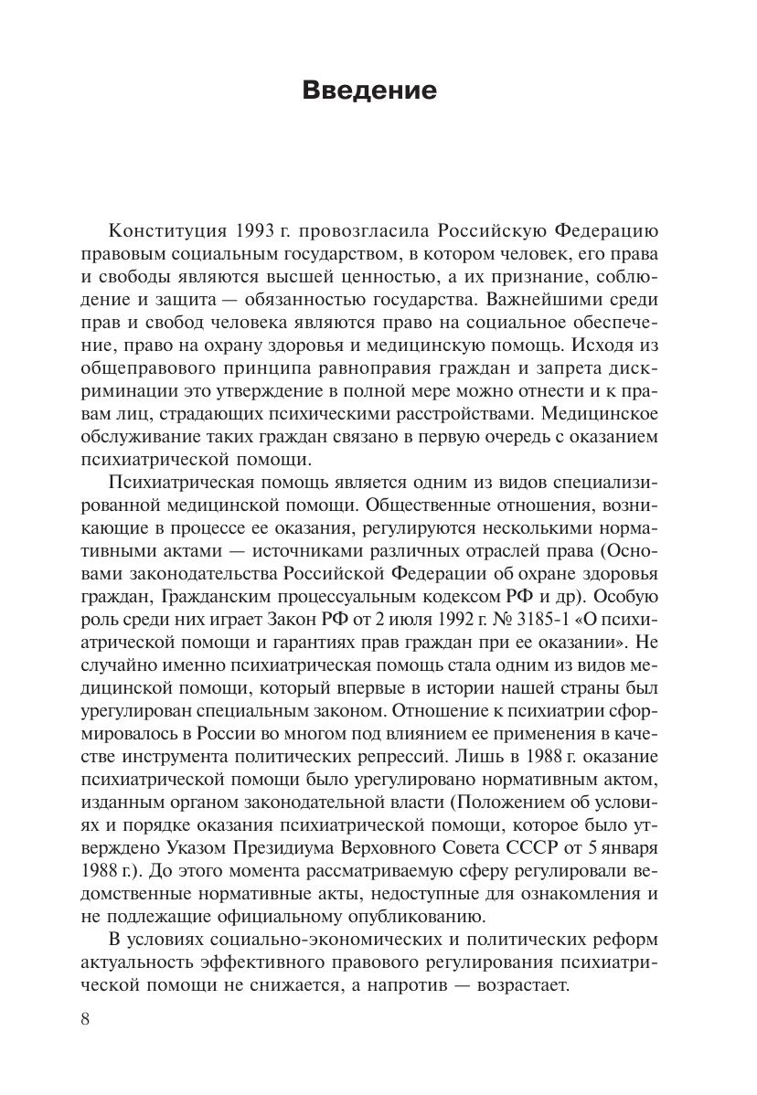 В учебном пособии рассматриваются наиболее актуальные вопросы правового регулирования психиатрической помощи: раскрываются организационно$правовые основы психиатрической помощи, принципы и порядок ее оказания, права пациентов при оказании психиатрической помощи, в том числе без их согласия, а также юридические гарантии реализации и защиты этих прав. Авторы анализируют особенности правового статуса врачей$психиатров, других медицинских работников и иных специалистов, участвующих в оказании психиатрической помощи, а также лиц, страдающих психическими расстройствами.Учебное пособие может быть рекомендовано студентам медицинских и юридических вузов, слушателям системы послевузовского профессионального образований врачей психиатров, психиатров$наркологов, а также социальным работникам, социальным психологам, работникам правоохранительных органов.