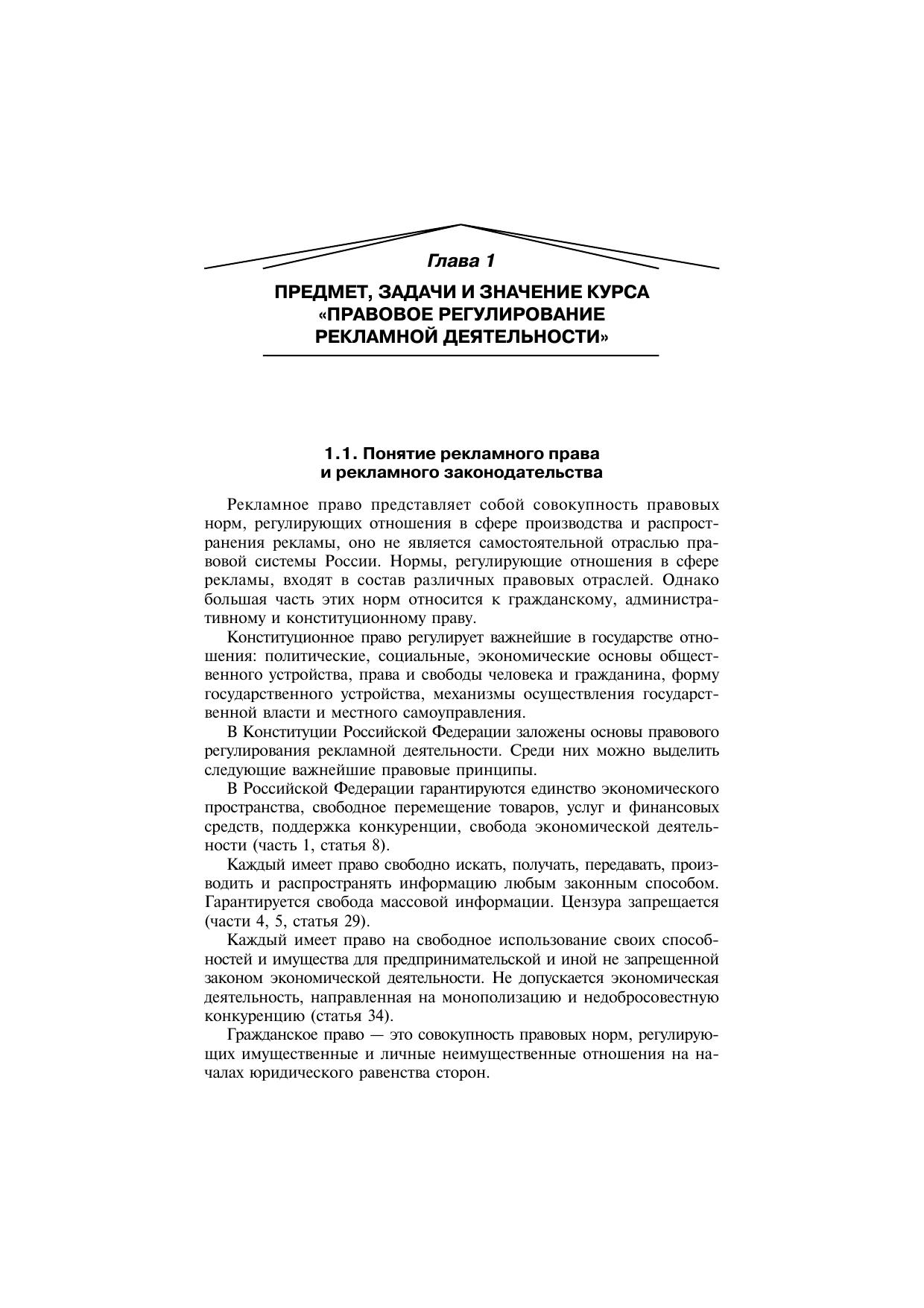 Рассмотрены правовые основы и теоретические аспекты регламентации рекламной деятельности в Российской Федерации. Освещены актуальные вопросы, связанные с регулированием этого вида деятельности: общие и специальные требования к отдельным видам рекламы, правовой статус рекламодателей, производителей и распространителей рекламы, государственное регулирование и контроль, саморегулирование, договоры, авторское право и смежные права, правовая охрана средств индивидуализации товаров, работ, услуг, участников экономических отношений, юридическая ответственность в сфере рекламы. Изложены особенности правового регулирования рекламной деятельности в зарубежных странах. Дается словарь основных терминов и понятий. Для студентов высших учебных заведений, получающих образование по направлению (специальности) «Реклама». Может использоваться при подготовке кадров по специальностям и направлениям, предусматривающим изучение дисциплины «Правовое регулирование рекламной деятельности», ее отдельных разделов и тем. Представляет интерес для широкого круга специалистов в сфере рекламы.