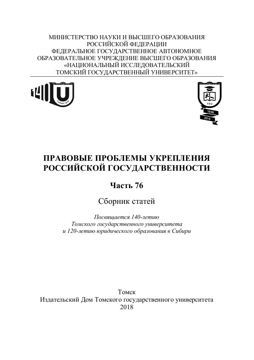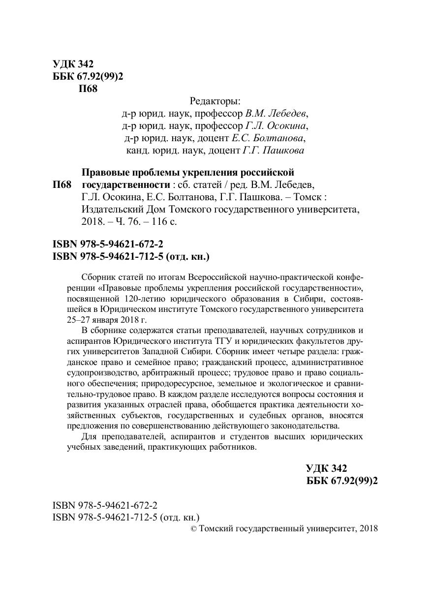 Сборник статей по итогам Всероссийской научно-практической конференции «Правовые проблемы укрепления российской государственности», посвященной 120-летию юридического образования в Сибири, состоявшейся в Юридическом институте Томского государственного университета 25–27 января 2018 г. В сборнике содержатся статьи преподавателей, научных сотрудников и аспирантов Юридического института ТГУ и юридических факультетов других университетов Западной Сибири. Сборник имеет четыре раздела: гражданское право и семейное право, гражданский процесс, административное судопроизводство, арбитражный процесс, трудовое право и право социального обеспечения, природоресурсное, земельное и экологическое и сравнительно-трудовое право. В каждом разделе исследуются вопросы состояния и развития указанных отраслей права, обобщается практика деятельности хозяйственных субъектов, государственных и судебных органов, вносятся предложения по совершенствованию действующего законодательства. Для преподавателей, аспирантов и студентов высших юридических учебных заведений, практикующих работников.