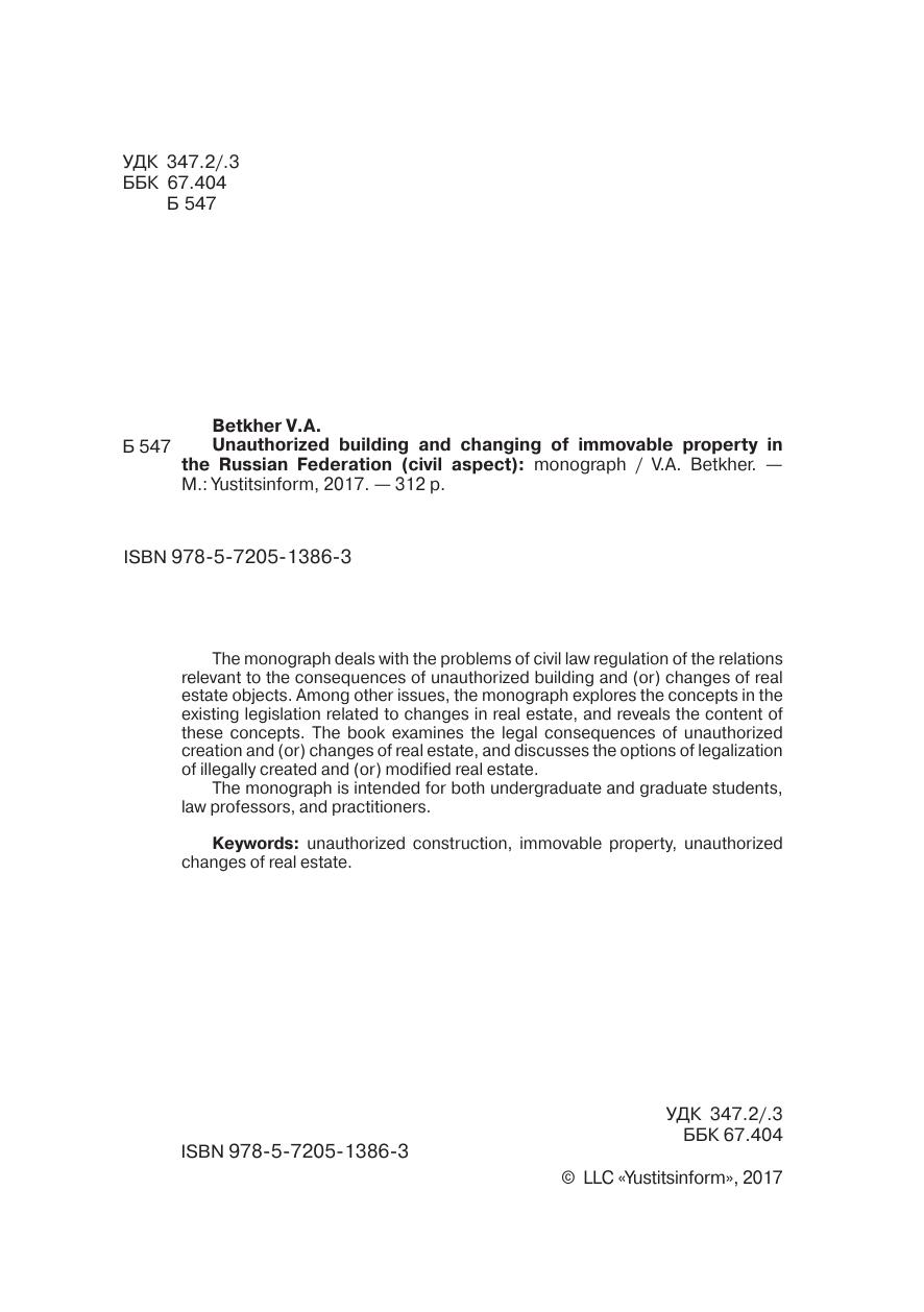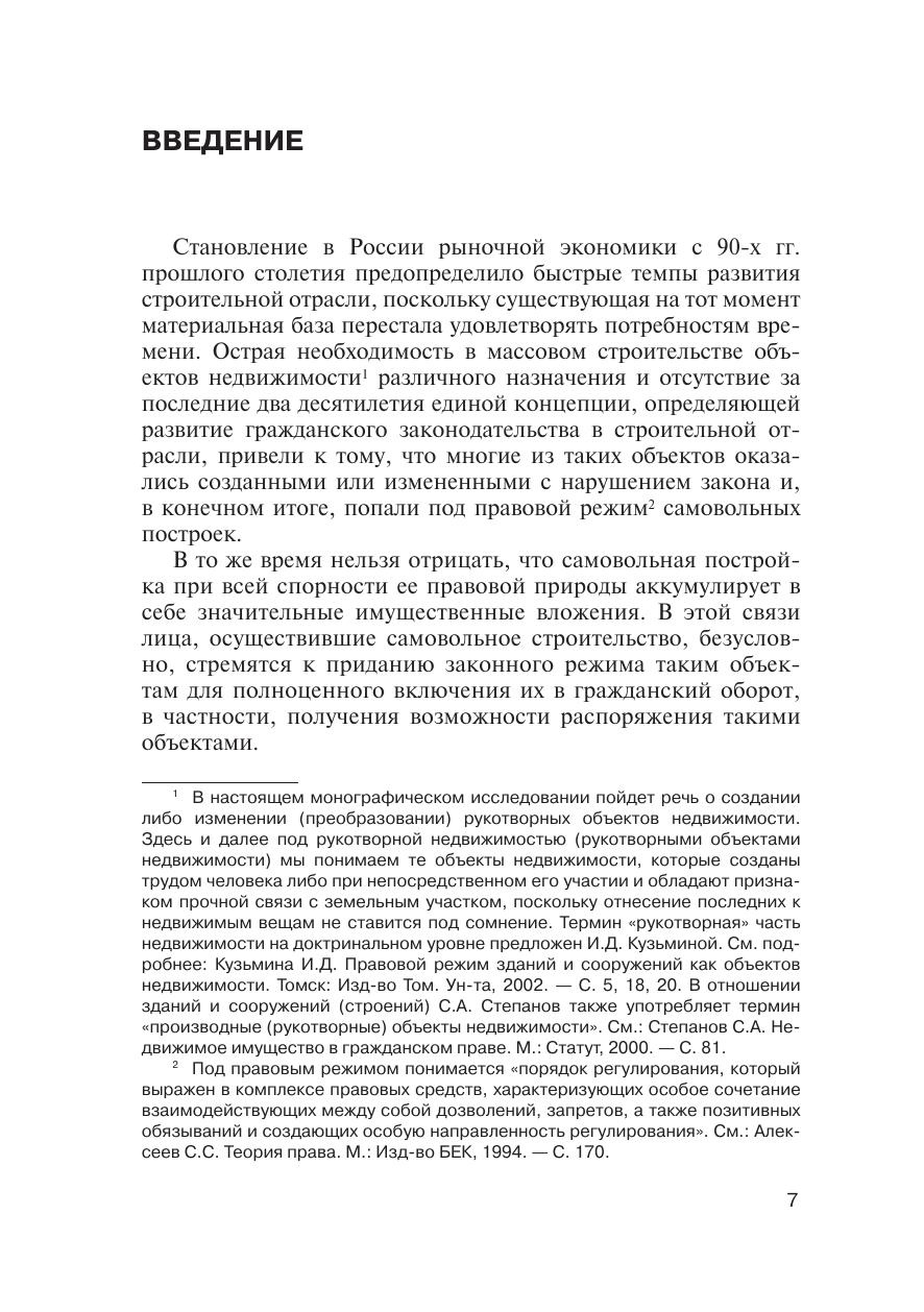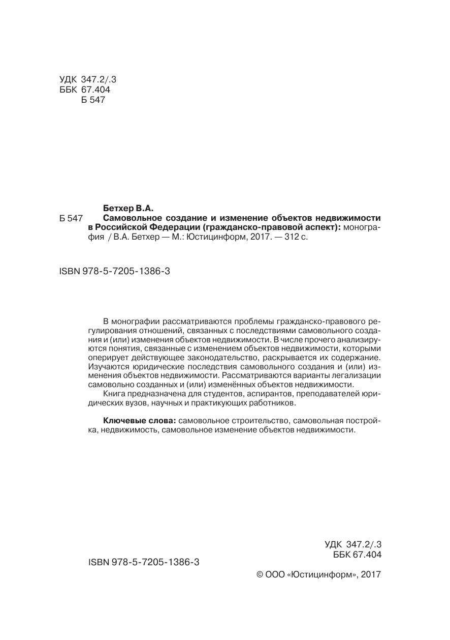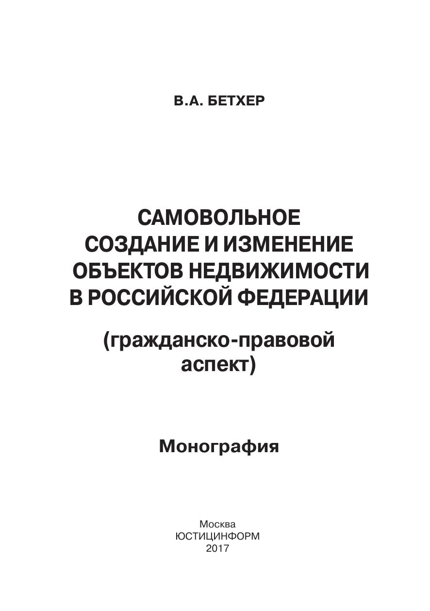 В монографии рассматриваются проблемы гражданско-правового регулирования отношений, связанных с последствиями самовольного создания и (или) изменения объектов недвижимости. В числе прочего анализируются понятия, связанные с изменением объектов недвижимости, которыми оперирует действующее законодательство, раскрывается их содержание.