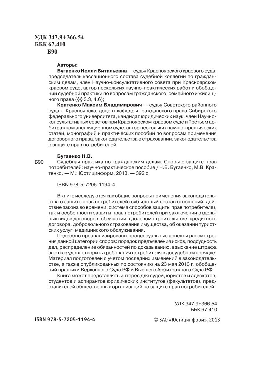 В книге исследуются как общие вопросы применения законодатель-ства о защите прав потребителей (субъектный состав отношений, дей-ствие закона во времени, система способов защиты прав потребителя),так и особенности защиты прав потребителей при заключении отдель-ных видов договоров: об участии в долевом строительстве, кредитногодоговора, добровольного страхования имущества, об оказании турист-ских услуг, медицинского обслуживания.Подробно проанализированы процессуальные аспекты рассмотре-ния данной категории споров: порядок предъявления исков, подсудностьдел, распределение обязанностей по доказыванию, взыскание штрафаза отказ удовлетворить требования потребителя в досудебном порядке.Материал подготовлен с учетом последних изменений в законодатель-стве, а также опубликованных по состоянию на 23 мая 2013 г. обобще-ний практики Верховного Суда РФ и Высшего Арбитражного Суда РФ.Книга может представлять интерес для судей, юристов и адвокатов,студентов и аспирантов юридических институтов (факультетов), пред-ставителей общественных организаций по защите прав потребителей.