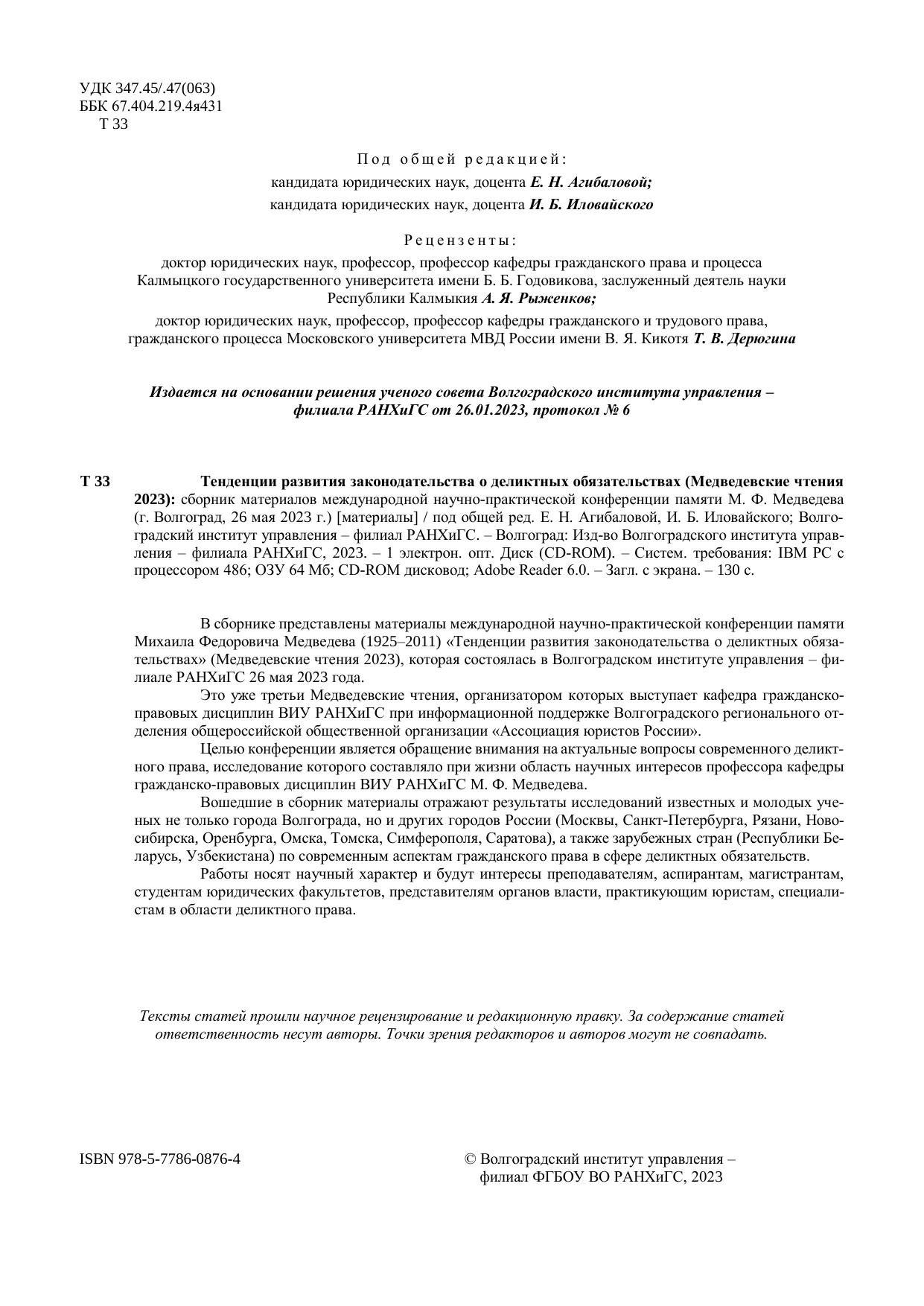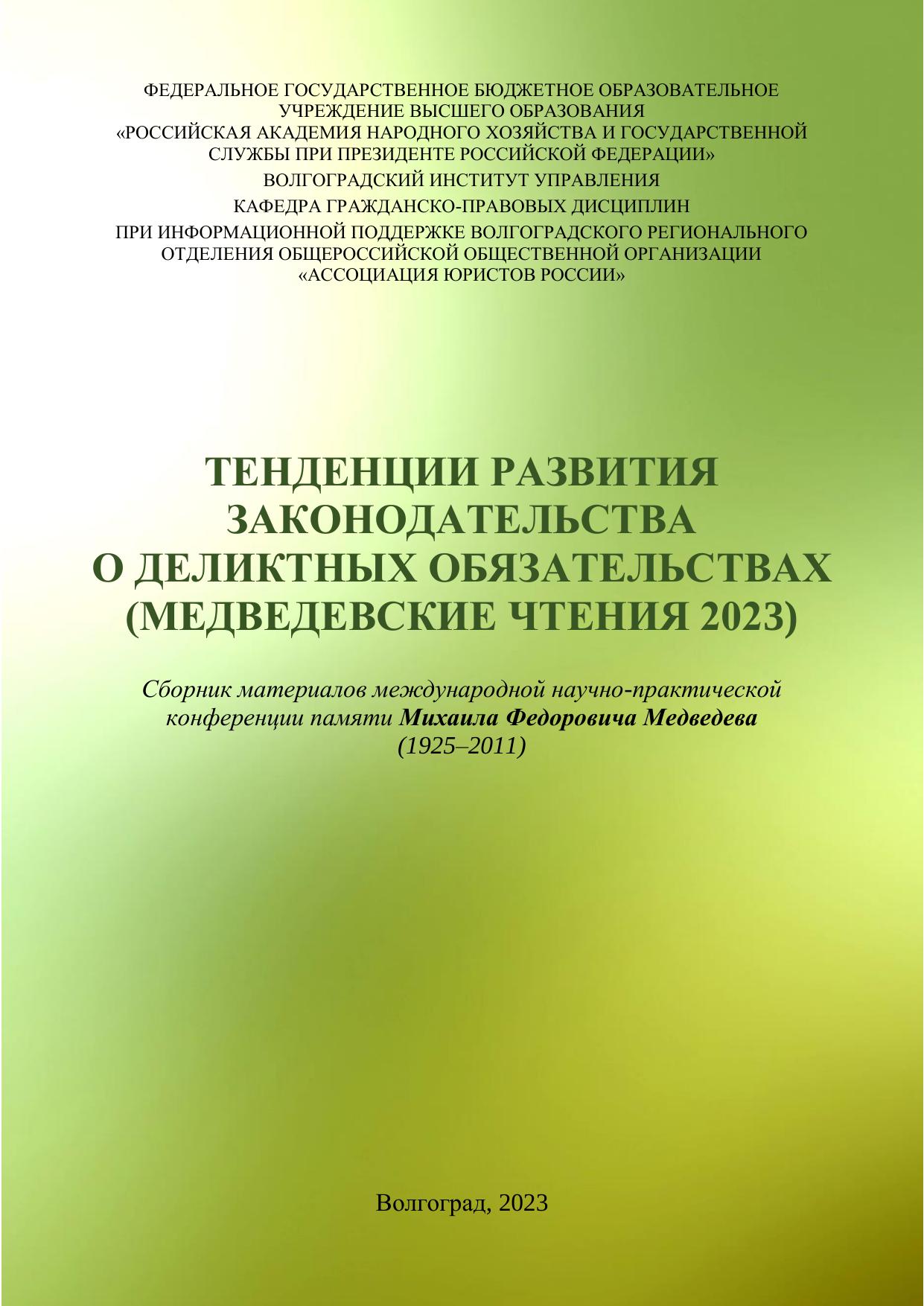 Тенденции развития законодательства о деликтных обязательствах (Медведевские чтения 2023): сборник материалов международной научно-практической конференции памяти М. Ф. Медведева (г. Волгоград, 26 мая 2023 г.)
