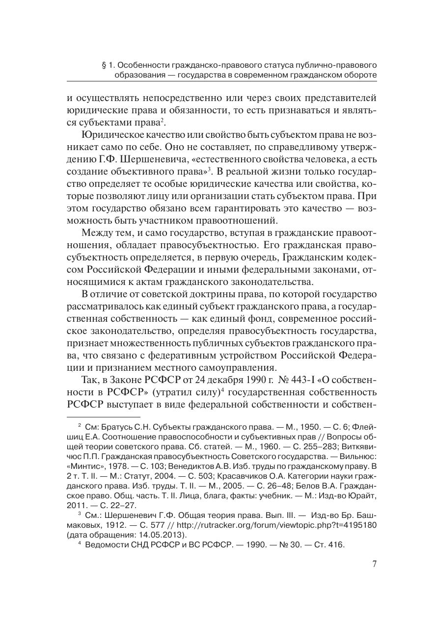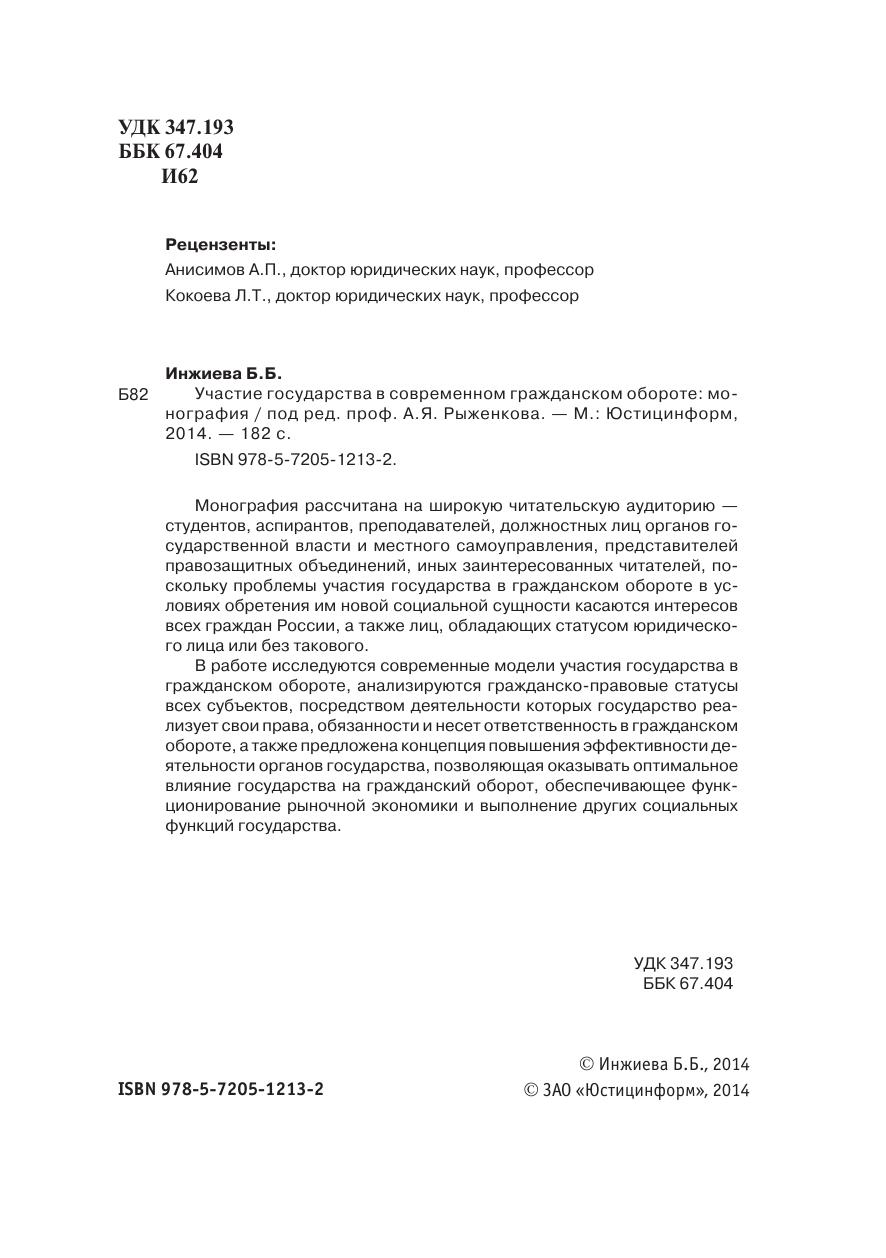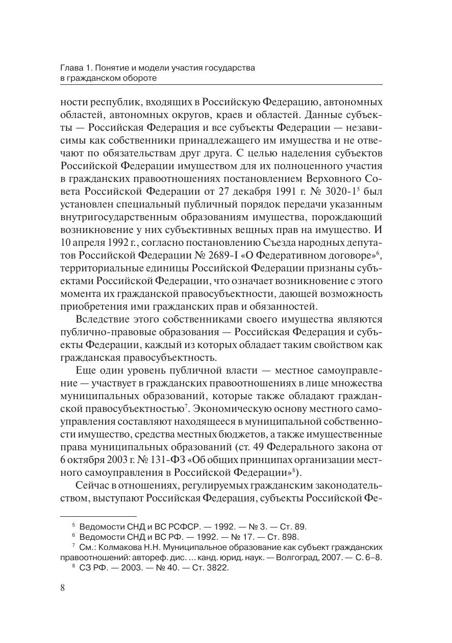 Монография рассчитана на широкую читательскую аудиторию —студентов, аспирантов, преподавателей, должностных лиц органов го-сударственной власти и местного самоуправления, представителейправозащитных объединений, иных заинтересованных читателей, по-скольку проблемы участия государства в гражданском обороте в ус-ловиях обретения им новой социальной сущности касаются интересоввсех граждан России, а также лиц, обладающих статусом юридическо-го лица или без такового.В работе исследуются современные модели участия государства вгражданском обороте, анализируются гражданско-правовые статусывсех субъектов, посредством деятельности которых государство реа-лизует свои права, обязанности и несет ответственность в гражданскомобороте, а также предложена концепция повышения эффективности де-ятельности органов государства, позволяющая оказывать оптимальноевлияние государства на гражданский оборот, обеспечивающее функ-ционирование рыночной экономики и выполнение других социальныхфункций государства