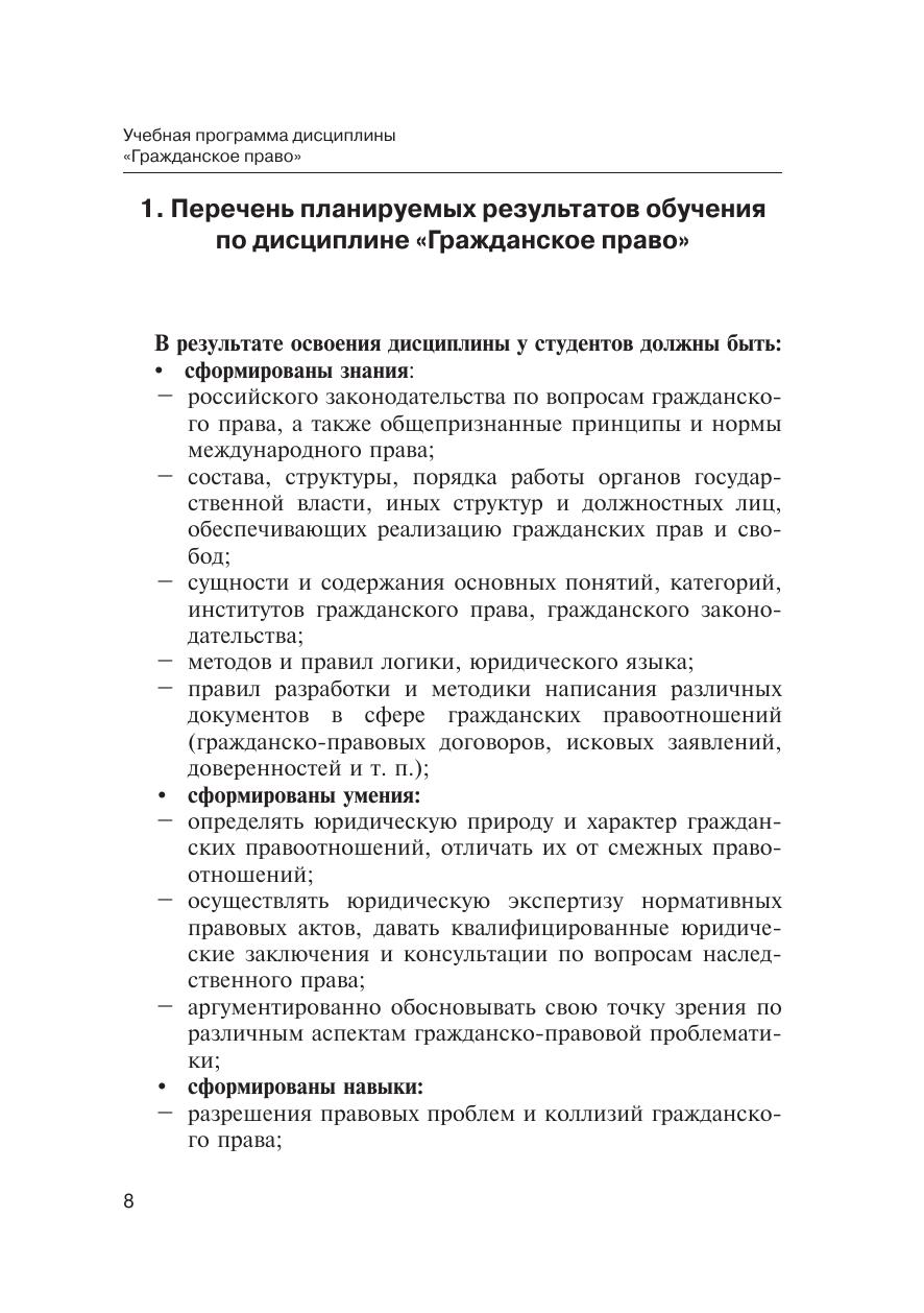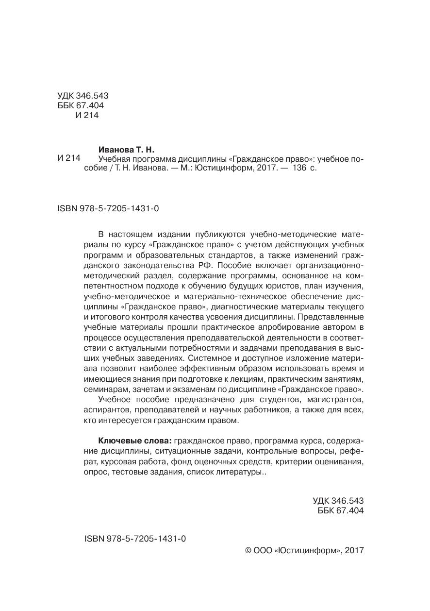 В настоящем издании публикуются учебно-методические материалы по курсу «Гражданское право» с учетом действующих учебных программ и образовательных стандартов, а также изменений гражданского законодательства РФ. Пособие включает организационно-методический раздел, содержание программы, основанное на компетентностном подходе к обучению будущих юристов, план изучения, учебно-методическое и материально-техническое обеспечение дисциплины «Гражданское право», диагностические материалы текущего и итогового контроля качества усвоения дисциплины. Представленные учебные материалы прошли практическое апробирование автором в процессе осуществления преподавательской деятельности в соответствии с актуальными потребностями и задачами преподавания в высших учебных заведениях. Системное и доступное изложение материала позволит наиболее эффективным образом использовать время и имеющиеся знания при подготовке к лекциям, практическим занятиям, семинарам, зачетам и экзаменам по дисциплине «Гражданское право».