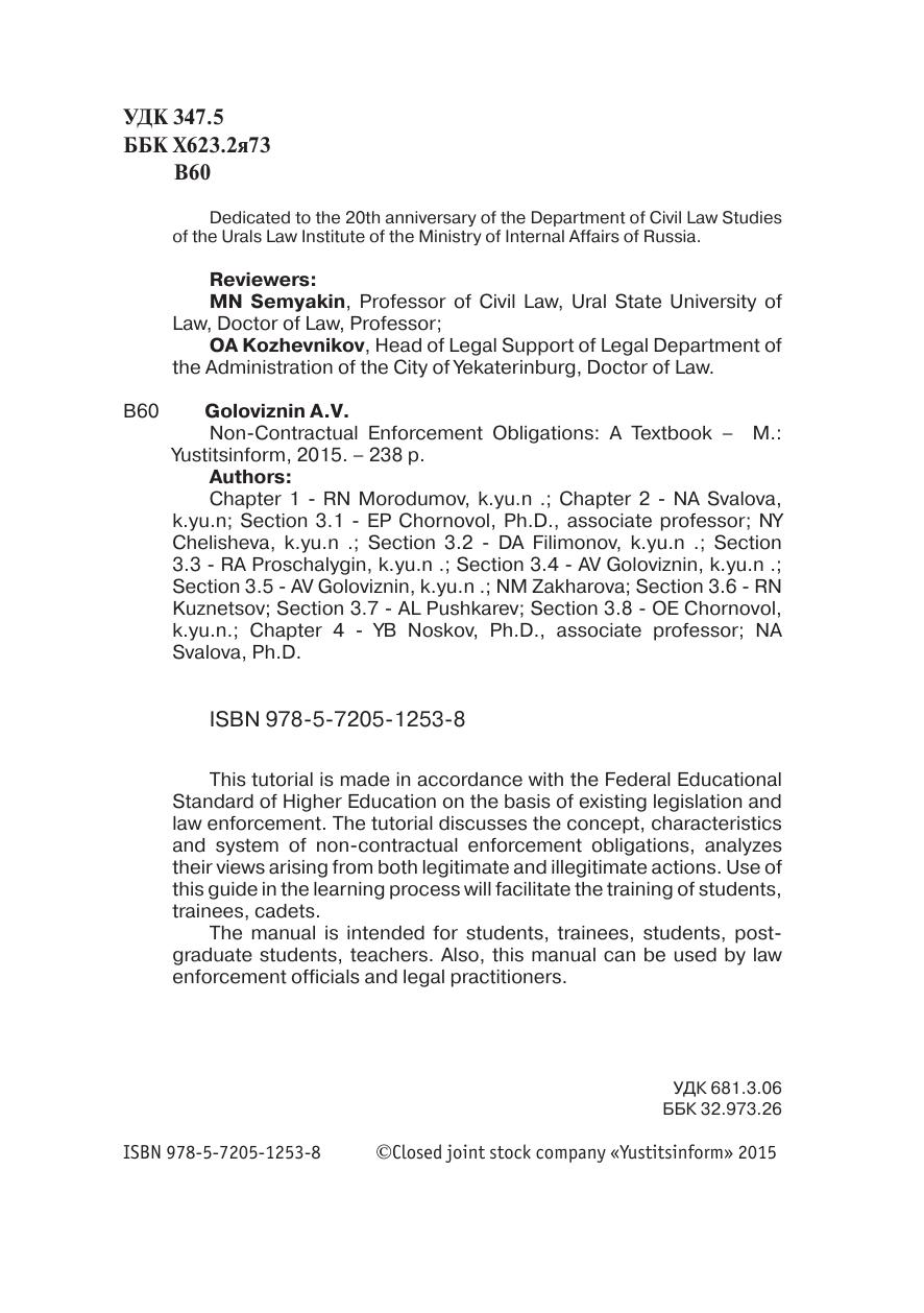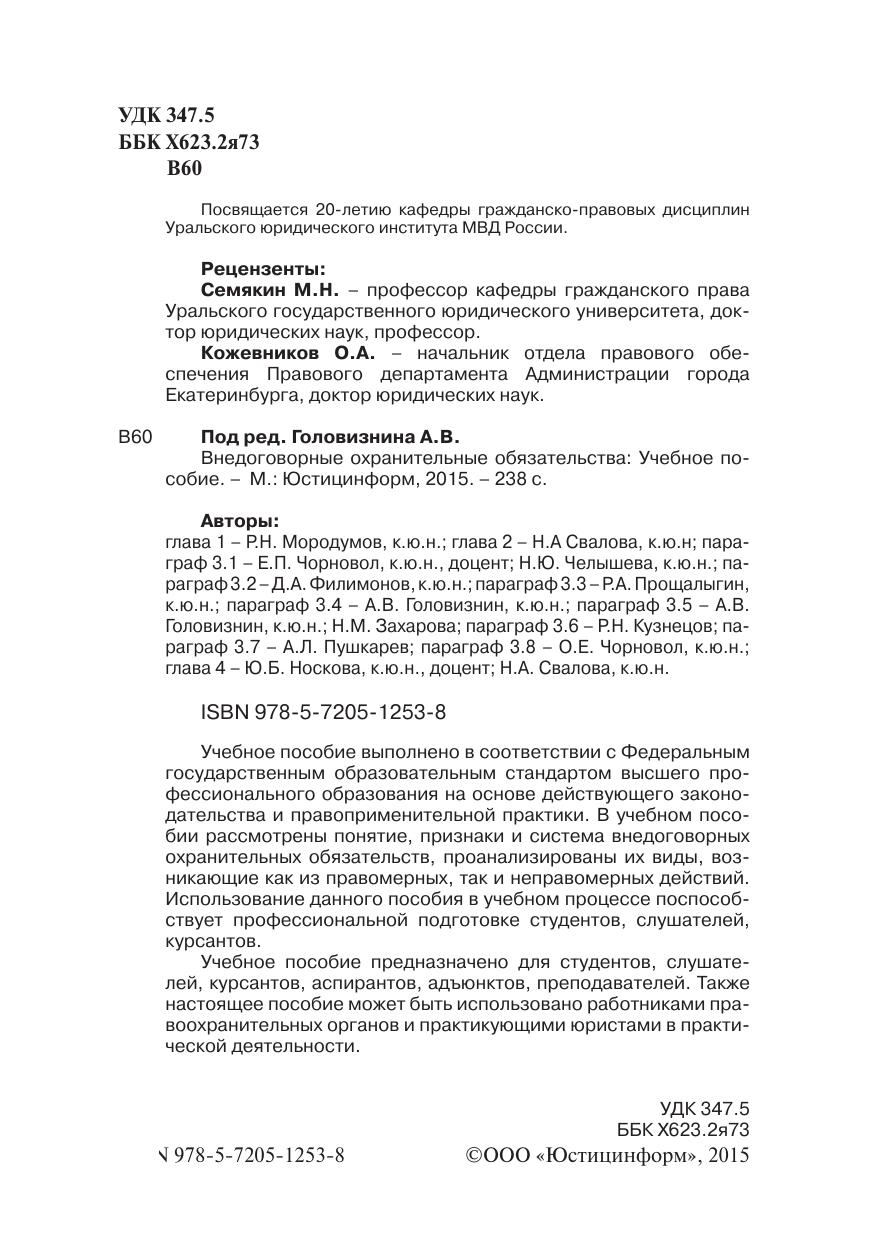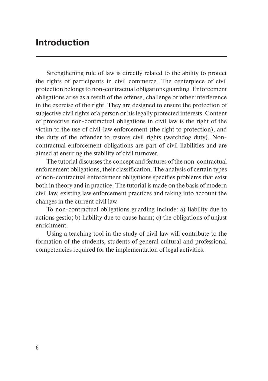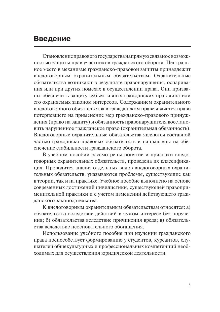 Учебное пособие выполнено в соответствии с Федеральным государственным образовательным стандартом высшего профессионального образования на основе действующего законодательства и правоприменительной практики. В учебном пособии рассмотрены понятие, признаки и система внедоговорных охранительных обязательств, проанализированы их виды, возникающие как из правомерных, так и неправомерных действий. Использование данного пособия в учебном процессе поспособствует профессиональной подготовке студентов, слушателей, курсантов. Учебное пособие предназначено для студентов, слушателей, курсантов, аспирантов, адъюнктов, преподавателей. Также настоящее пособие может быть использовано работниками правоохранительных органов и практикующими юристами в практической деятельности