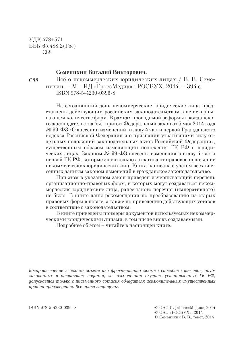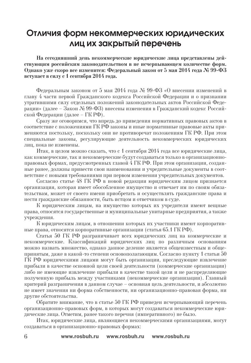 На сегодняшний день некоммерческие юридические лица представлены действующим российским законодательством в не исчерпывающем количестве форм. В рамках проводимой реформы гражданского законодательства был принят Федеральный закон от 5 мая 2014 года № 99ФЗ «О внесении изменений в главу 4 части первой Гражданского кодекса Российской Федерации и о признании утратившими силу отдельных положений законодательных актов Российской Федерации», существенным образом изменяющий положения ГК РФ о юридических лицах. Законом № 99ФЗ внесены изменения в главу 4 части первой ГК РФ, которые значительно затрагивают правовое положение некоммерческих юридических лиц. Книга написана с учетом всех внесенных данным законом изменений в гражданское законодательство. При этом в указанном закон приведен исчерпывающий перечень организационноправовых форм, в которых могут создаваться некоммерческие юридические лица, ранее такого перечня (императивного) не было. В книге даны рекомендации по преобразованию из старых правовых форм в новые, а также по приведению действующих уставов в соответствие с законодательством. В книге приведены примеры документов используемых некоммерческими юридическими лицами, в том числе вновь создаваемыми. Подробнее об этом – читайте в настоящей книге