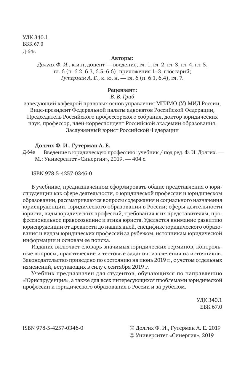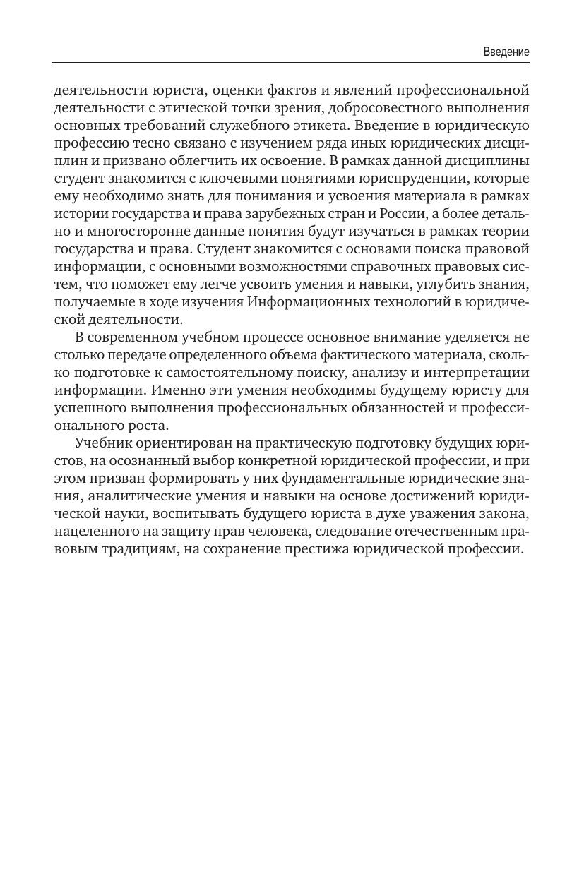 В учебнике, предназначенном сформировать общие представления о юриспруденции как сфере деятельности, о юридической профессии и юридическом образовании, рассматриваются вопросы содержания и социального назначения юриспруденции, юридического образования в России; сферы деятельности юриста, виды юридических профессий, требования к их представителям, профессиональное правосознание и этика юриста. Уделяется внимание развитию юриспруденции от древности до наших дней, специфике юридического образования и видам юридических профессий за рубежом, источникам юридической информации и основам ее поиска. Издание включает словарь значимых юридических терминов, контрольные вопросы, практические и тестовые задания, извлечения из источников. Законодательство приведено по состоянию на июнь 2019 г., с учетом отдельных изменений, вступающих в силу с сентября 2019 г. Учебник предназначен для студентов, обучающихся по направлению «Юриспруденция», а также для всех интересующихся проблемами юридической профессии и юридического образования в России и за рубежом.