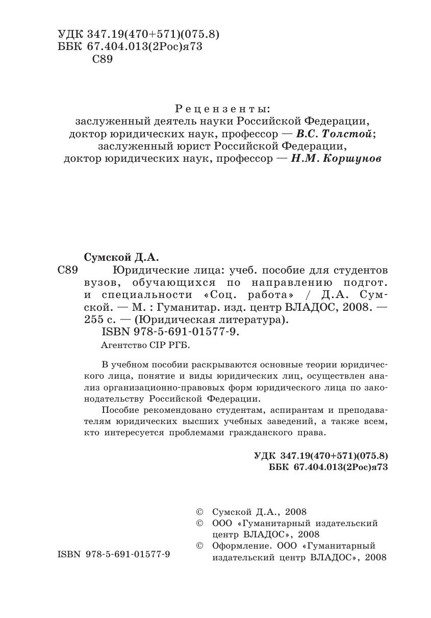 Юридические лица: учебное пособие для студентов вузов, обучающихся по направлению подгот. и специальности «Соц. работа»