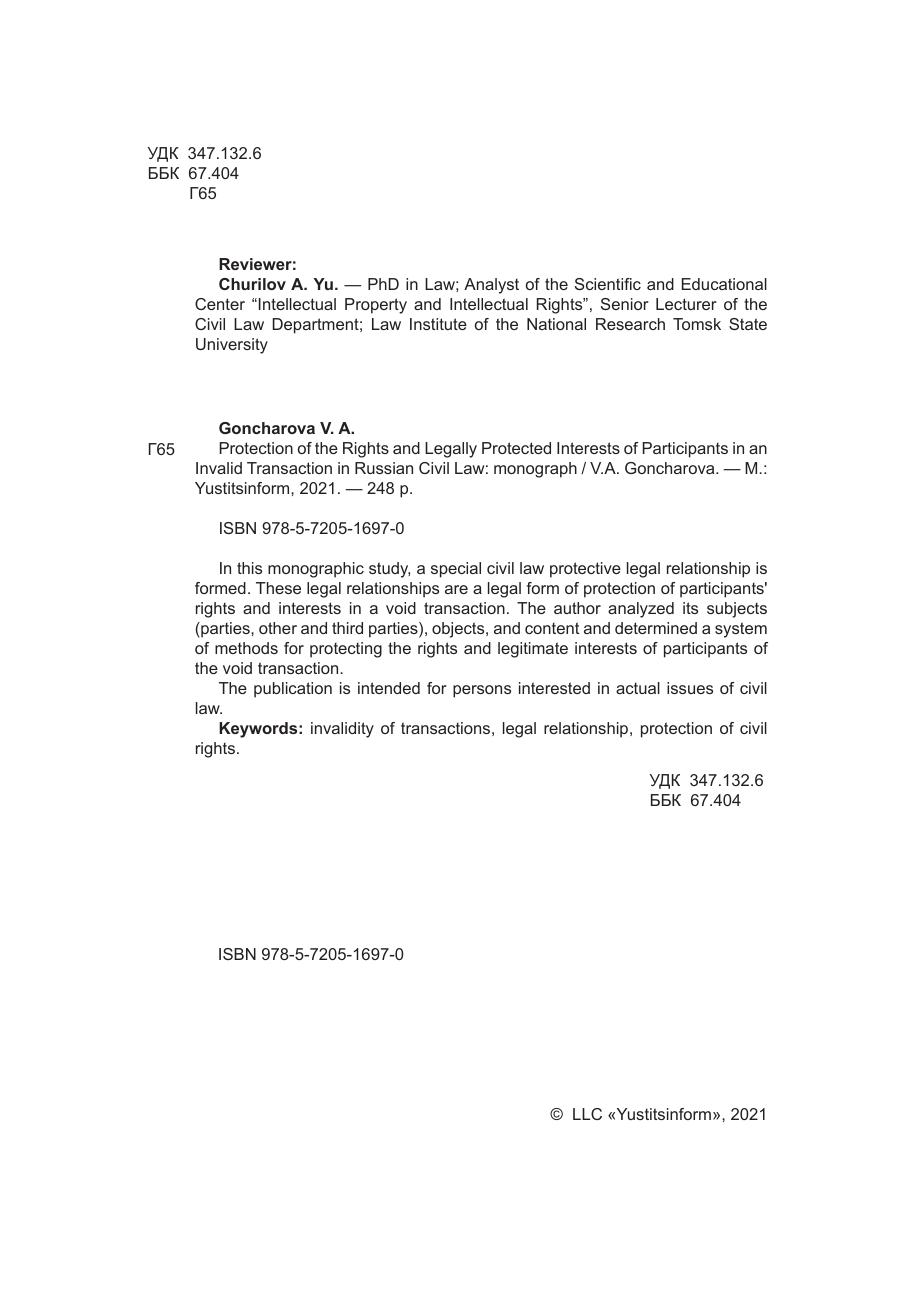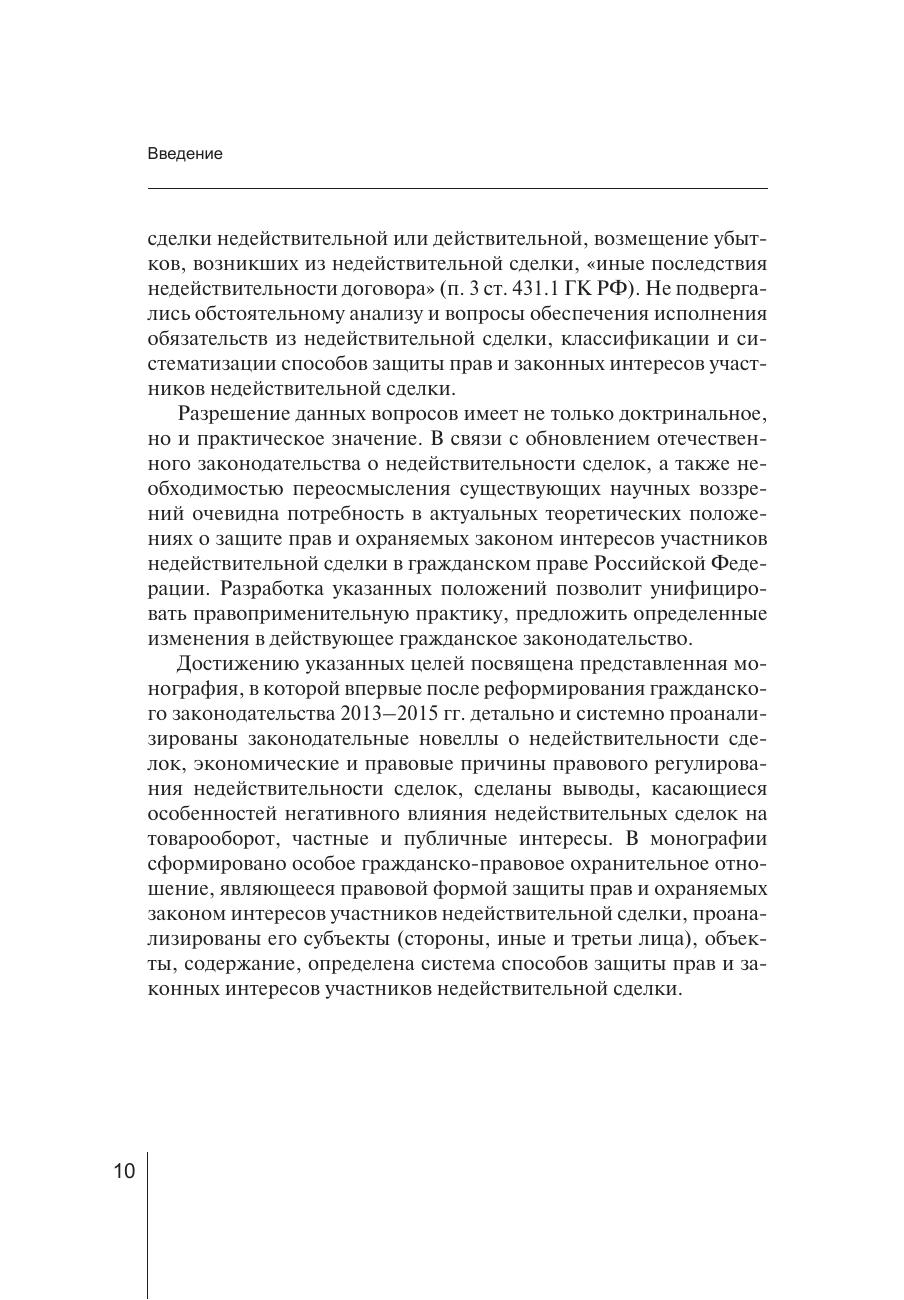 В данном монографическом исследовании сформировано особое гражданско-правовое охранительное отношение, являющееся правовой формой защиты прав и охраняемых законом интересов участников недействительной сделки. Проанализированы его субъекты (стороны, иные и третьи лица), объекты, содержание, определена система способов защиты прав и законных интересов участников недействительной сделки. Издание предназначено для лиц, интересующихся актуальными проблемами гражданского права.