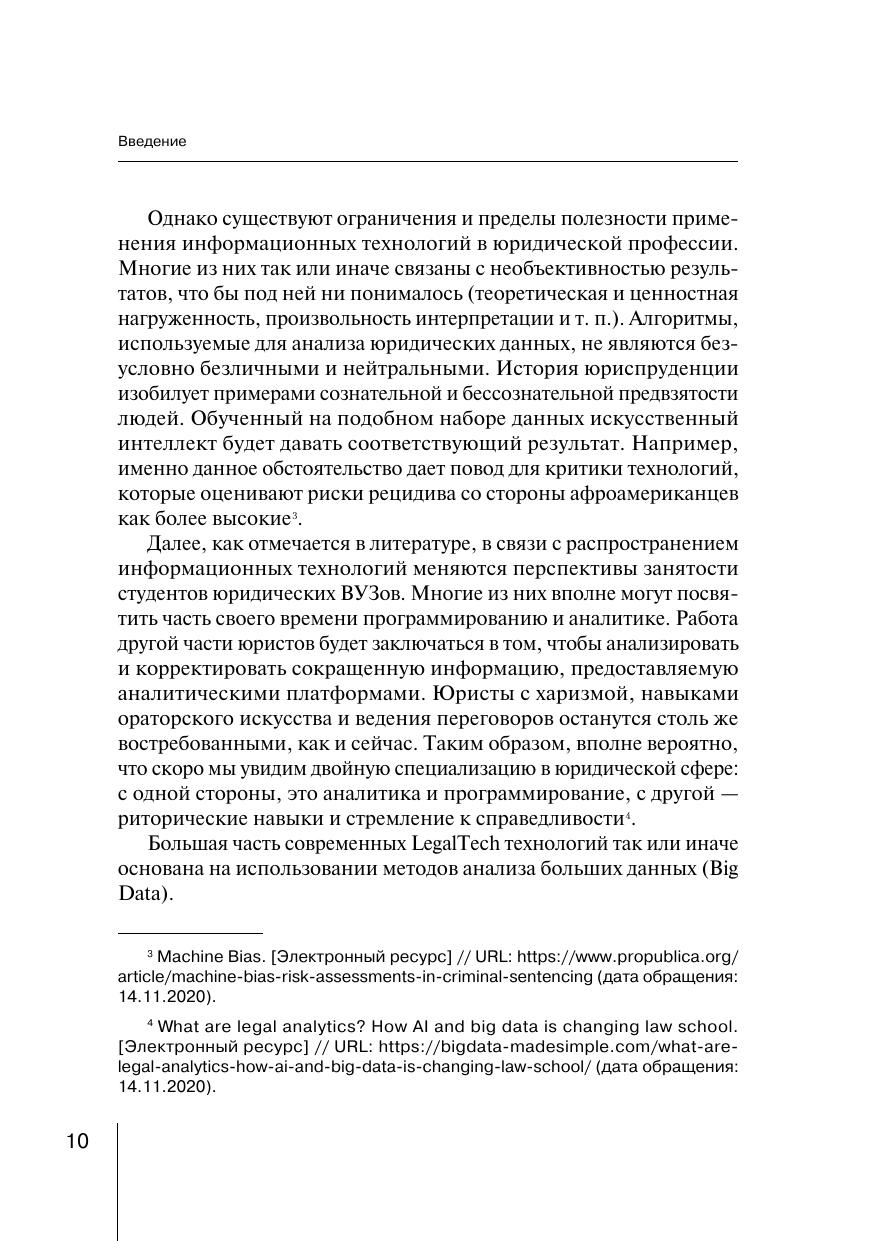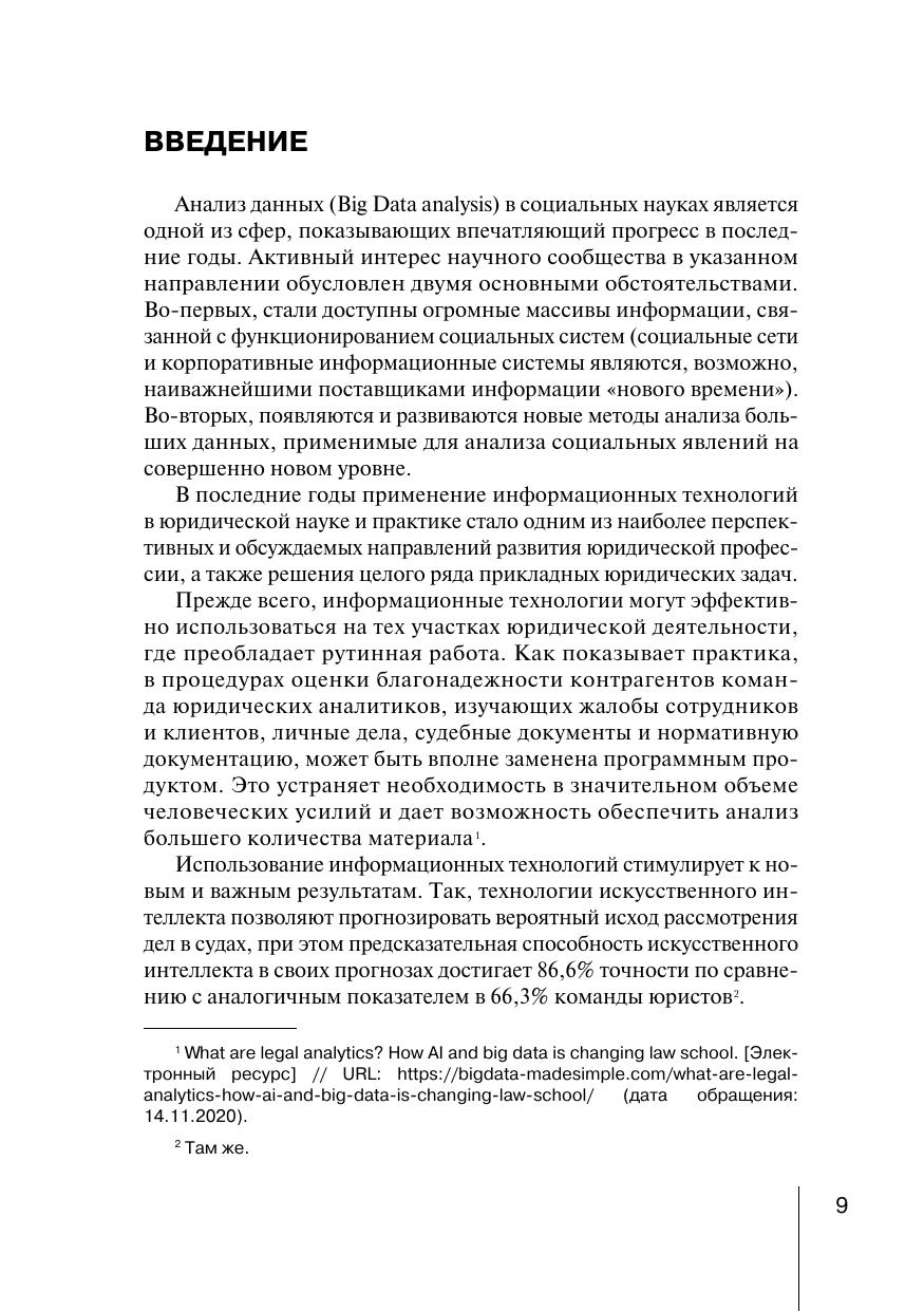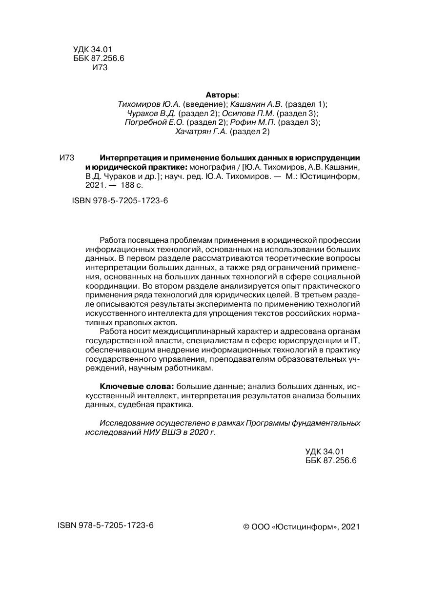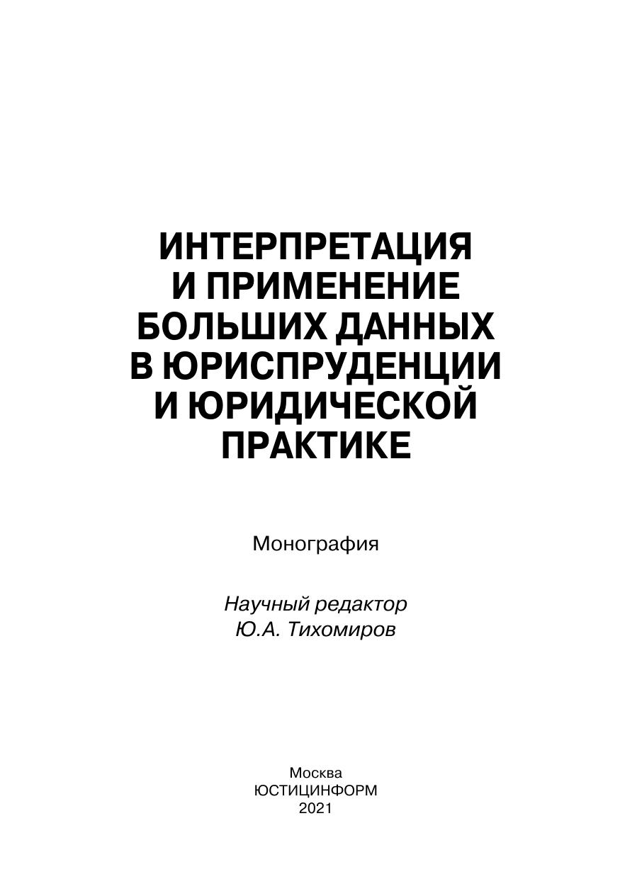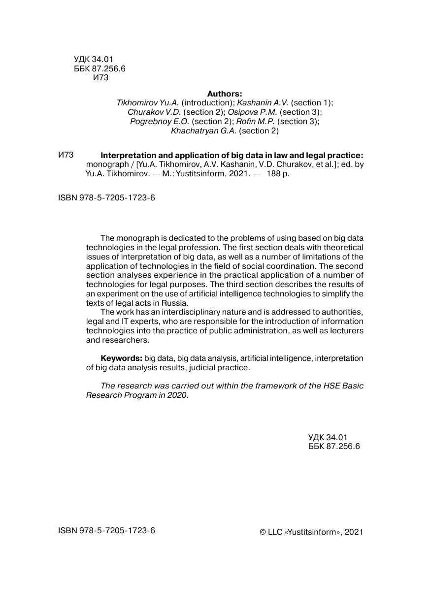 Работа посвящена проблемам применения в юридической профессии информационных технологий, основанных на использовании больших данных. В первом разделе рассматриваются теоретические вопросы интерпретации больших данных, а также ряд ограничений применения, основанных на больших данных технологий в сфере социальной координации. Во втором разделе анализируется опыт практического применения ряда технологий для юридических целей. В третьем разделе описываются результаты эксперимента по применению технологий искусственного интеллекта для упрощения текстов российских нормативных правовых актов. Работа носит междисциплинарный характер и адресована органам государственной власти, специалистам в сфере юриспруденции и IT, обеспечивающим внедрение информационных технологий в практику государственного управления, преподавателям образовательных учреждений, научным работникам.