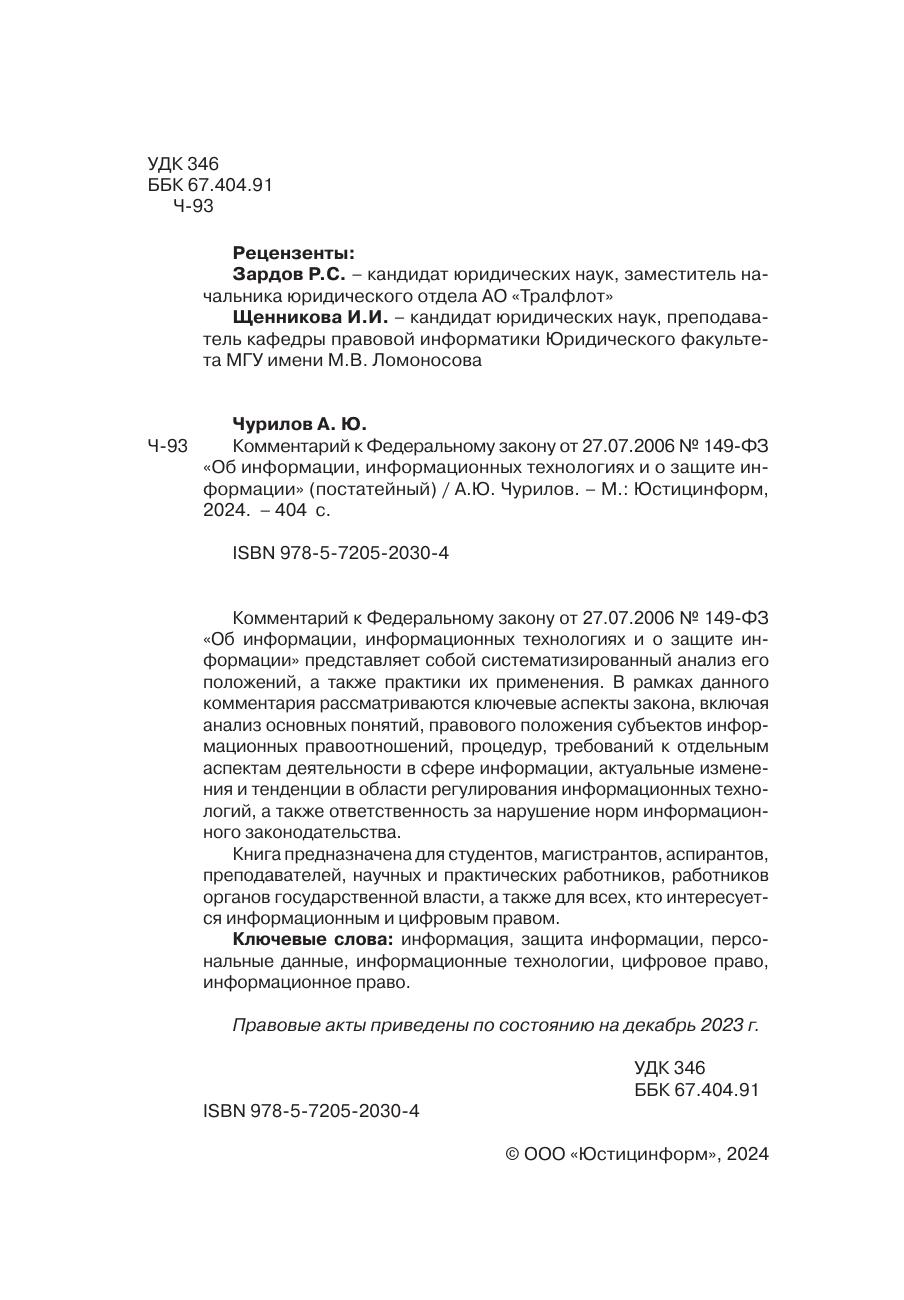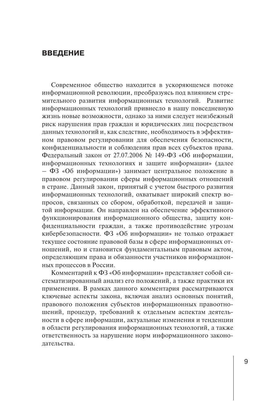 Комментарий к Федеральному закону от 27.07.2006 № 149-ФЗ «Об информации, информационных технологиях и о защите информации» представляет собой систематизированный анализ его положений, а также практики их применения. В рамках данного комментария рассматриваются ключевые аспекты закона, включая анализ основных понятий, правового положения субъектов информационных правоотношений, процедур, требований к отдельным аспектам деятельности в сфере информации, актуальные изменения и тенденции в области регулирования информационных технологий, а также ответственность за нарушение норм информационного законодательства.