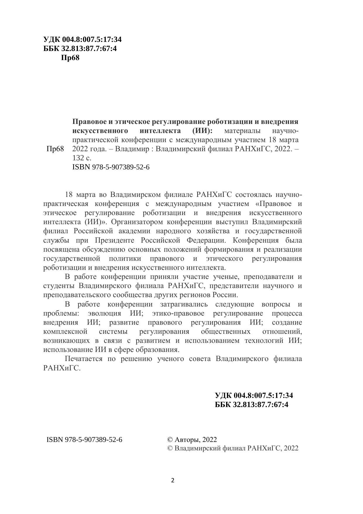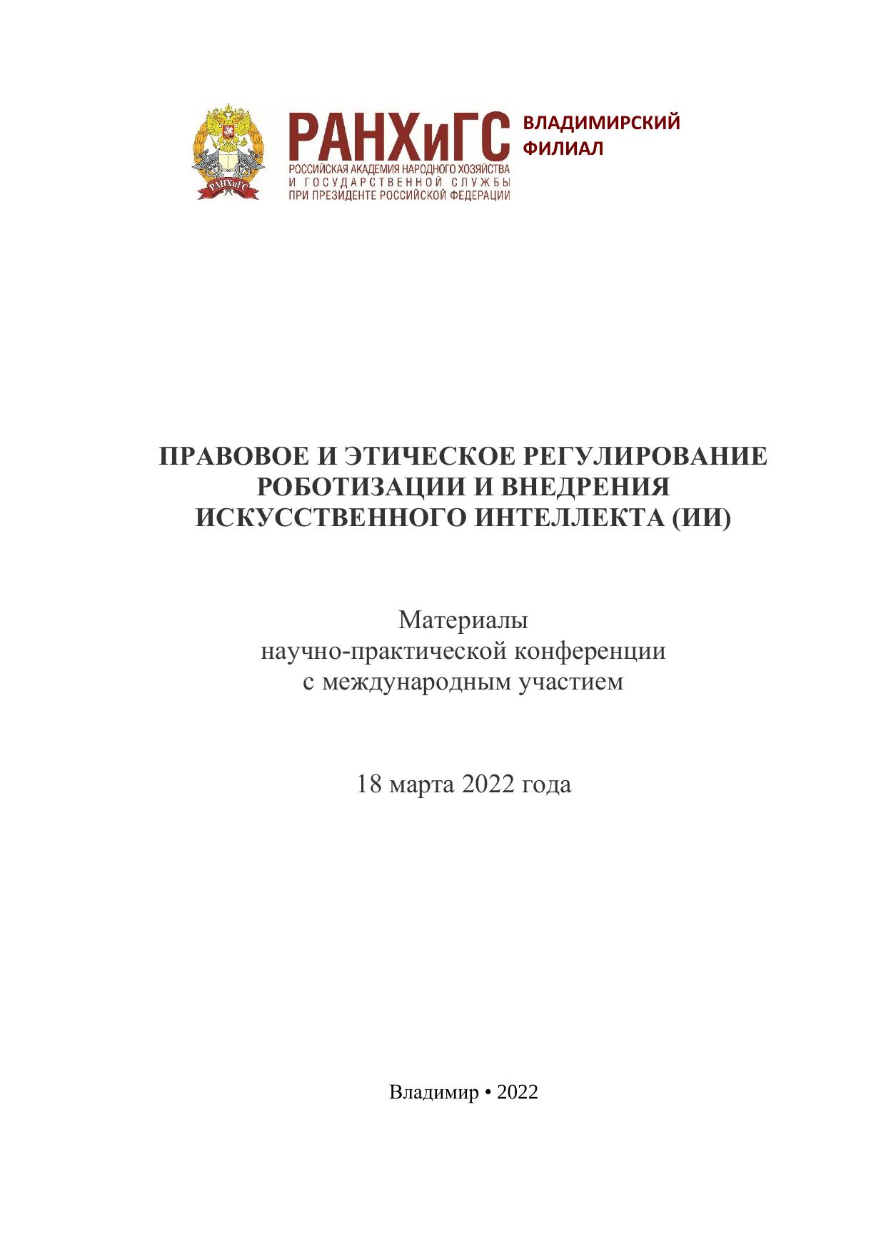 Правовое и этическое регулирование роботизации и внедрения искусственного интеллекта (ИИ): материалы научно-практической конференции с международным участием 18 марта 2022 года