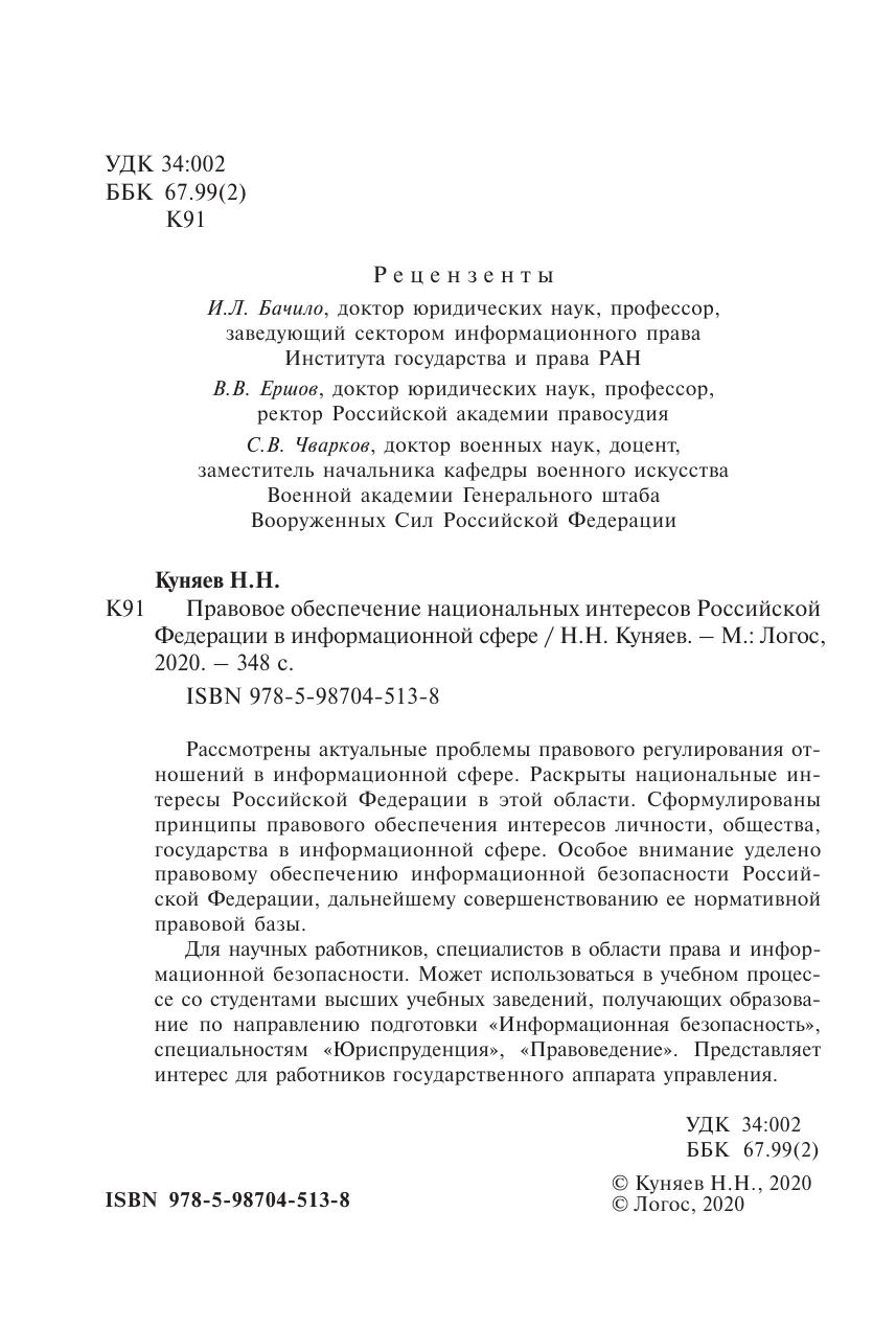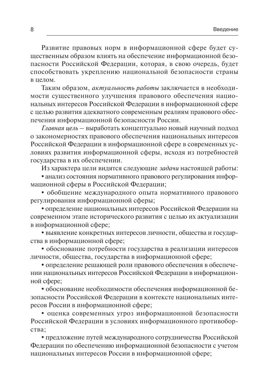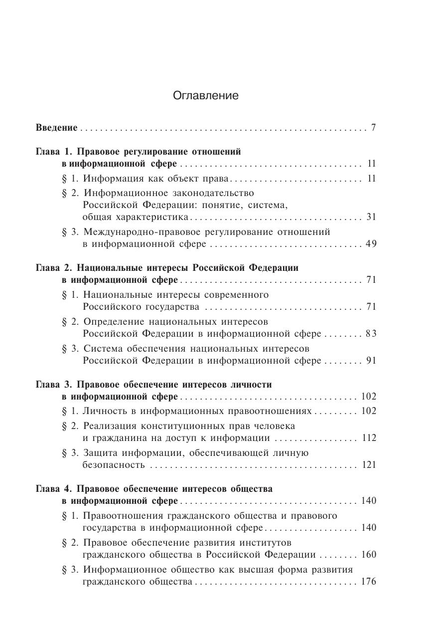 Рассмотрены актуальные проблемы правового регулирования отношений в информационной сфере. Раскрыты национальные интересы Российской Федерации в этой области. Сформулированы принципы правового обеспечения интересов личности, общества, государства в информационной сфере. Особое внимание уделено правовому обеспечению информационной безопасности Российской Федерации, дальнейшему совершенствованию ее нормативной правовой базы. Для научных работников, специалистов в области права и информационной безопасности. Может использоваться в учебном процессе со студентами высших учебных заведений, получающих образование по направлению подготовки «Информационная безопасность», специальностям «Юриспруденция», «Правоведение». Представляет интерес для работников государственного аппарата управления.