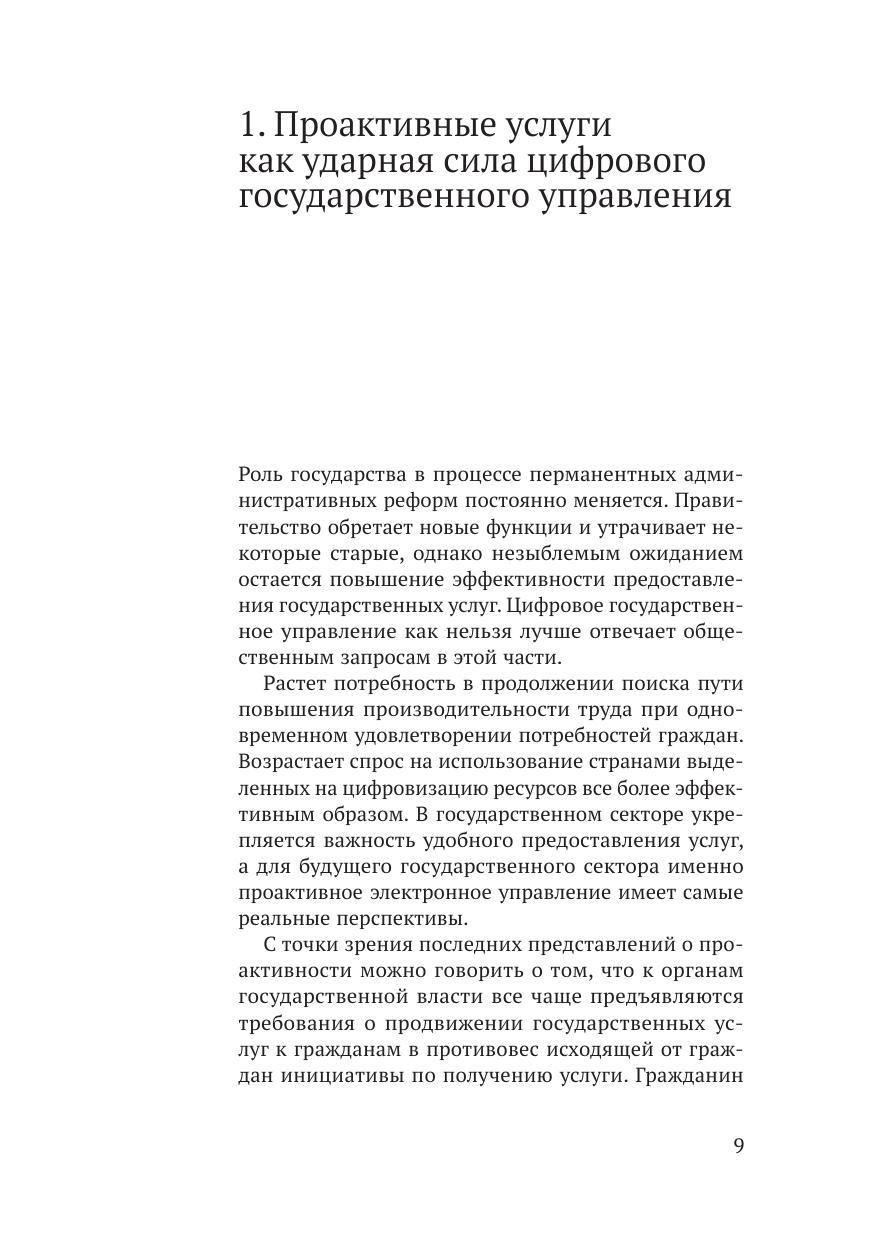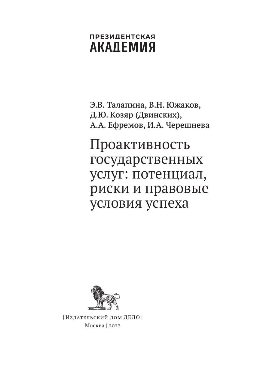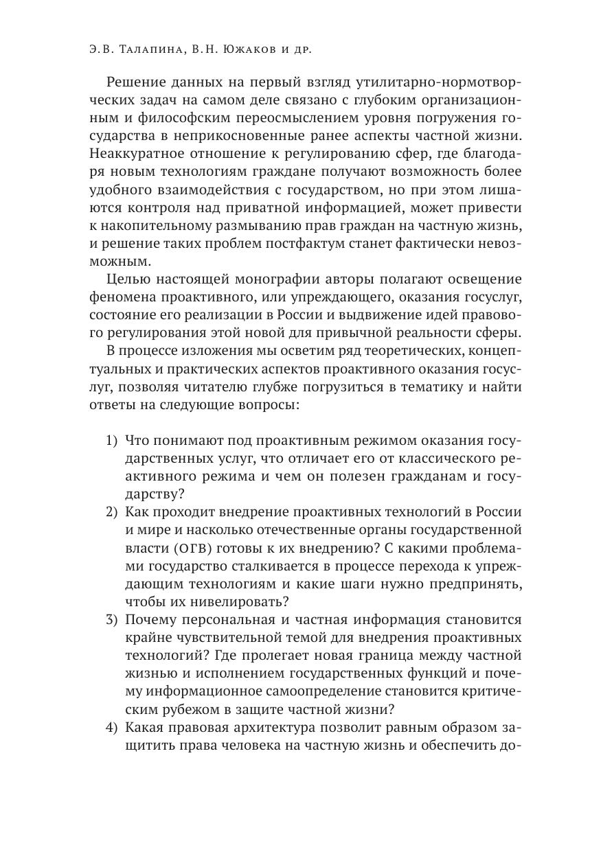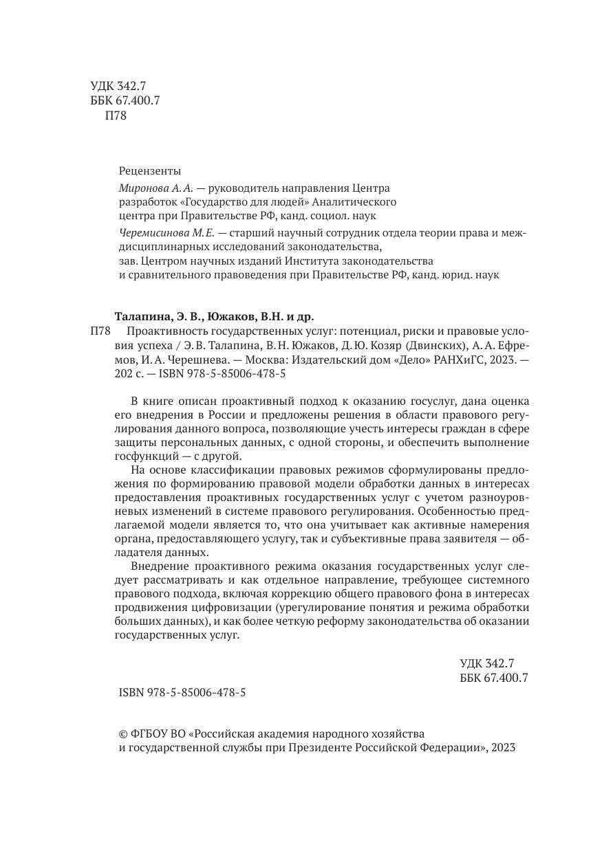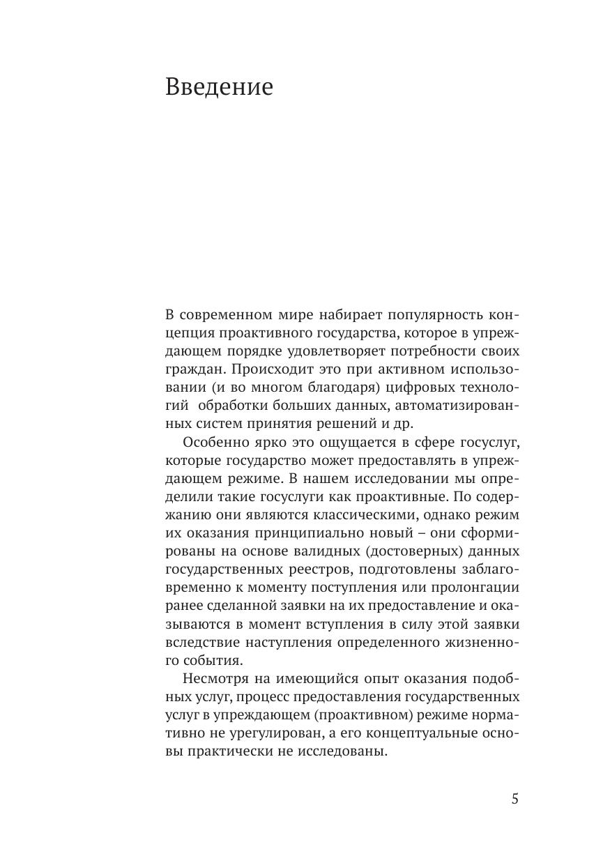 В книге описан проактивный подход к оказанию госуслуг, дана оценка его внедрения в России и предложены решения в области правового регулирования данного вопроса, позволяющие учесть интересы граждан в сфере защиты персональных данных, с одной стороны, и обеспечить выполнение госфункций — c другой. На основе классификации правовых режимов сформулированы предложения по формированию правовой модели обработки данных в интересах предоставления проактивных государственных услуг с учетом разноуровневых изменений в системе правового регулирования. Особенностью предлагаемой модели является то, что она учитывает как активные намерения органа, предоставляющего услугу, так и субъективные права заявителя — обладателя данных. Внедрение проактивного режима оказания государственных услуг следует рассматривать и как отдельное направление, требующее системного правового подхода, включая коррекцию общего правового фона в интересах продвижения цифровизации (урегулирование понятия и режима обработки больших данных), и как более четкую реформу законодательства об оказании государственных услуг.