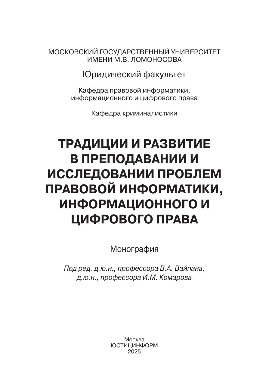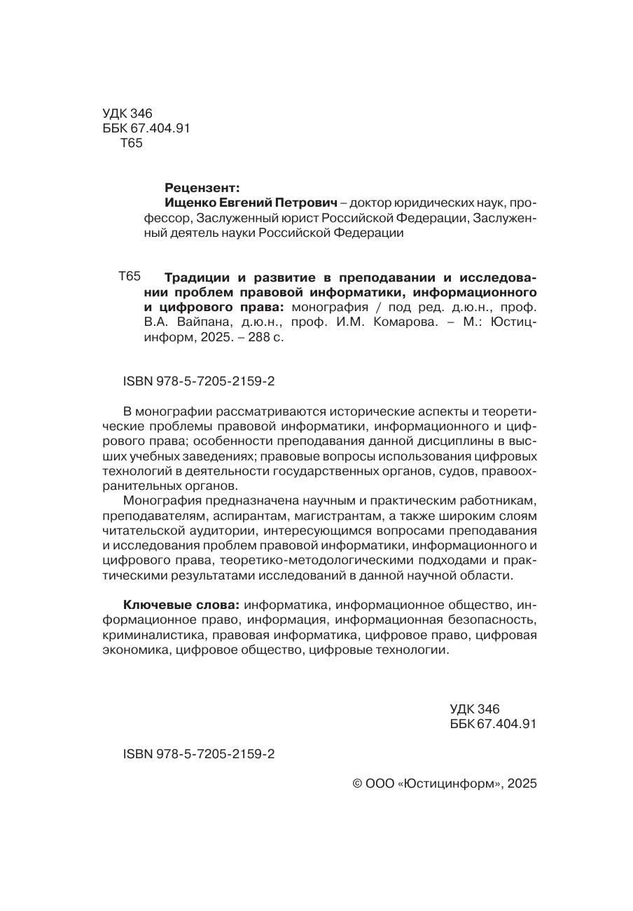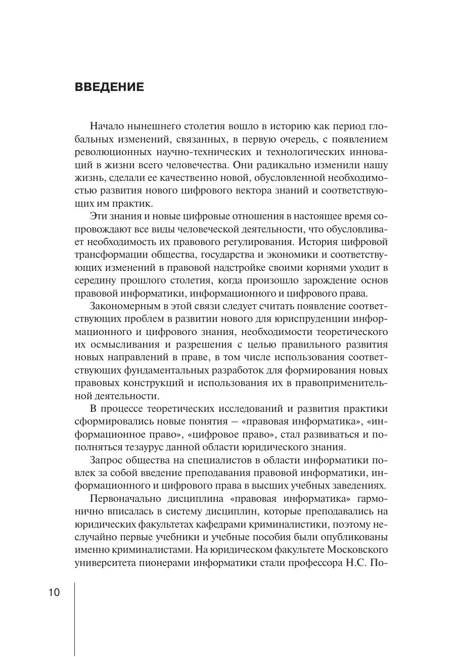 В монографии рассматриваются исторические аспекты и теоретические проблемы правовой информатики, информационного и цифрового права; особенности преподавания данной дисциплины в высших учебных заведениях; правовые вопросы использования цифровых технологий в деятельности государственных органов, судов, правоохранительных органов. Монография предназначена научным и практическим работникам, преподавателям, аспирантам, магистрантам, а также широким слоям читательской аудитории, интересующимся вопросами преподавания и исследования проблем правовой информатики, информационного и цифрового права, теоретико-методологическими подходами и практическими результатами исследований в данной научной области.