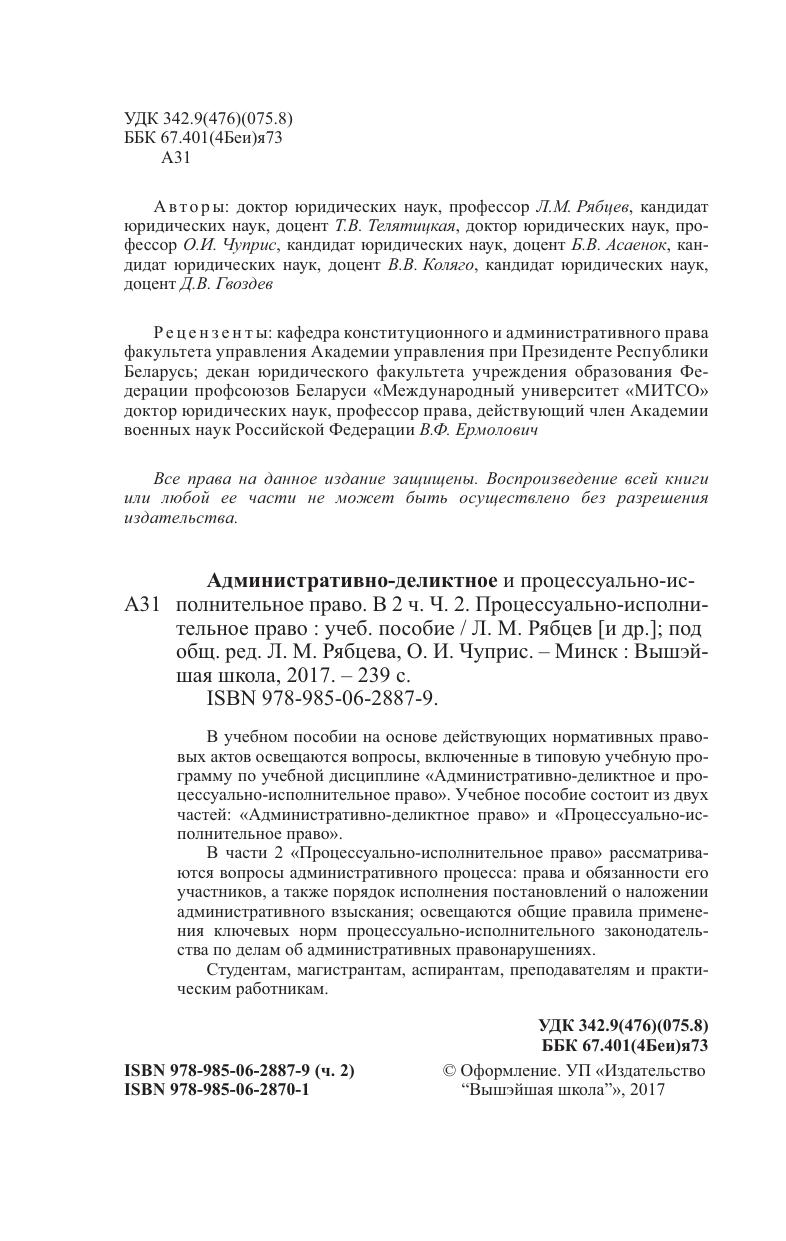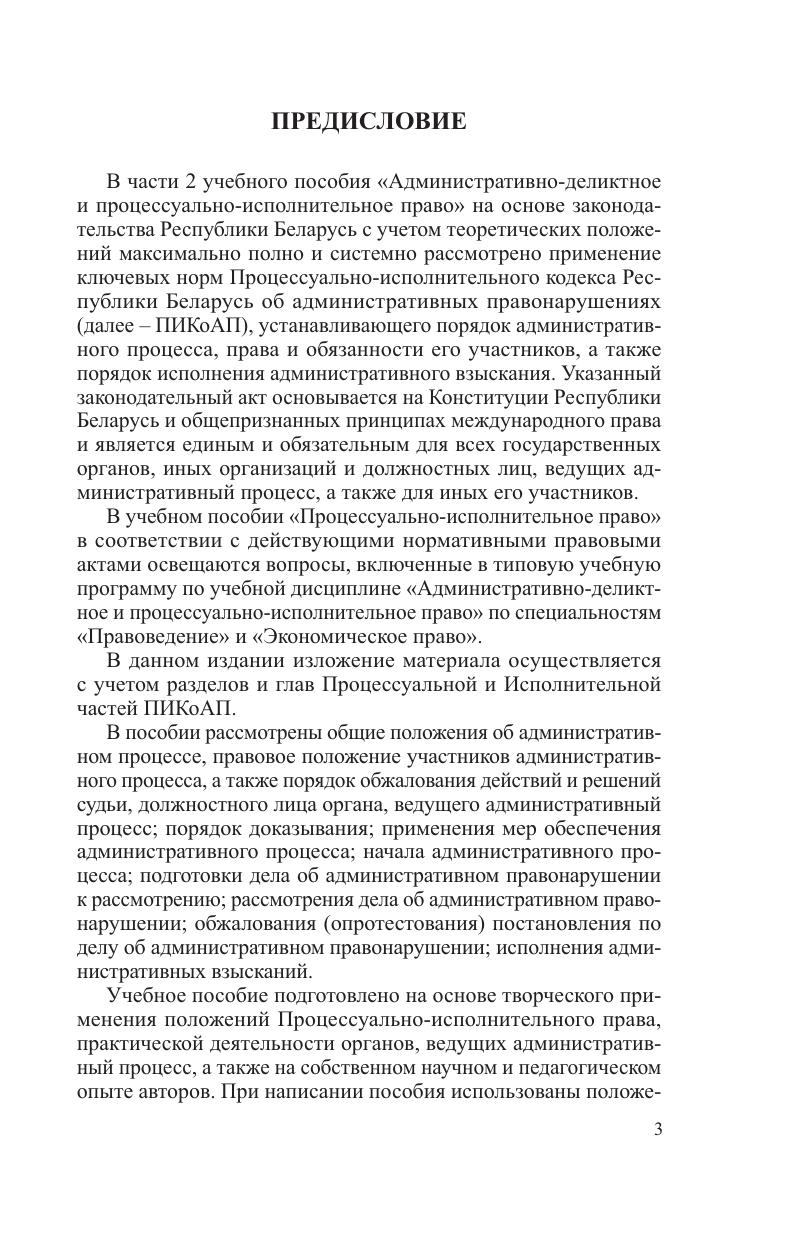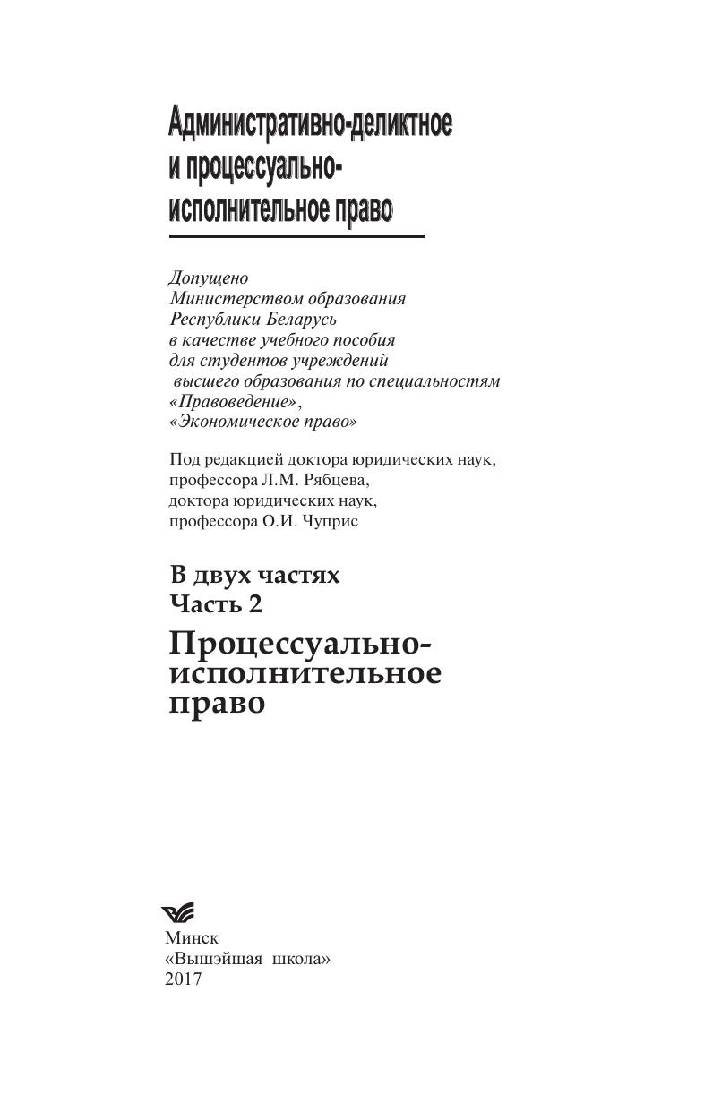 В части 2 «Процессуально-исполнительное право» рассматриваются вопросы административного процесса: права и обязанности его участников, а также порядок исполнения постановлений о наложении административного взыскания; освещаются общие правила применения ключевых норм процессуально-исполнительного законодательства по делам об административных правонарушениях.