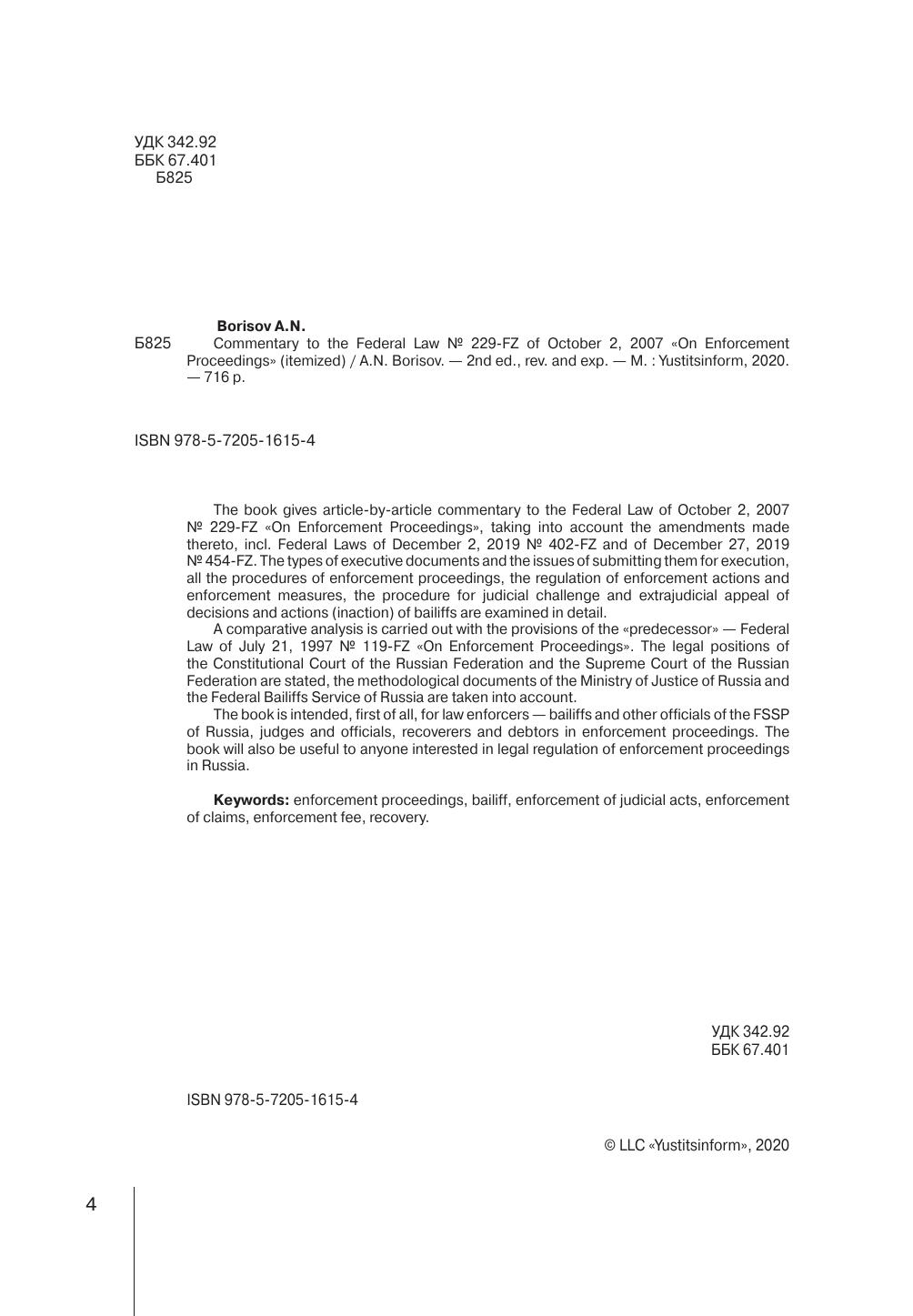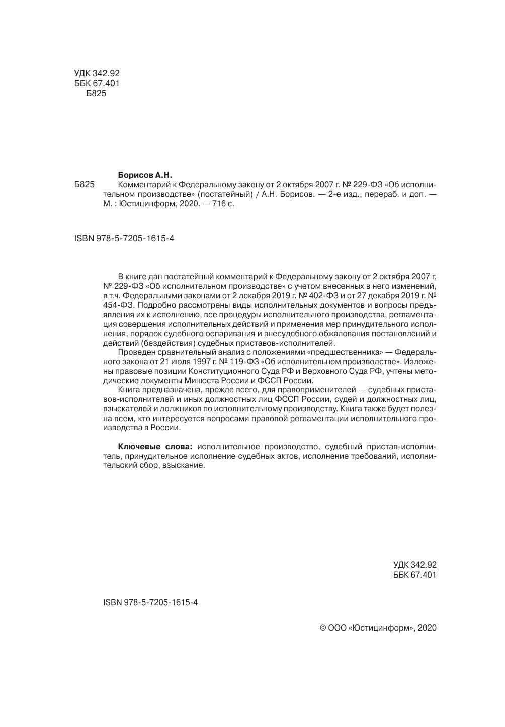 В книге дан постатейный комментарий к Федеральному закону от 2 октября 2007 г. № 229-ФЗ «Об исполнительном производстве» с учетом внесенных в него изменений, в т.ч. Федеральными законами от 2 декабря 2019 г. № 402-ФЗ и от 27 декабря 2019 г. № 454-ФЗ. Подробно рассмотрены виды исполнительных документов и вопросы предъявления их к исполнению, все процедуры исполнительного производства, регламентация совершения исполнительных действий и применения мер принудительного исполнения, порядок судебного оспаривания и внесудебного обжалования постановлений и действий (бездействия) судебных приставов-исполнителей. Проведен сравнительный анализ с положениями «предшественника» — Федерального закона от 21 июля 1997 г. № 119-ФЗ «Об исполнительном производстве». Изложены правовые позиции Конституционного Суда РФ и Верховного Суда РФ, учтены методические документы Минюста России и ФССП России. Книга предназначена, прежде всего, для правоприменителей — судебных приставов-исполнителей и иных должностных лиц ФССП России, судей и должностных лиц, взыскателей и должников по исполнительному производству. Книга также будет полезна всем, кто интересуется вопросами правовой регламентации исполнительного производства в России.