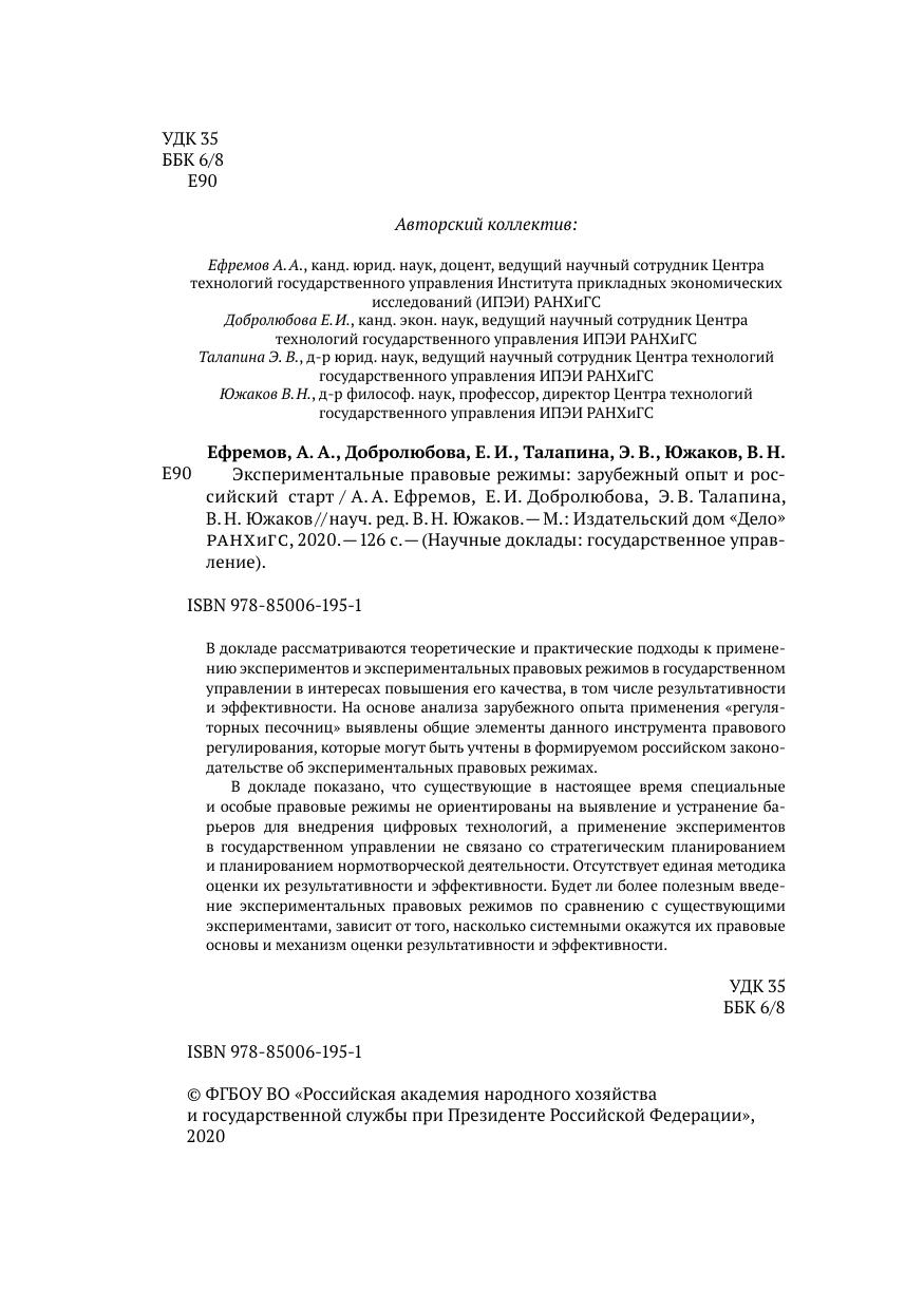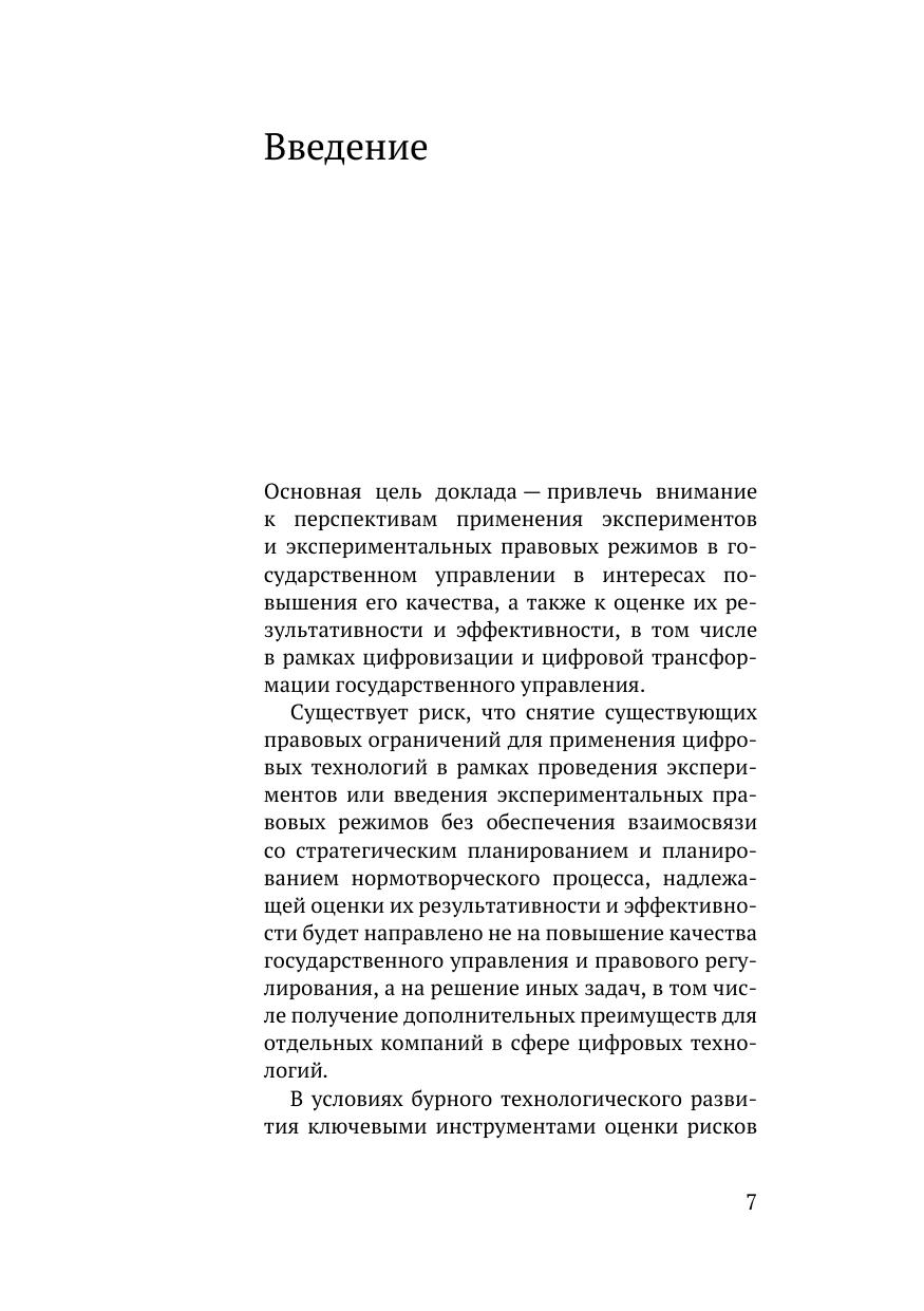 В докладе рассматриваются теоретические и практические подходы к применению экспериментов и экспериментальных правовых режимов в государственном управлении в интересах повышения его качества, в том числе результативности и эффективности. На основе анализа зарубежного опыта применения «регуляторных песочниц» выявлены общие элементы данного инструмента правового регулирования, которые могут быть учтены в формируемом российском законодательстве об экспериментальных правовых режимах. В докладе показано, что существующие в настоящее время специальные и особые правовые режимы не ориентированы на выявление и устранение барьеров для внедрения цифровых технологий, а применение экспериментов в государственном управлении не связано со стратегическим планированием и планированием нормотворческой деятельности. Отсутствует единая методика оценки их результативности и эффективности. Будет ли более полезным введение экспериментальных правовых режимов по сравнению с существующими экспериментами, зависит от того, насколько системными окажутся их правовые основы и механизм оценки результативности и эффективности.