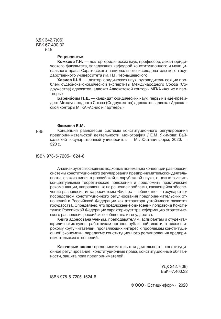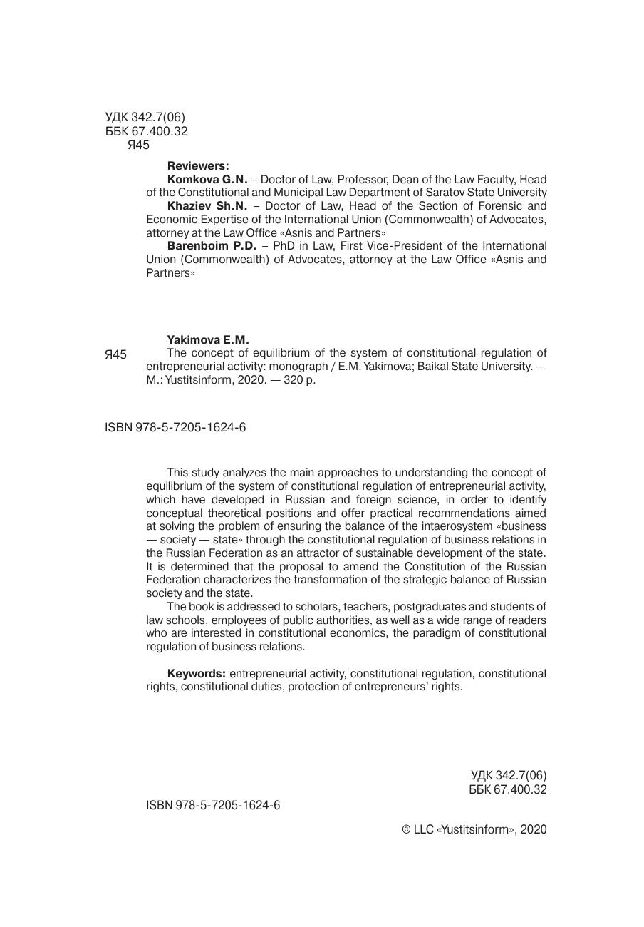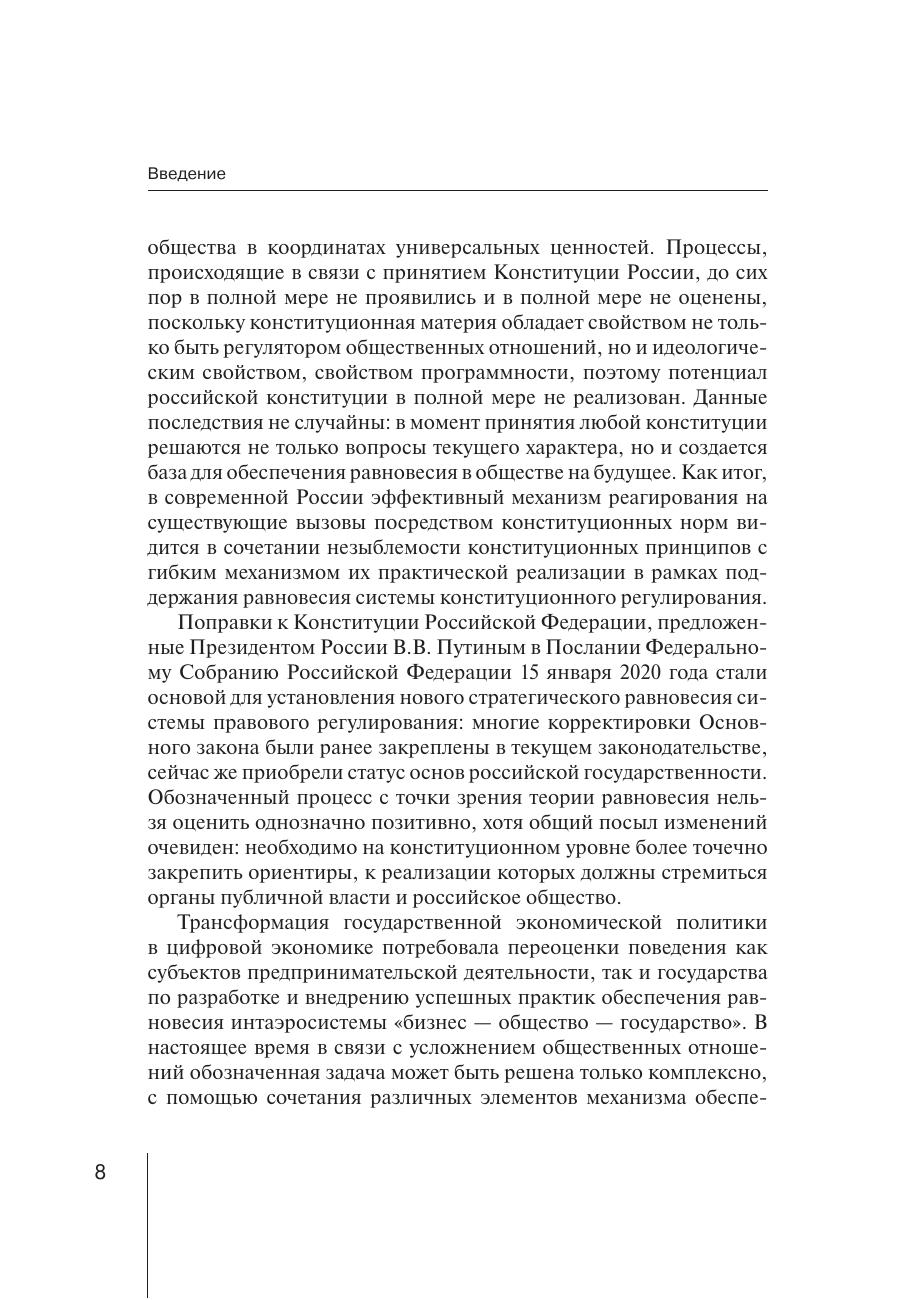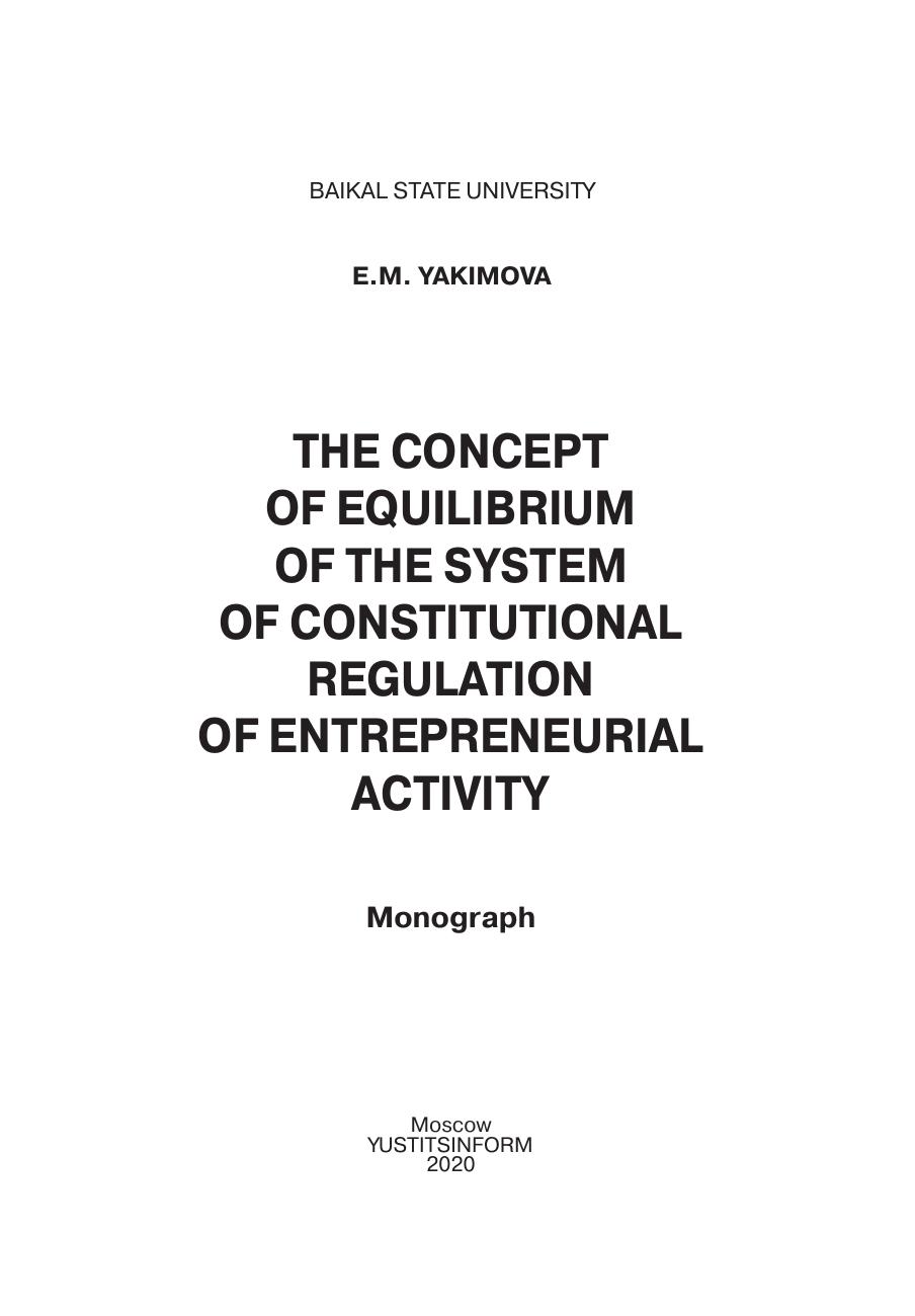 Анализируются основные подходы к пониманию концепции равновесия системы конституционного регулирования предпринимательской деятельности, сложившиеся в российской и зарубежной науке, с целью выявить концептуальные теоретические положения и предложить практические рекомендации, направленные на решение проблемы, касающейся обеспечения равновесия интаэросистемы «бизнес — общество — государство» посредством конституционного регулирования предпринимательских отношений в Российской Федерации как аттрактора устойчивого развития государства. Определено, что предложение о внесении поправок в Конституцию Российской Федерации характеризует трансформацию стратегического равновесия российского общества и государства. Книга адресована ученым, преподавателям, аспирантам и студентам юридических вузов, работникам органов публичной власти, а также широкому кругу читателей, проявляющих интерес к проблемам конституционной экономики, парадигме конституционного регулирования предпринимательских отношений.