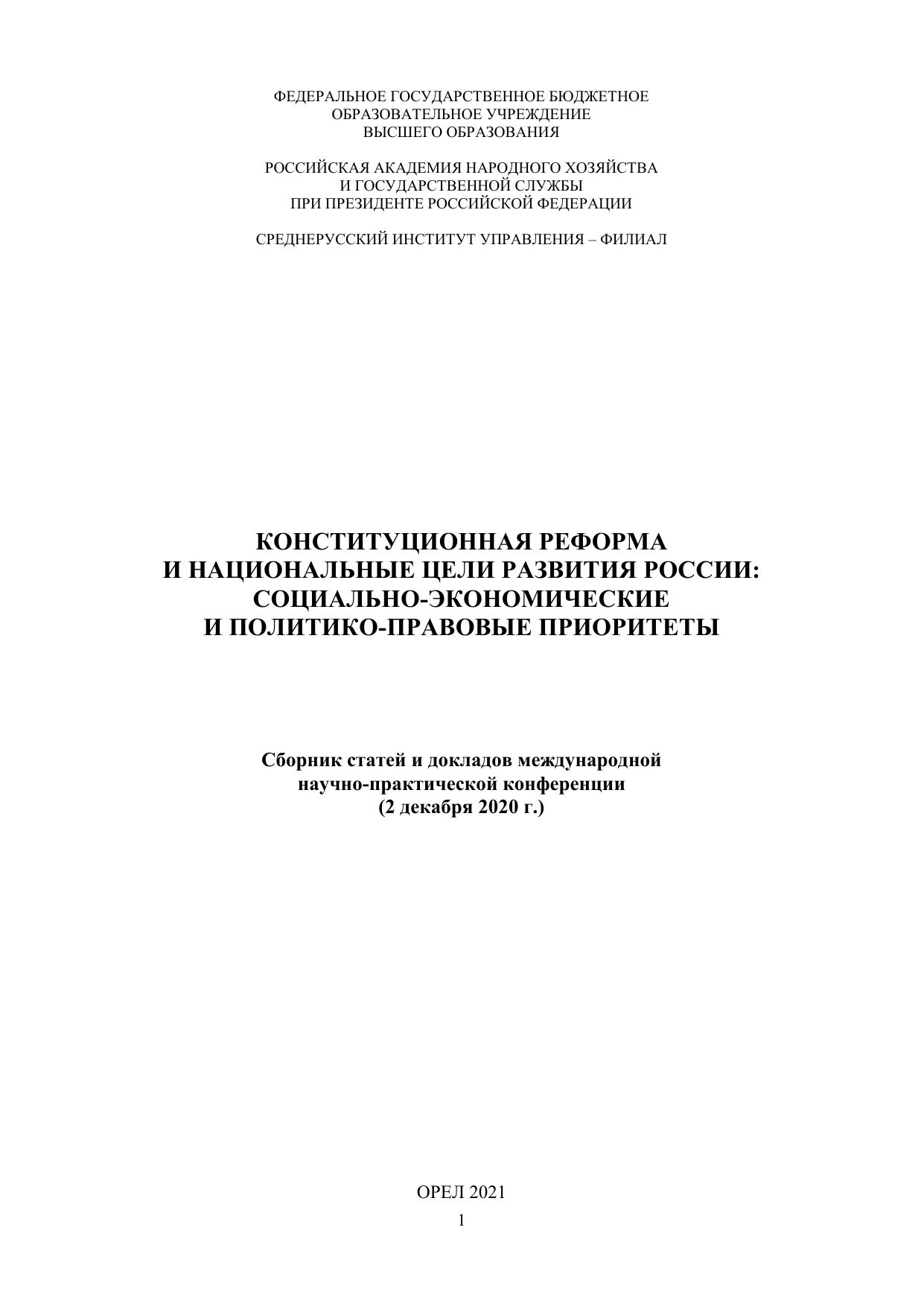 Сборник подготовлен по материалам выступлений участников международной научнопрактической конференции на тему: «Конституционная реформа и национальные цели развития России: социально-экономические и политико-правовые приоритеты» (2 декабря 2020 г.), организованной Среднерусским институтом управления – филиалом РАНХиГС. В сборнике представлены результаты исследований профессорско-преподавательского состава, аспирантов и студентов, посвященных анализу процесса конституционной реформы и особенностей достижения национальных целей развития России. Материалы публикуются в авторской редакции.
