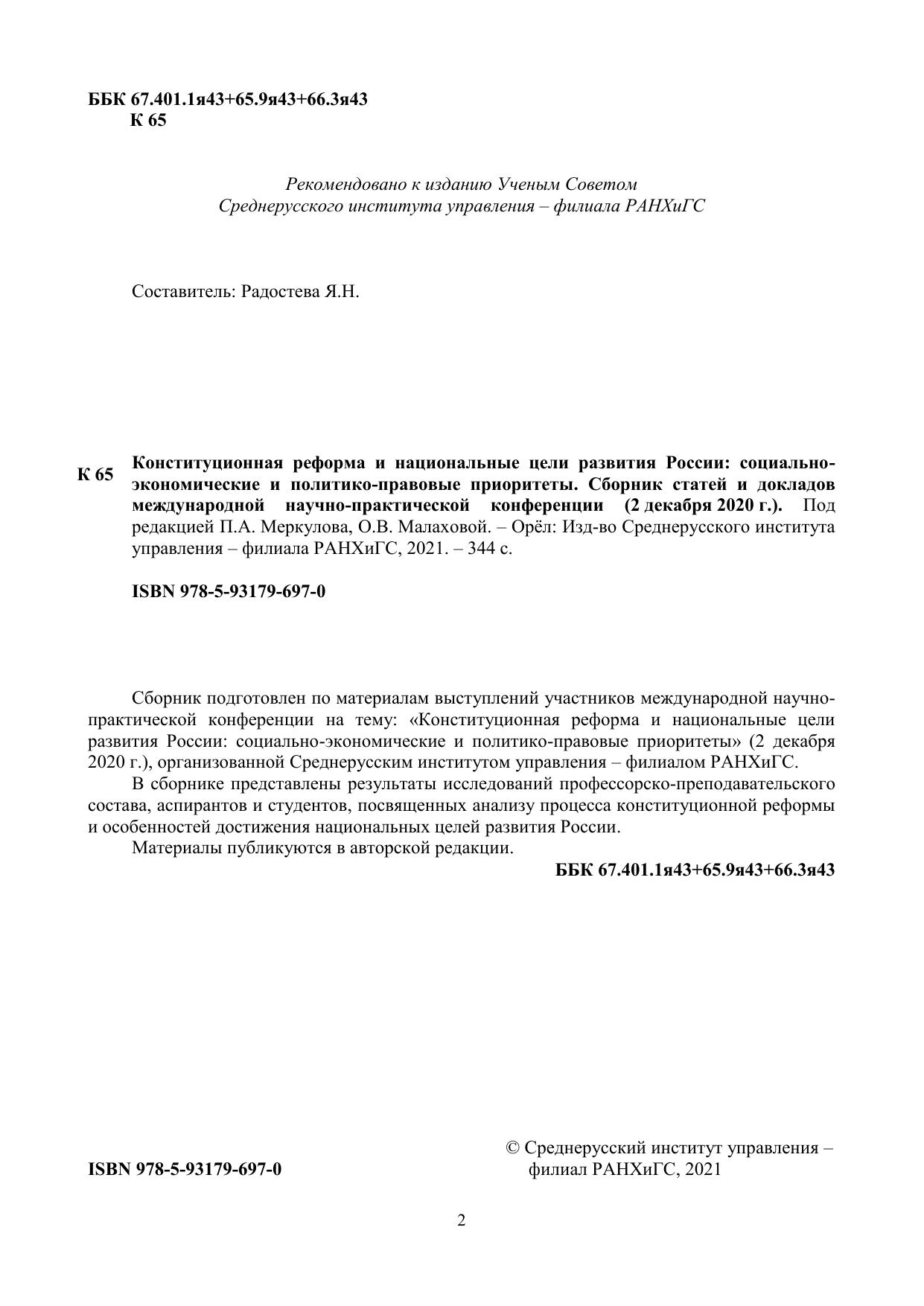 Конституционная реформа и национальные цели развития России: социально-экономические и политико-правовые приоритеты. Сборник статей и докладов международной научно-практической конференции (2 декабря 2020 г.).