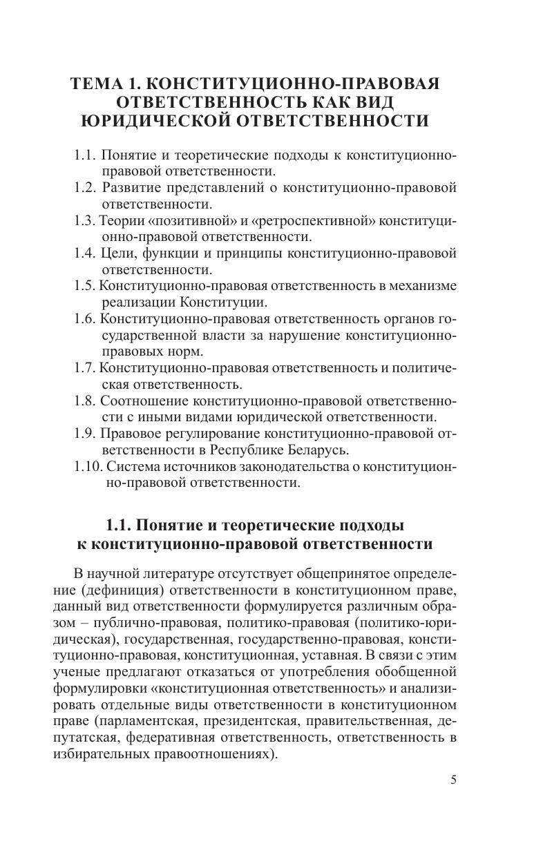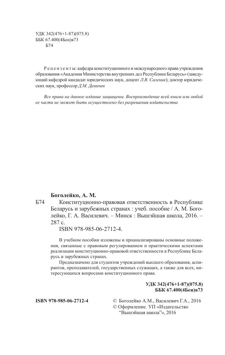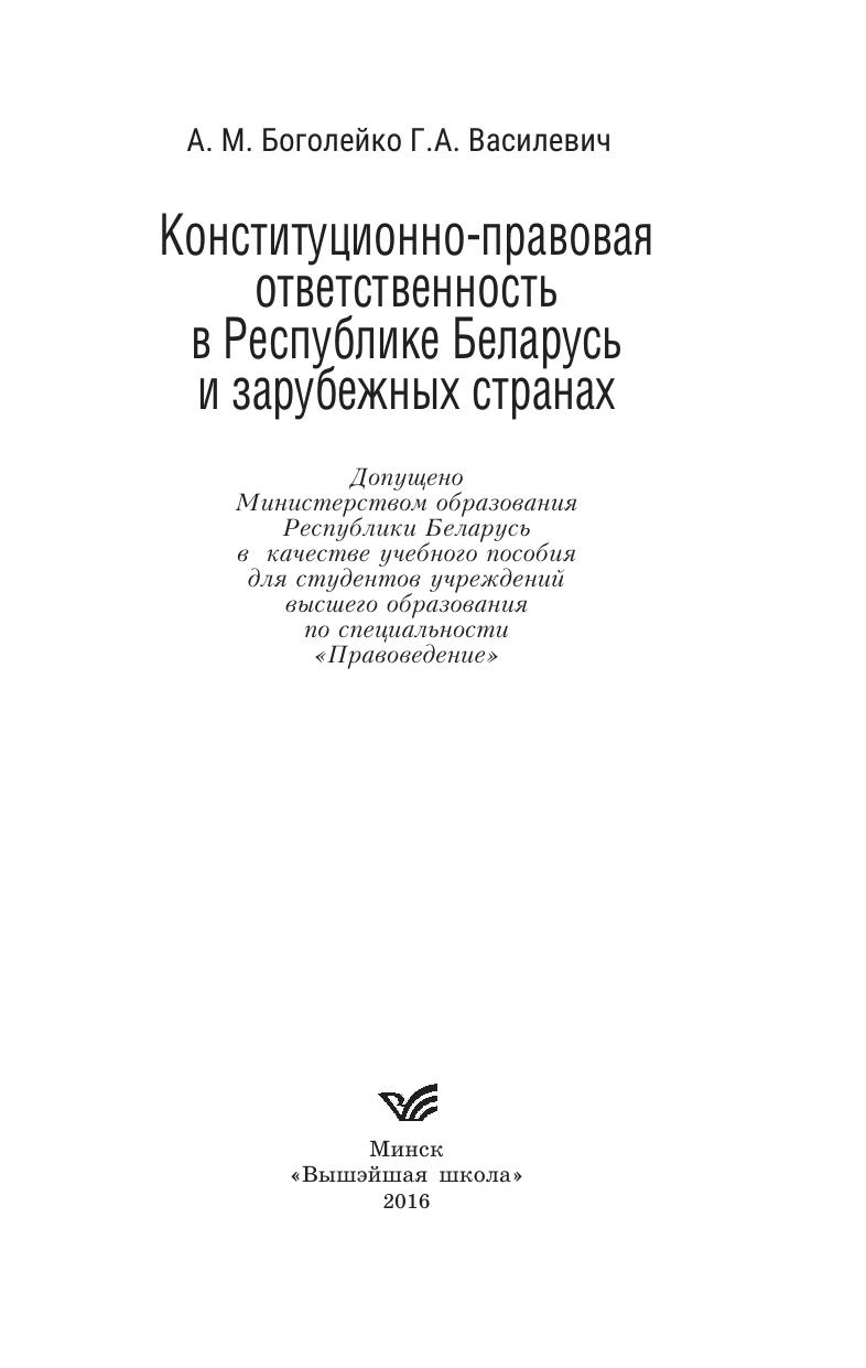 В учебном пособии изложены и проанализированы основные положения, связанные с правовым регулированием и практическими аспектами реализации конституционно-правовой ответственности в Республике Беларусь и зарубежных странах.