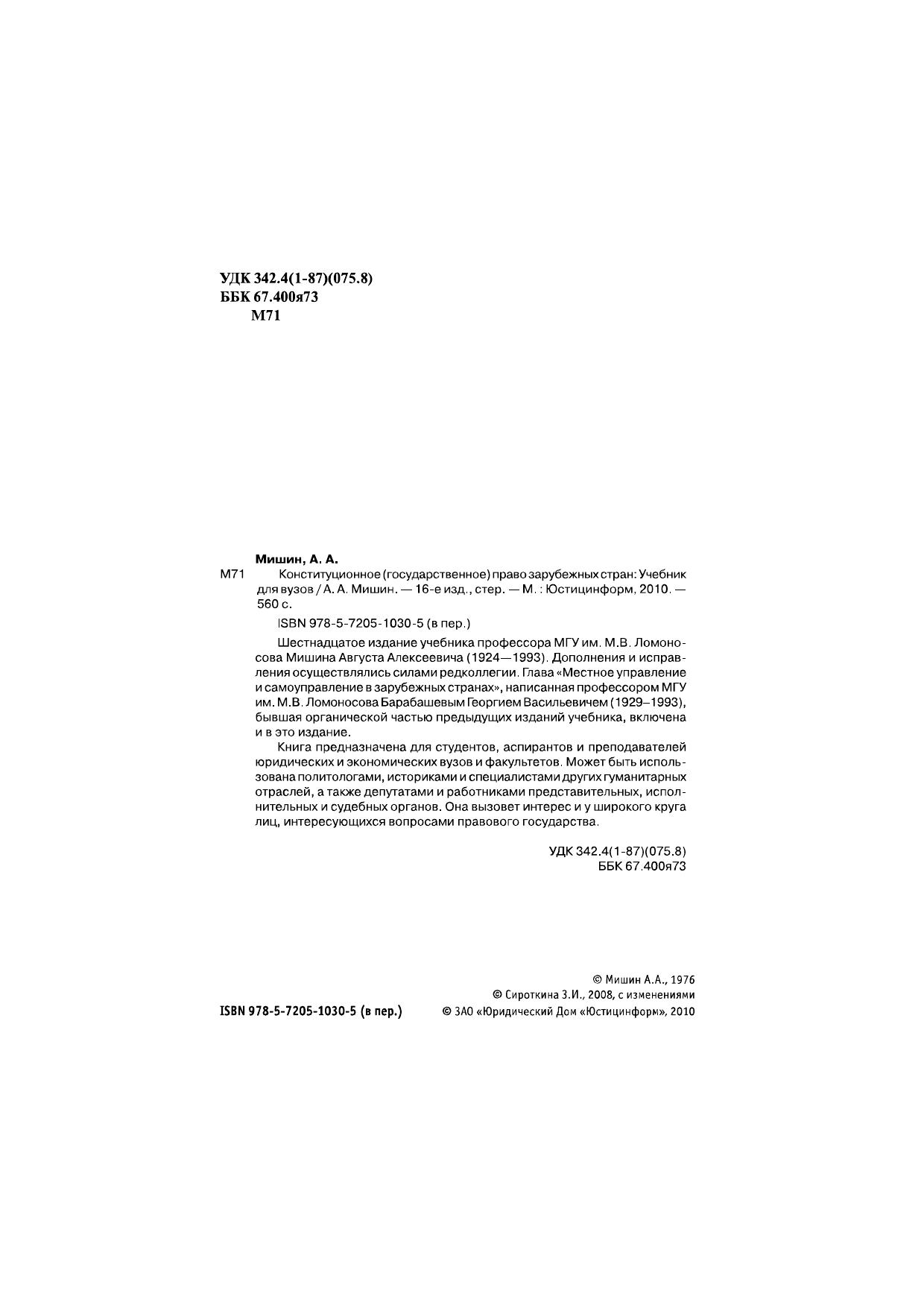 Шестнадцатое издание учебника профессора МГУ им. М.В. Ломоносова Мишина Августа Алексеевича (1924—1993). Дополнения и исправления осуществлялись силами редколлегии. Глава «Местное управление и самоуправление в зарубежных странах», написанная профессором МГУ им. М.В. Ломоносова Барабашевым Георгием Васильевичем (1929–1993), бывшая органической частью предыдущих изданий учебника, включена и в это издание.Книга предназначена для студентов, аспирантов и преподавателей юридических и экономических вузов и факультетов. Может быть использована политологами, историками и специалистами других гуманитарных отраслей, а также депутатами и работниками представительных, исполнительных и судебных органов. Она вызовет интерес и у широкого кругалиц, интересующихся вопросами правового государства.