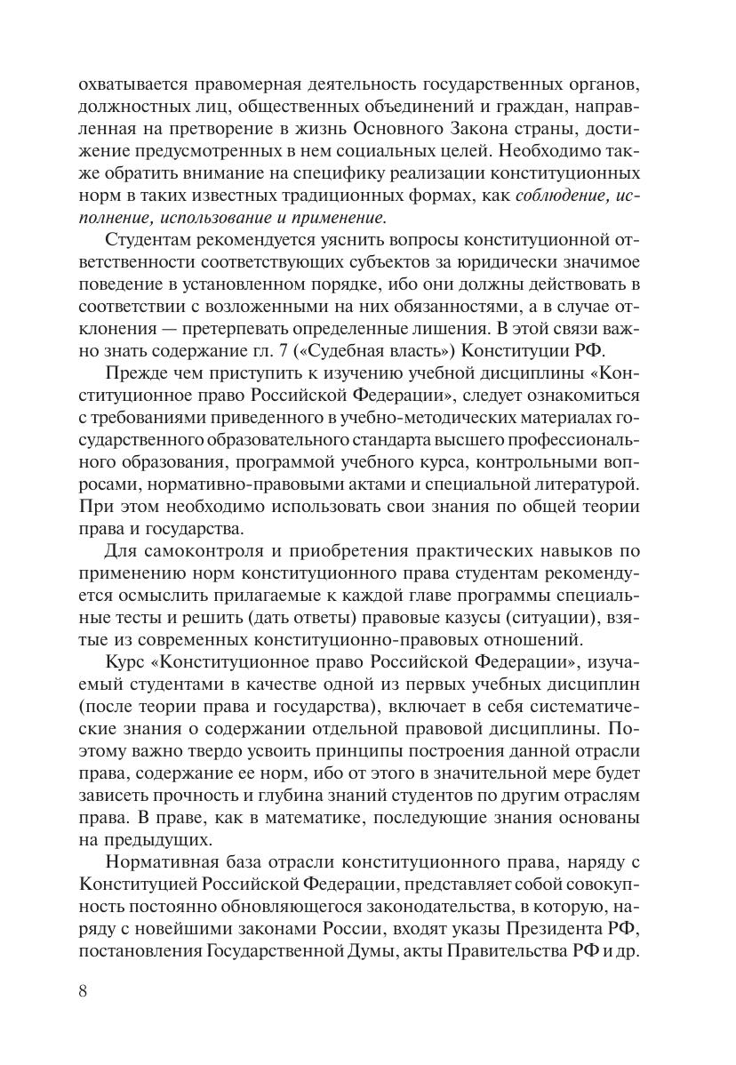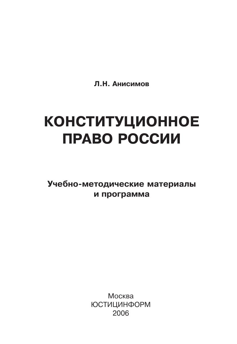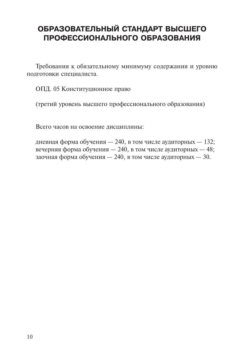 Издание представляет собой учебно-методический комплекс, предназначенный для изучения учебной дисциплины «Конституционное право Российской Федерации». В нем дается толкование основных дидактических единиц государственного образовательного стандарта высшего профессионального образования, определены требования к знанию и умению обучающихся. В Программе представлен учебно-тематический план изучения дисциплины, раскрывается ее содержание. К ней прилагаются списки основных нормативных правовых актов и специальной литературы (по темам), а для самопроверки знаний — специальные тесты. В качестве дополнительного справочного материала дается развернутый глоссарий (толкование основных терминов конституционного права). Издание предназначено для студентов, аспирантов, соискателей и преподавателей юридических вузов и структурных подразделений всех форм обучения, в том числе дистанционной.