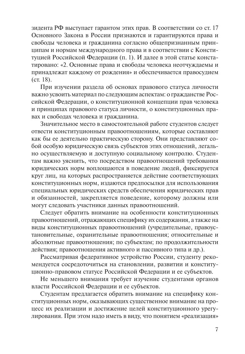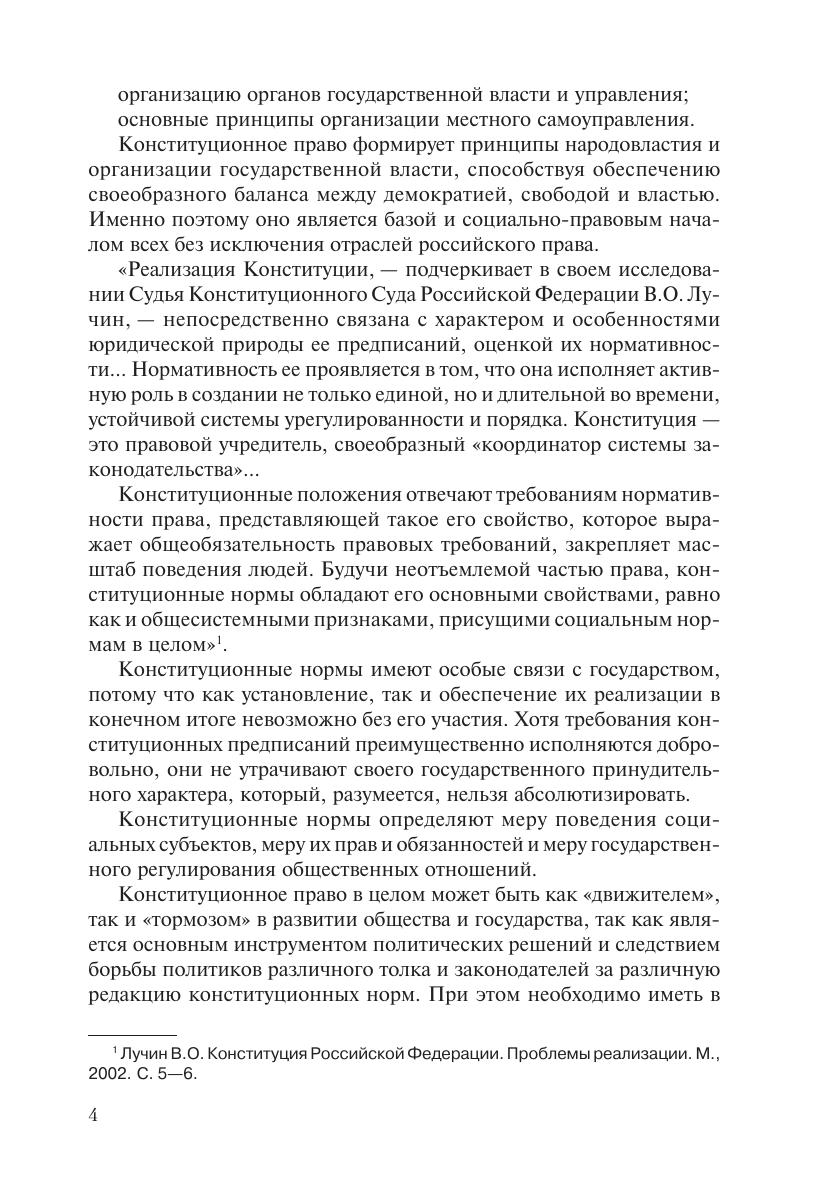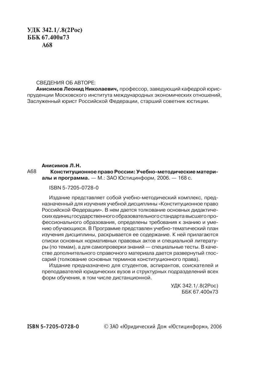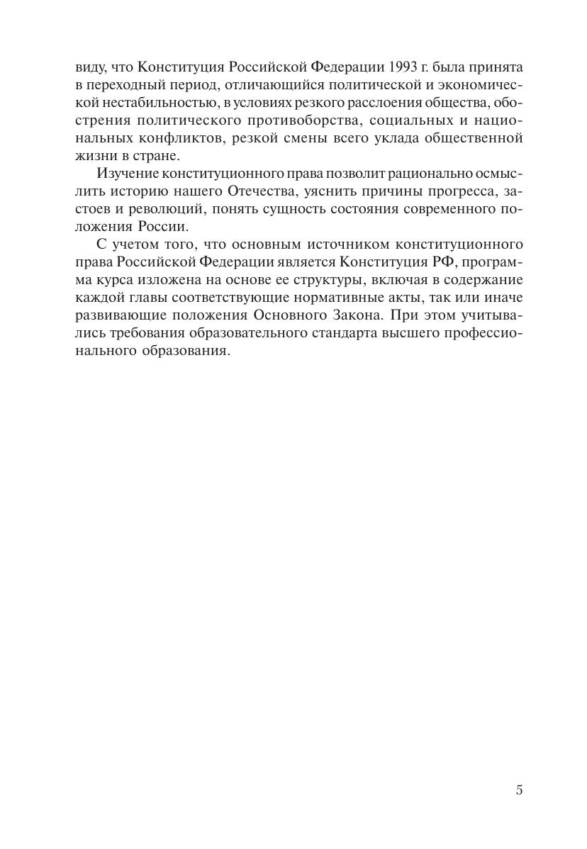 Издание представляет собой учебно-методический комплекс, предназначенный для изучения учебной дисциплины «Конституционное право Российской Федерации». В нем дается толкование основных дидактических единиц государственного образовательного стандарта высшего профессионального образования, определены требования к знанию и умению обучающихся. В Программе представлен учебно-тематический план изучения дисциплины, раскрывается ее содержание. К ней прилагаются списки основных нормативных правовых актов и специальной литературы (по темам), а для самопроверки знаний — специальные тесты. В качестве дополнительного справочного материала дается развернутый глоссарий (толкование основных терминов конституционного права). Издание предназначено для студентов, аспирантов, соискателей и преподавателей юридических вузов и структурных подразделений всех форм обучения, в том числе дистанционной.