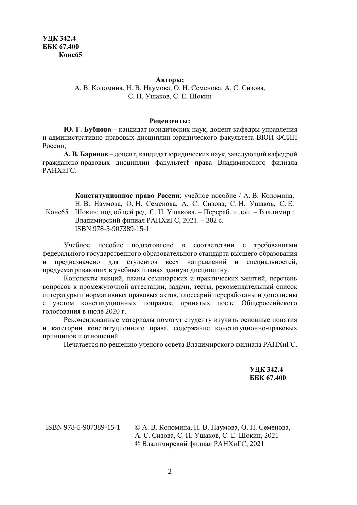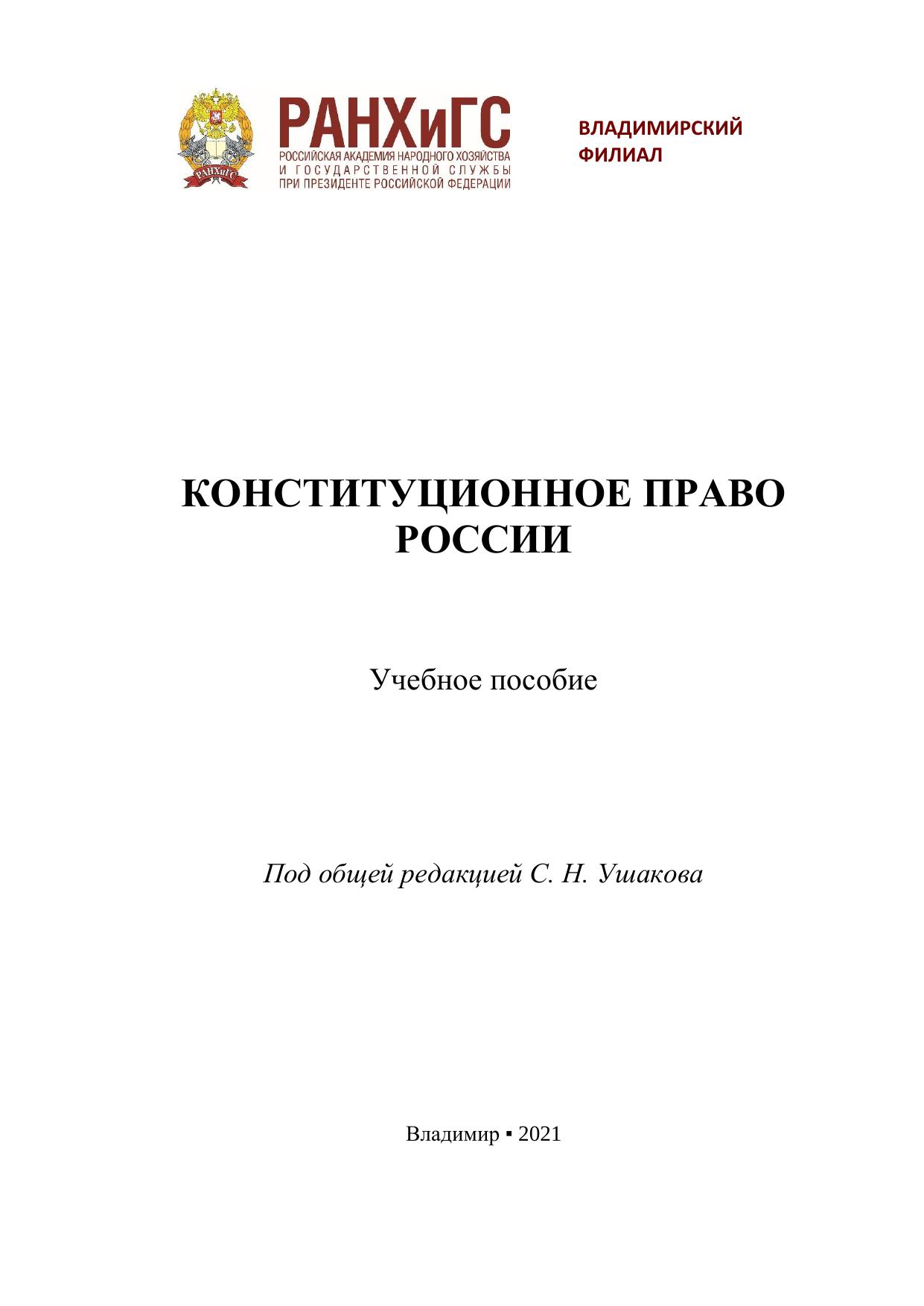 Учебное пособие подготовлено в соответствии с требованиями федерального государственного образовательного стандарта высшего образования и предназначено для студентов всех направлений и специальностей, предусматривающих в учебных планах данную дисциплину. Конспекты лекций, планы семинарских и практических занятий, перечень вопросов к промежуточной аттестации, задачи, тесты, рекомендательный список литературы и нормативных правовых актов, глоссарий переработаны и дополнены с учетом конституционных поправок, принятых после Общероссийского голосования в июле 2020 г. Рекомендованные материалы помогут студенту изучить основные понятия и категории конституционного права, содержание конституционно-правовых принципов и отношений. Печатается по решению ученого совета Владимирского филиала РАНХиГС.