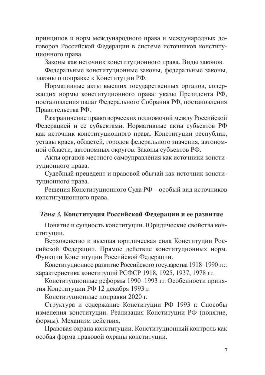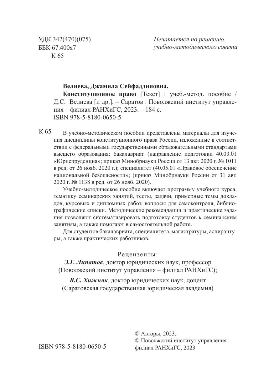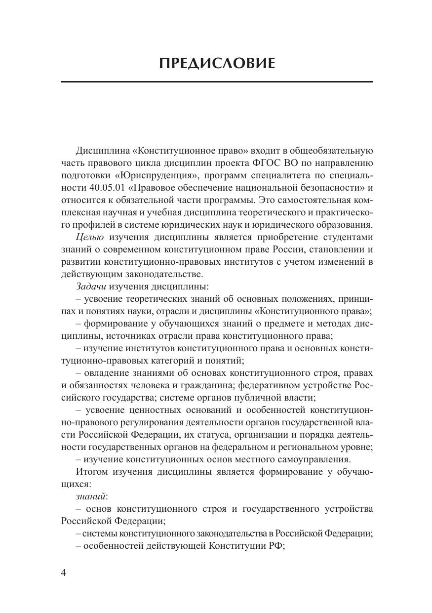 В учебно-методическом пособии представлены материалы для изучения дисциплины конституционного права России, изложенные в соответствии с федеральными государственными образовательными стандартами высшего образования: бакалавриат (направление подготовки 40.03.01 «Юриспруденция»; приказ Минобрнауки России от 13 авг. 2020 г. № 1011 в ред. от 26 нояб. 2020 г.); специалитет (40.05.01 «Правовое обеспечение национальной безопасности»; (приказ Минобрнауки России от 31 авг. 2020 г. № 1138 в ред. от 26 нояб. 2020). Учебно-методическое пособие включает программу учебного курса, тематику семинарских занятий, тесты, задачи, примерные темы докладов, курсовых и дипломных работ, вопросы для самоконтроля, библиографические списки. Методические рекомендации и практические задания позволяют систематизировать подготовку студентов к семинарским занятиям, а также помогают в самостоятельной работе. Для студентов бакалавриата, специалитета, магистратуры, аспирантуры, а также практических работников.