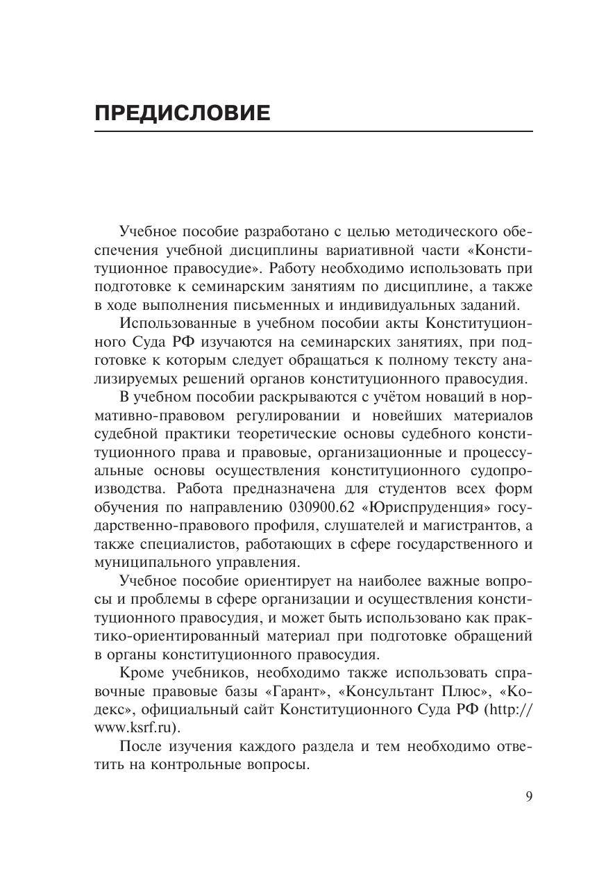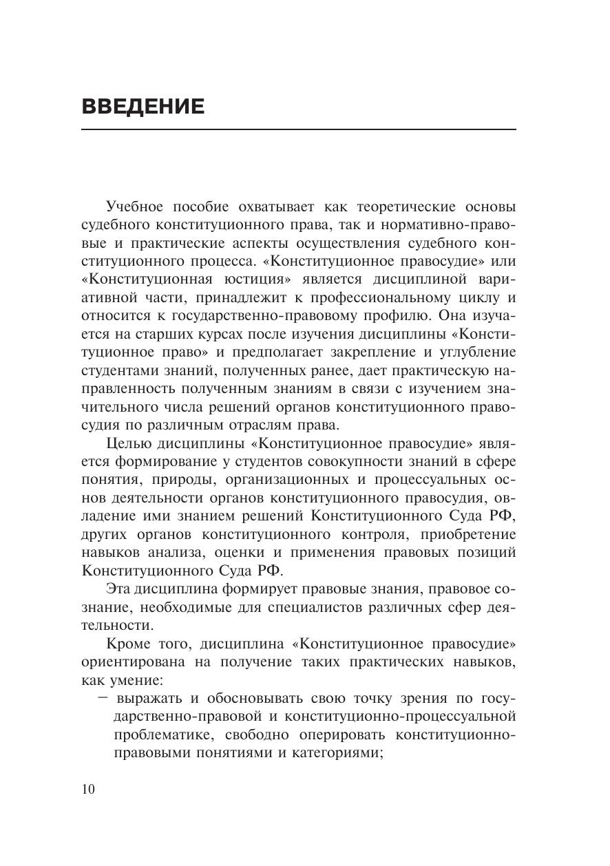 Учебное пособие разработано с целью методического обеспечения учебной дисциплины вариативной части «Конституционное правосудие». В работе раскрываются с учётом новаций в нормативно-правовом регулировании и новейших материалов судебной практики теоретические основы судебного конституционного права и правовые, организационные и процессуальные основы осуществления конституционного судопроизводства. Учебное пособие предназначено: для студентов всех форм обучения по направлению «Юриспруденция» государственно-правового профиля, слушателей и магистрантов, а также специалистов, работающих в сфере государственного и муниципального управления.