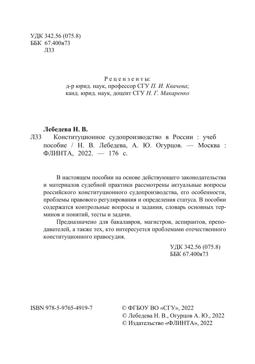 В настоящем пособии на основе действующего законодательства и материалов судебной практики рассмотрены актуальные вопросы российского конституционного судопроизводства, его особенности, проблемы правового регулирования и определения статуса. В пособии содержатся контрольные вопросы и задания, словарь основных терминов и понятий, тесты и задачи.