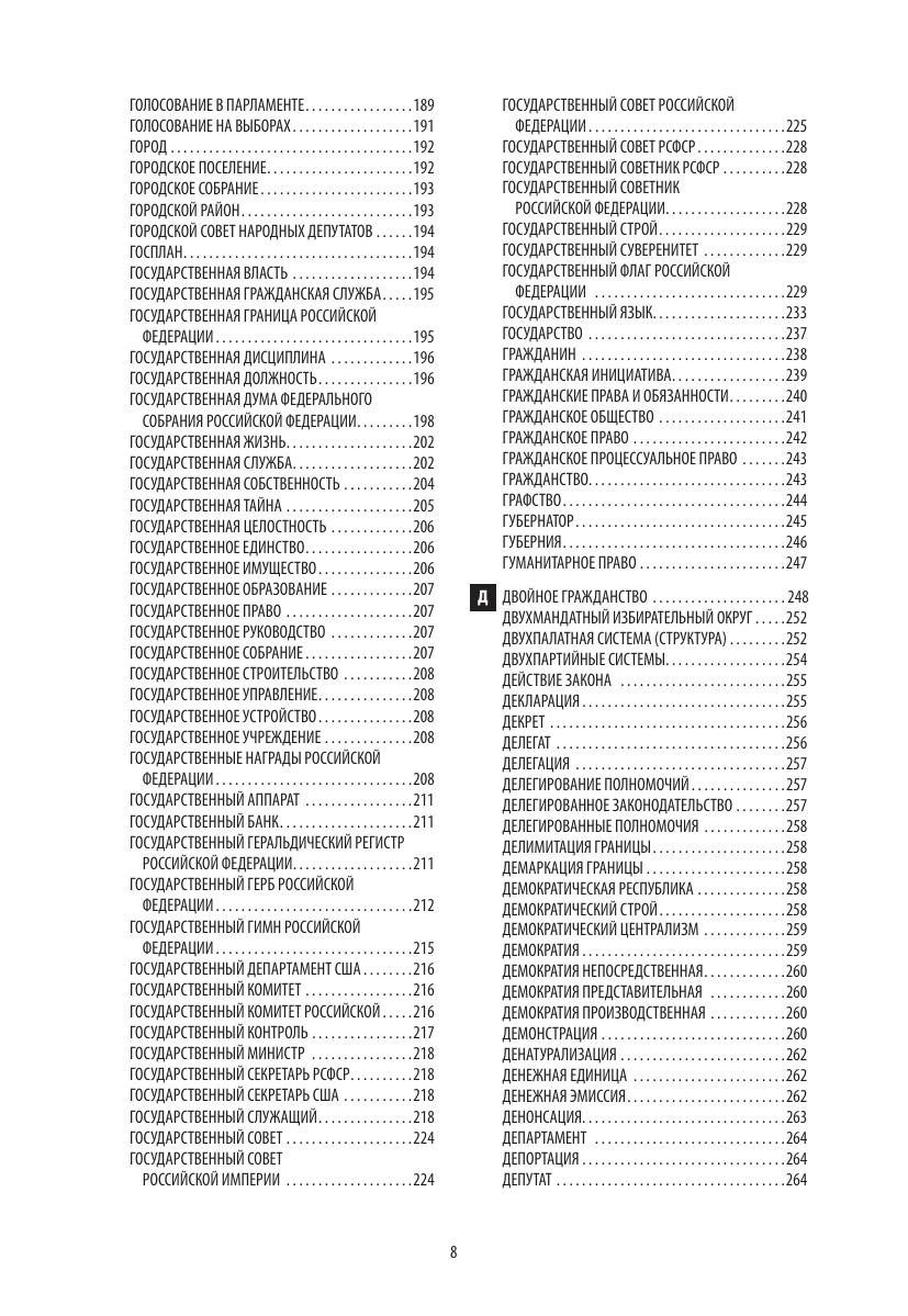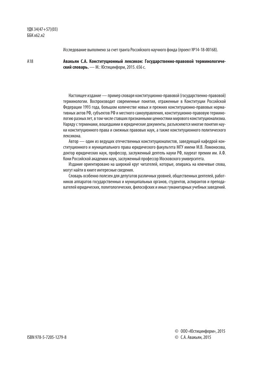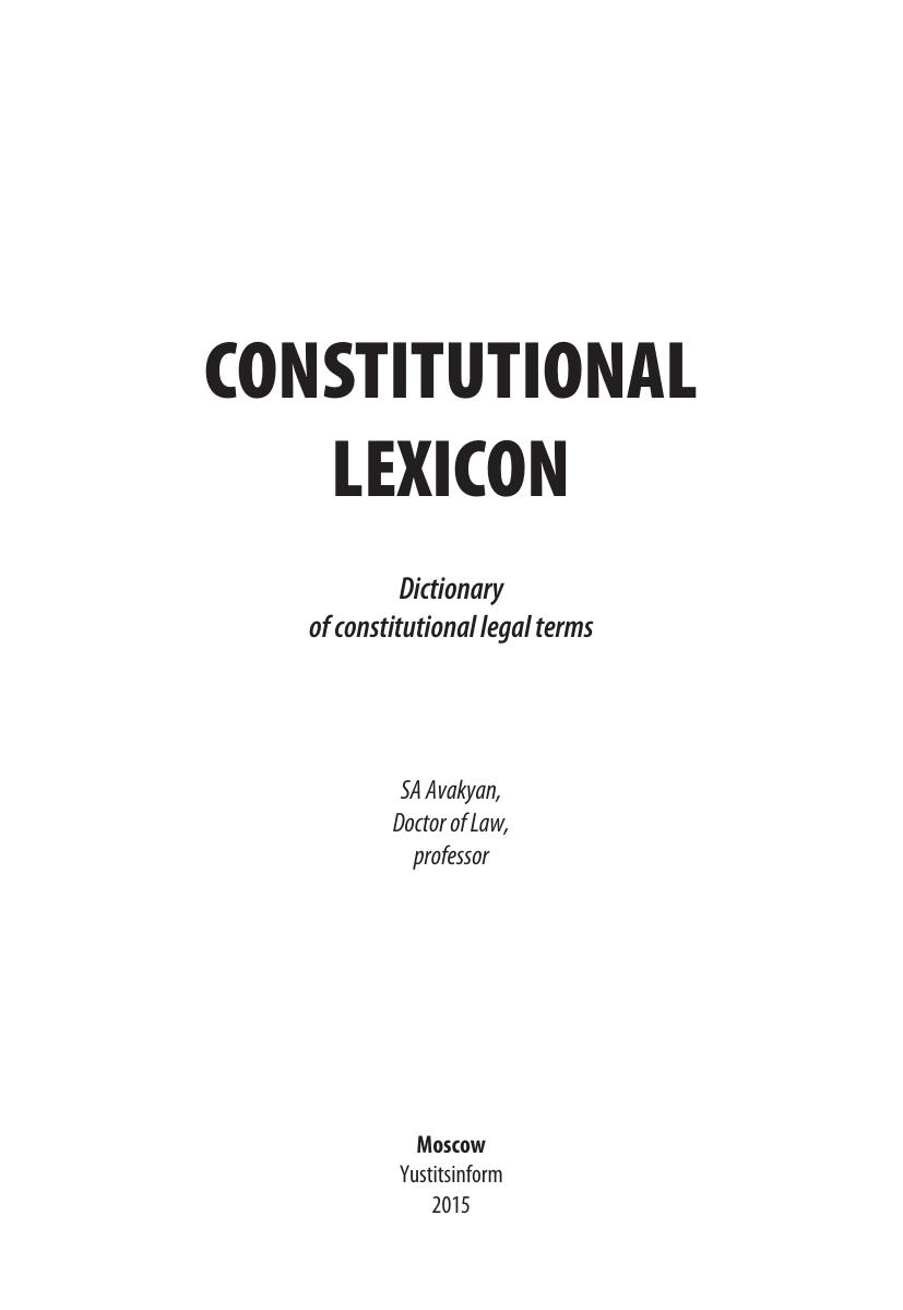 Настоящее издание — пример словаря конституционно-правовой (государственно-правовой) терминологии. Воспроизводит современные понятия, отраженные в Конституции Российской Федерации 1993 года, большом количестве новых и прежних конституционно-правовых нормативных актов РФ, субъектов РФ и местного самоуправления, конституционно-правовую терминологию разных лет, в том числе ставших признанными ценностями мирового конституционализма. Наряду с терминами, вошедшими в юридические документы, разъясняются многие понятия науки конституционного права и смежных правовых наук, а также конституционного политического лексикона.