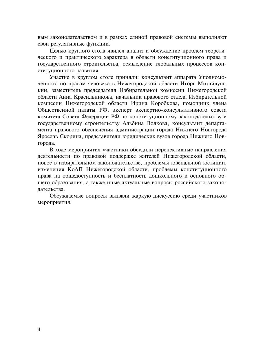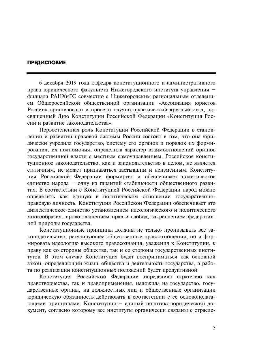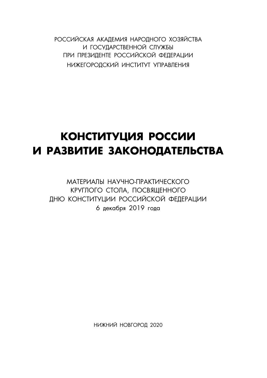 Сборник издан по материалам научно-практического круг-лого стола с участием работников аппарата органов государ-ственной власти Нижегородской области на тему «Конституция России и развитие законодательства», прошедшего 6 декабря 2019 года в Нижегородском институте управления. Сборник ориентирован на профессорско-преподава-тельский состав, студентов, аспирантов, практических работни-ков органов государственной власти и органов местного само-управления, а также тех, кто интересуется современными про-блемами конституционного права.