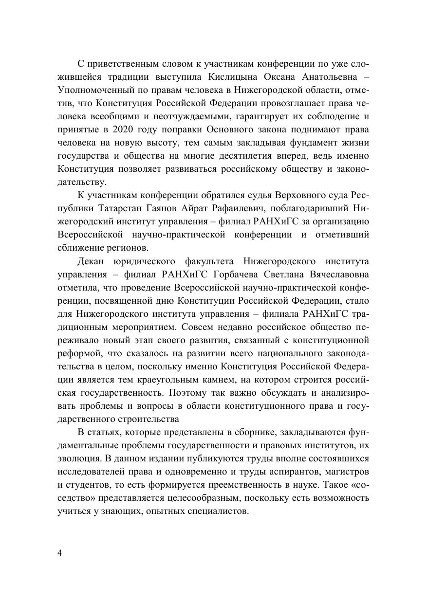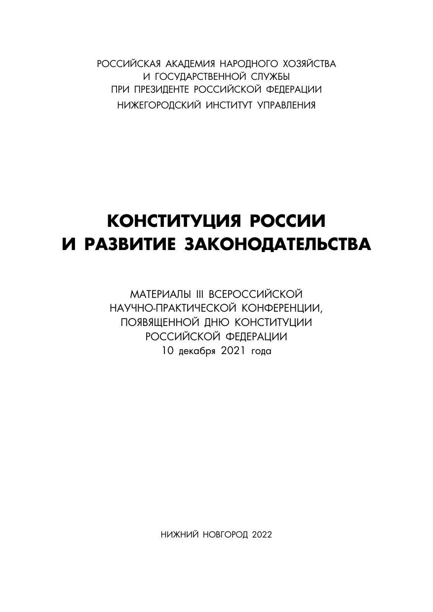 Сборник издан по материалам III Всероссийской научнопрактической конференции на тему «Конституция России и разв итие законодательства», прошедшей 10 декабря 2021 года на юридическом факультете Нижегородского института управления – филиала РАНХиГС. Сборник ориентирован на профессорско-преподавательский состав, аспирантов, практических работников органов государственной власти и органов местного самоуправления, а также тех, кто интересуется современными проблемами конституционного права.