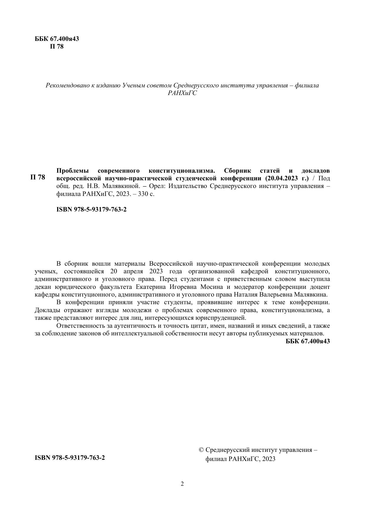 В сборник вошли материалы Всероссийской научно-практической конференции молодых ученых, состоявшейся 20 апреля 2023 года организованной кафедрой конституционного, административного и уголовного права. Перед студентами с приветственным словом выступила декан юридического факультета Екатерина Игоревна Мосина и модератор конференции доцент кафедры конституционного, административного и уголовного права Наталия Валерьевна Малявкина. В конференции приняли участие студенты, проявившие интерес к теме конференции. Доклады отражают взгляды молодежи о проблемах современного права, конституционализма, а также представляют интерес для лиц, интересующихся юриспруденцией. Ответственность за аутентичность и точность цитат, имен, названий и иных сведений, а также за соблюдение законов об интеллектуальной собственности несут авторы публикуемых материалов.